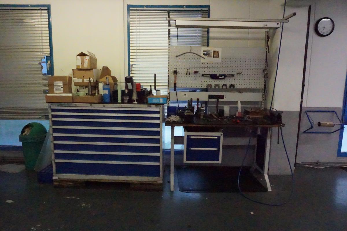Fabrikat: GARANT, ca. 1.500 x 800 x 1.000 mm, 8 Auszüge, Inhalt: CNC Werkzeugzubehör/-Ersatzteile, Werktisch, höhenverstellbar, Lochwand, Schraubstock, Fabr. MATADOR, 2x Auszüge, Inhalt: CNC-Werkzeughalter