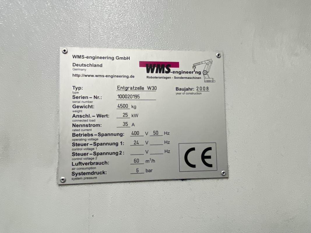 Fabrikat: WMS, Typ: W30, Baujahr: 2008, Ma.-Nr.: 100020195, Steuerung, Fabr. Siemens, 6-Achs-Roboter, Fabr. ABB, Typ IRD 4400, S.-Nr. 44-52556, Steuerung M20004, ohne Programmierterminal