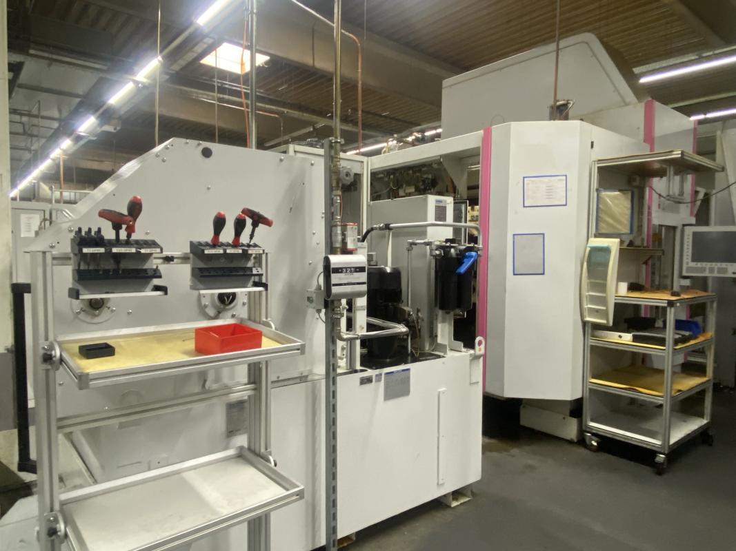 Fabrikat: SW, Typ: BA 422, Baujahr: 2015, Ma.-Nr.: 2380094, Steuerung, Fabr. Siemens, 4 Spindeln, Verfahrweg X/Y/Z 400 x 500 x 425 mm, Drehzahl max. 17.500 U/min, Wechseltisch, 2x 36-fach Werkzeugwechsler, Werkzeugaufnahme HSK 63, Späneförderer, Fabr. Knoll, Typ 800 K-1, Bj. 2011, Ma.-Nr. 478818, Kühlanlage, Fabr. Knoll, Typ FKA/1200, Bj. 2015, Ma.-Nr.: 631615