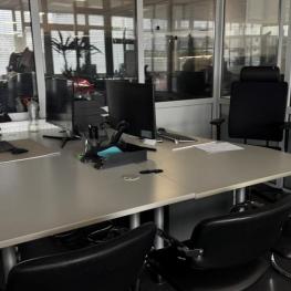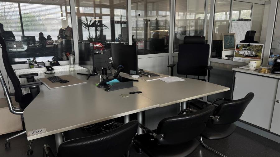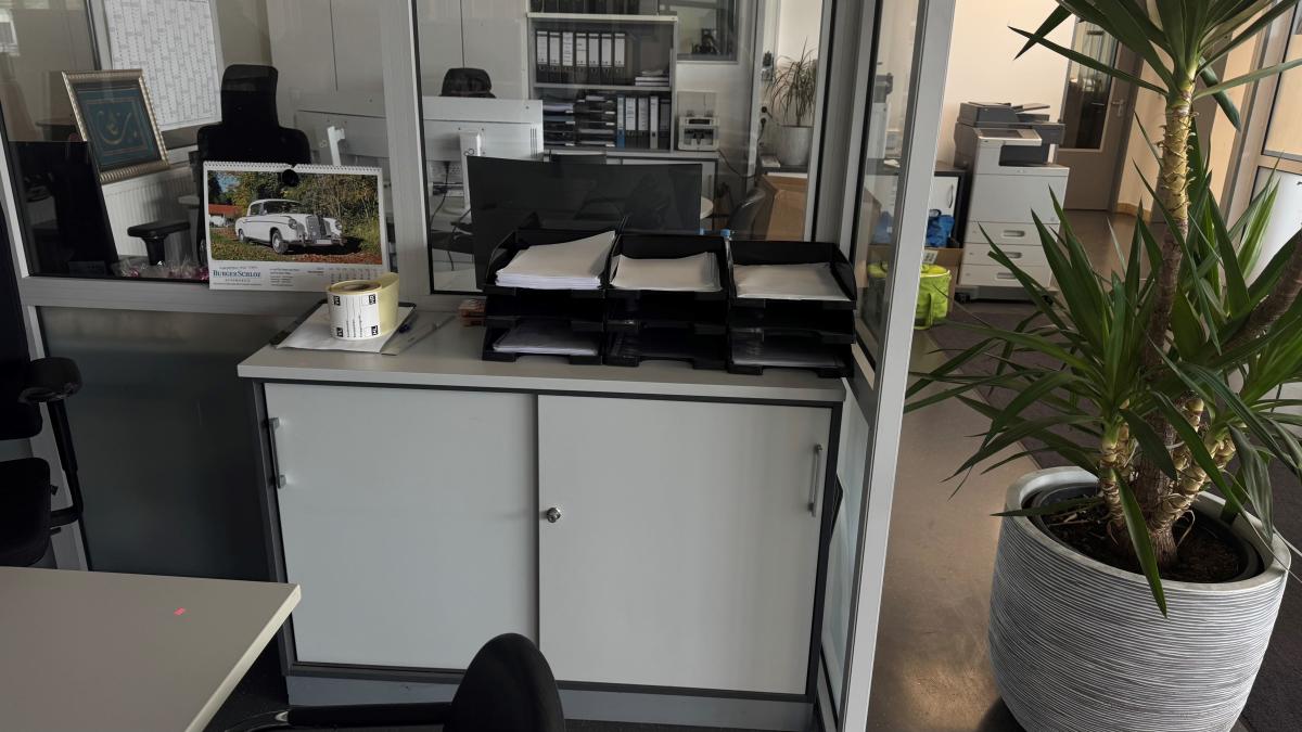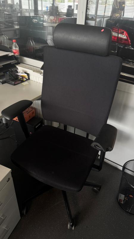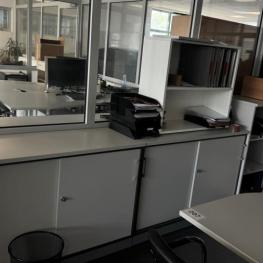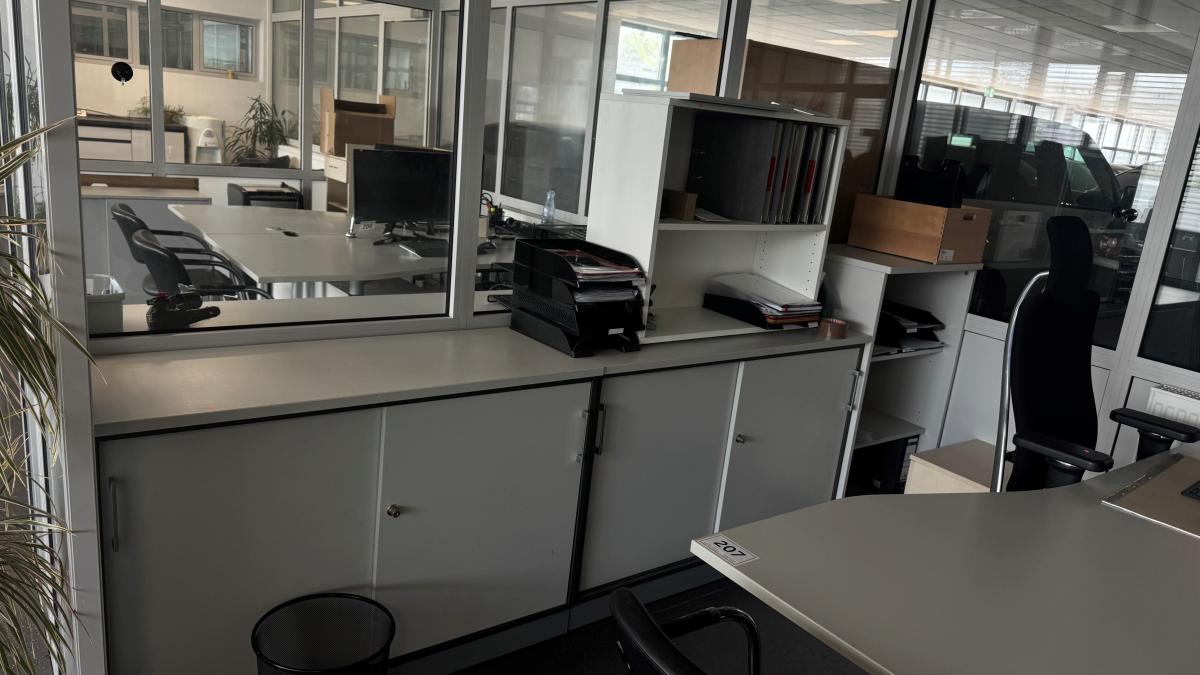 best. aus: 2 Freiformschreibtische, je 2.000 x 1.000 mm, 2 Rollcontainer, 1x 4 Auszüge, 1x 2 Auszüge, 3 Schiebetüresideboards, 2-türig, je 2 Ebenen, Aktenschrank, hellgrau, H ca. 1.200 mm, Regalaufsatz, 2 Ebenen, Bürodrehstuhl, Fabr. Vitra, Stoffpolster schwarz, Bürodrehstuhl, Fabr. Grammer Office, Stoffpolster schwarz, 3 Freischwinger, Chromgestell, Kunstleder schwarz