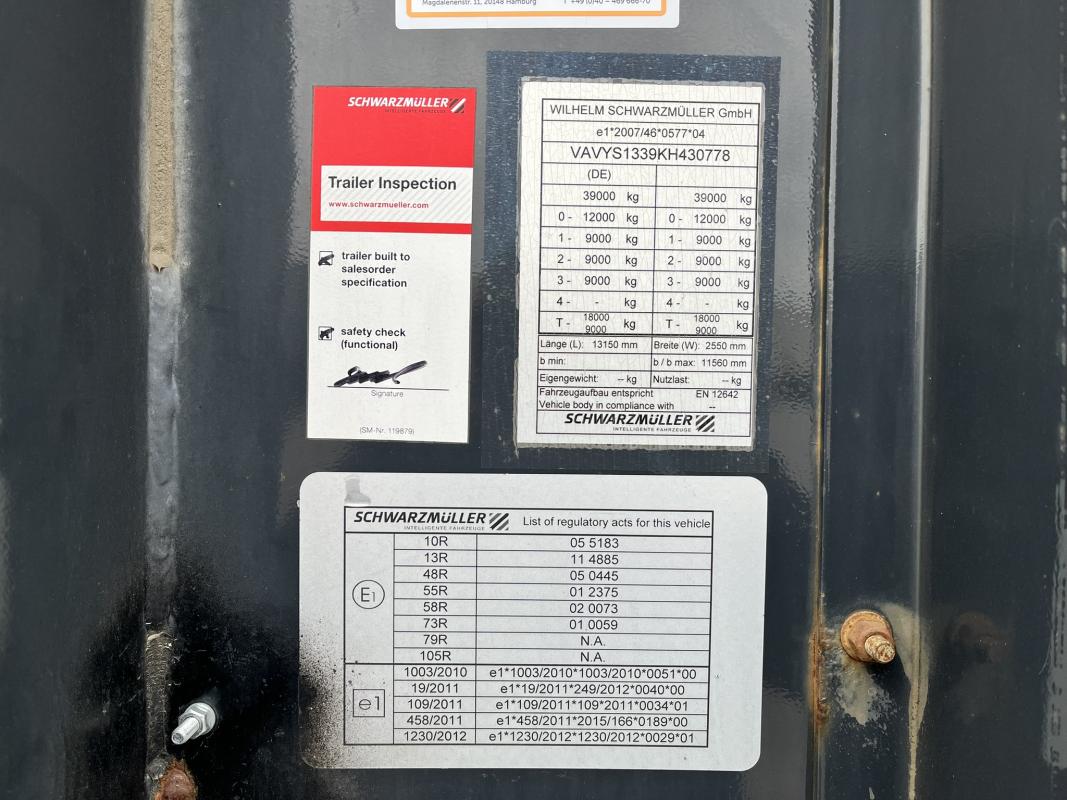 Fabrikat: SCHWARZMÜLLER, Typ: Y-Serie, Baujahr: 2019, VAVYS1339KH430778, EZ 02/19, zulässiges Gesamtgewicht 39.000 kg, Rundholzrungen, letzte HU 02/25_SP 08/24