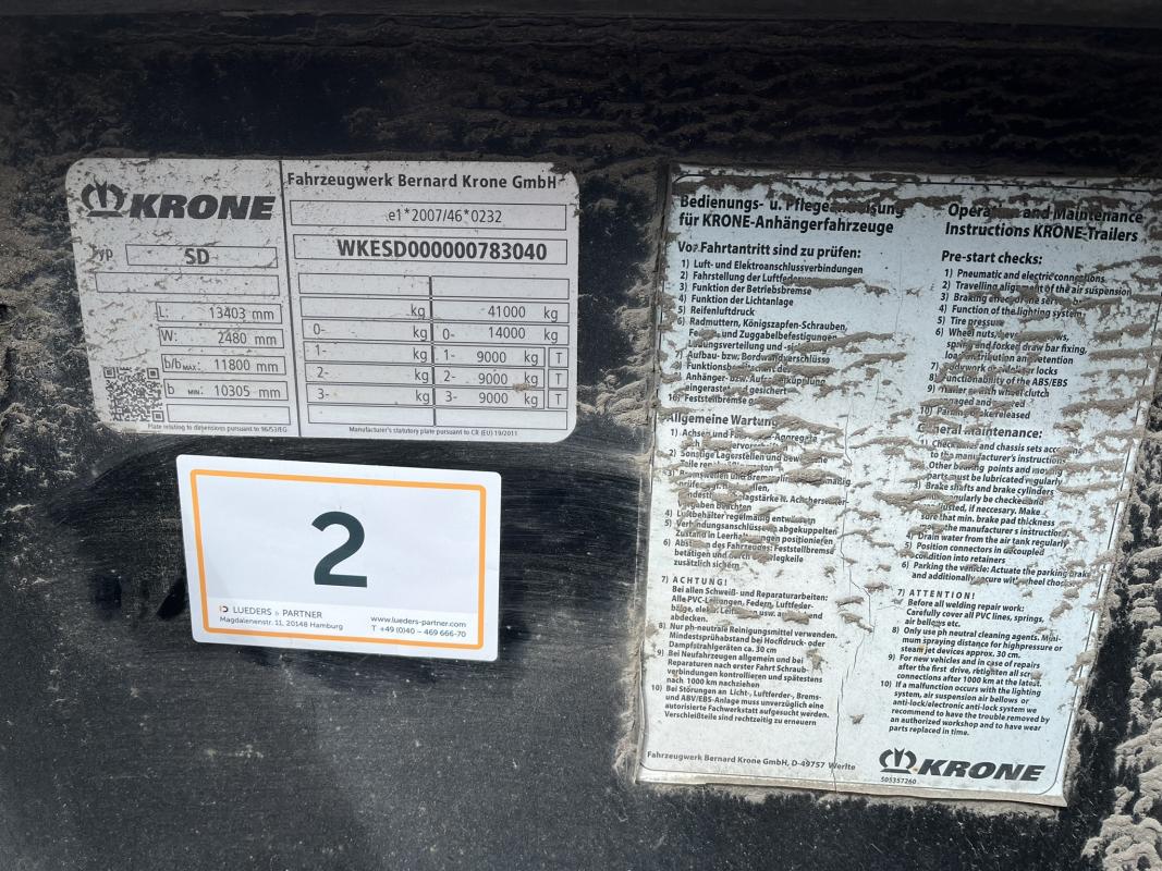 Fabrikat: KRONE, Typ: SD-DA08CLSA, Baujahr: 2017, WKESD000000783040, EZ 10/17, zulässiges Gesamtgewicht 40.000 kg, letzte HU 11/24_SP 05/24