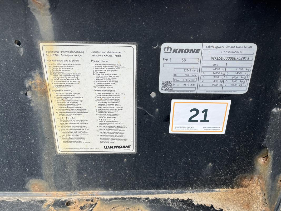 Fabrikat: KRONE, Typ: DA08CLSA, Baujahr: 2017, WKESD000000762913, EZ 03/17, zulässiges Gesamtgewicht 40.000 kg, letzte HU 03/24_SP 09/24