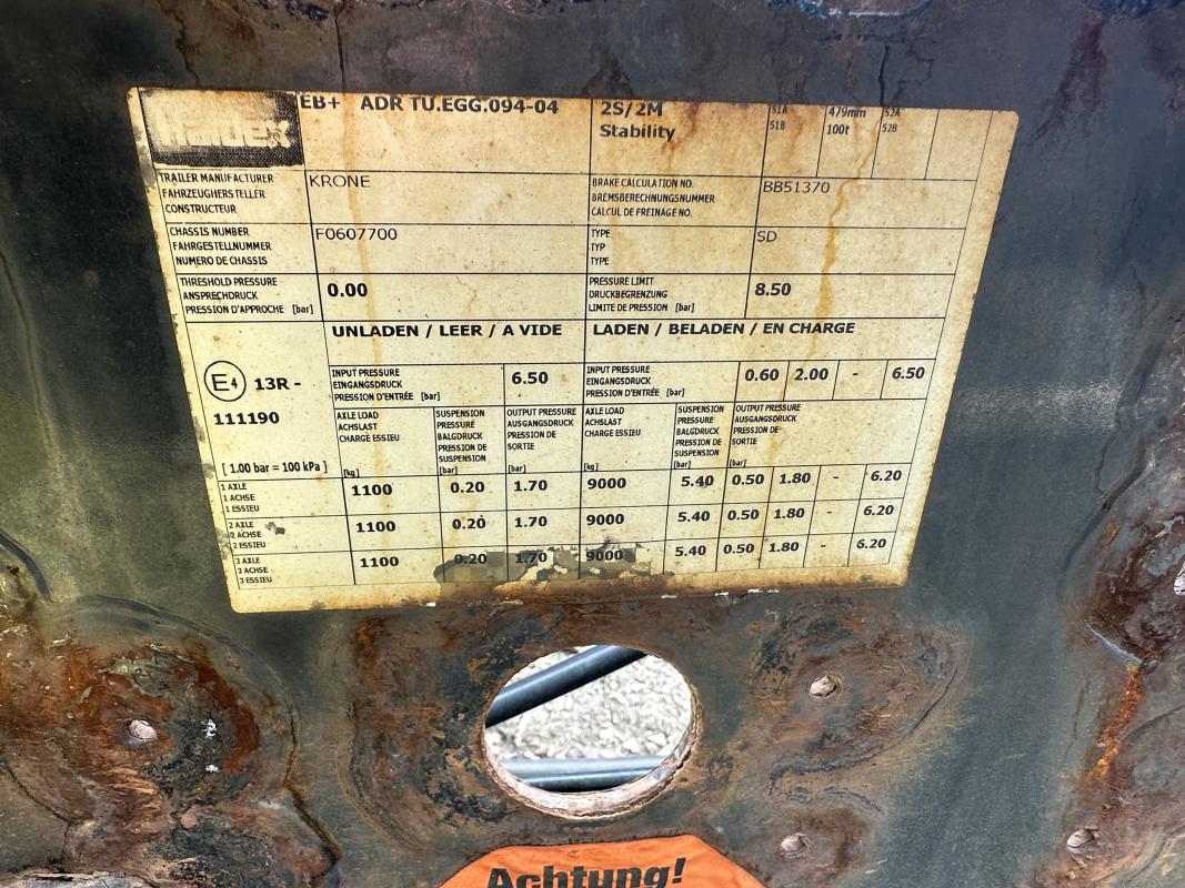 Fabrikat: KRONE, Typ: SD-DA08CLSA, Baujahr: 2014, WKESD000000607700, EZ 02/14, zulässiges Gesamtgewicht 40.000 kg, letzte HU 03/23_SP 09/23