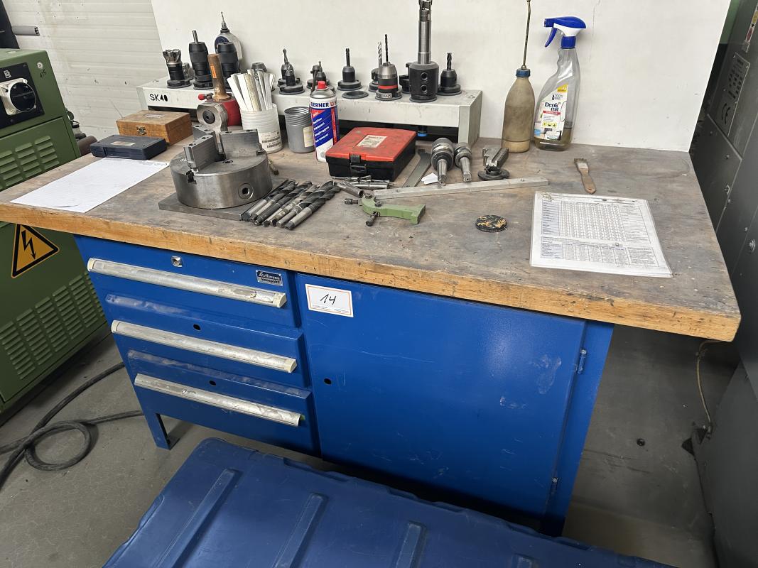 Fabrikat: HOFFMANN, 2.000 x 750 mm, Unterschrank 3 Schubfächer, 1 Türelement, WTS System 17 Werkzeugaufnahmen SK 40 (Komplettwerkzeuge) 1x 3D Taster, Spannmittel, Rollierwerkzeuge, Parallelunterlagen