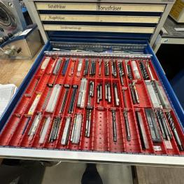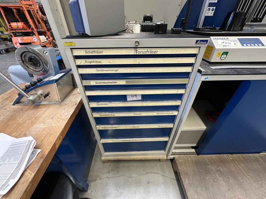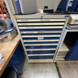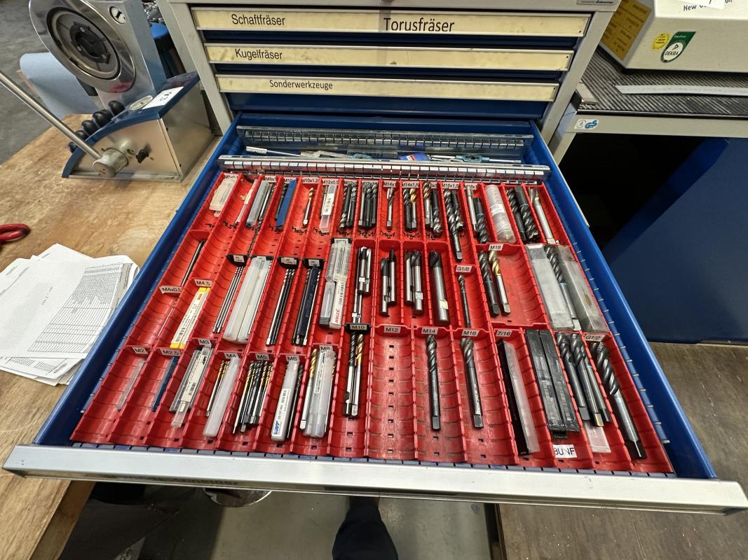 Fabrikat: GARANT, B 700 mm, 9 Schubfächer, 1 Schiebtürenschrank 2-türig, Inhalt: Spiralbohrer, Schaftfräser, Gewindebohrer, Kugelfräser, PKD Werkzeuge