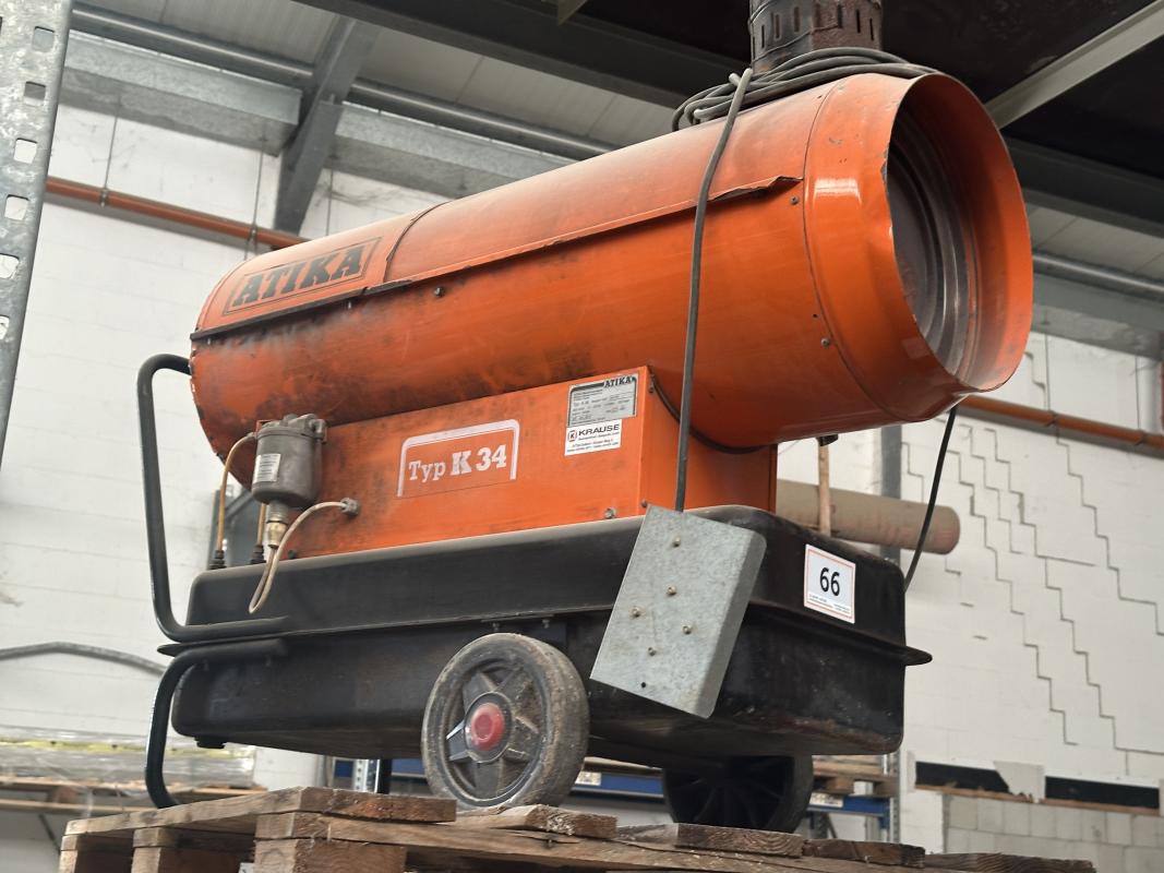 Fabrikat: ATIKA, Typ: K 34, Oelheizer, 34,4 kW, Verbrauch 2,89 kg/h, Tankinhalt 65 l., Luftleistung 1660 m³/h