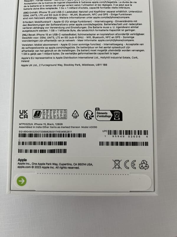 Fabrikat: APPLE, Typ: iPhone 15, Black, 128 GB, A3090, Baujahr: A3090, Ser.-Nr.: D2LDQQCJHQ Neu, Originalkarton, ungeöffnet