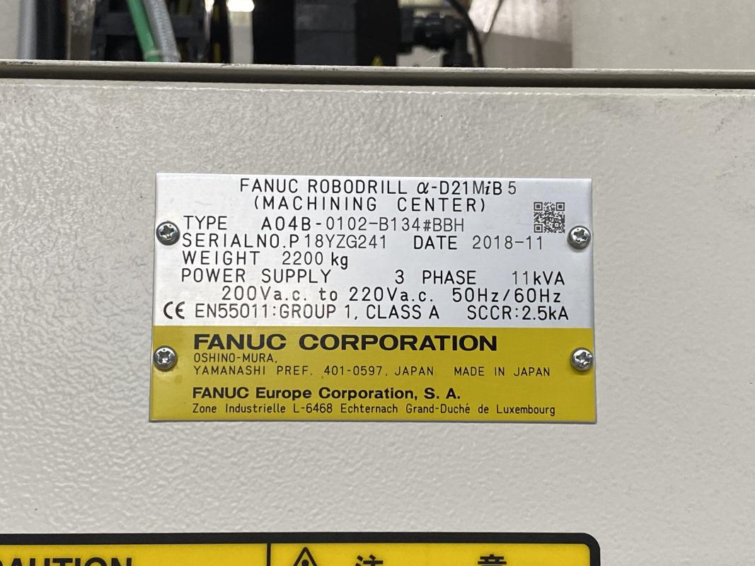 Fabrikat: FANUC, Typ: Robodrill Alpha D21MiB 5, Baujahr: 2019, Ser.-Nr. P18YZG241, Steuerung, Typ 31I-Modell B5, Tischgröße 650 x 400 mm, Verfahrweg X/Y/Z 500 x 400 x 330 mm, Drehtisch, Fabr. Lehmann TF-507510.RR TIP 1C, Spitzenhöhe 180 mm, 3-Backen-Futter Schunk, TH 110-2521-fach Werkzeugrevolver, Werkzeugaufnahme BBT30, Drehzahl max. 24.000 U/min., Späneförderer, NOP Kühlmittelanlage, IKZ 70 bar, CO2-Löschanlage, Messtaster HEXAGON, Hydac Hydraulikanlage, Schalt- und Steuerschränke
