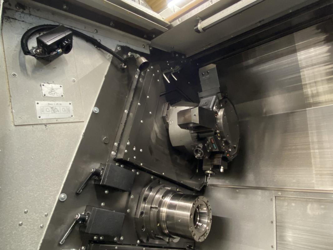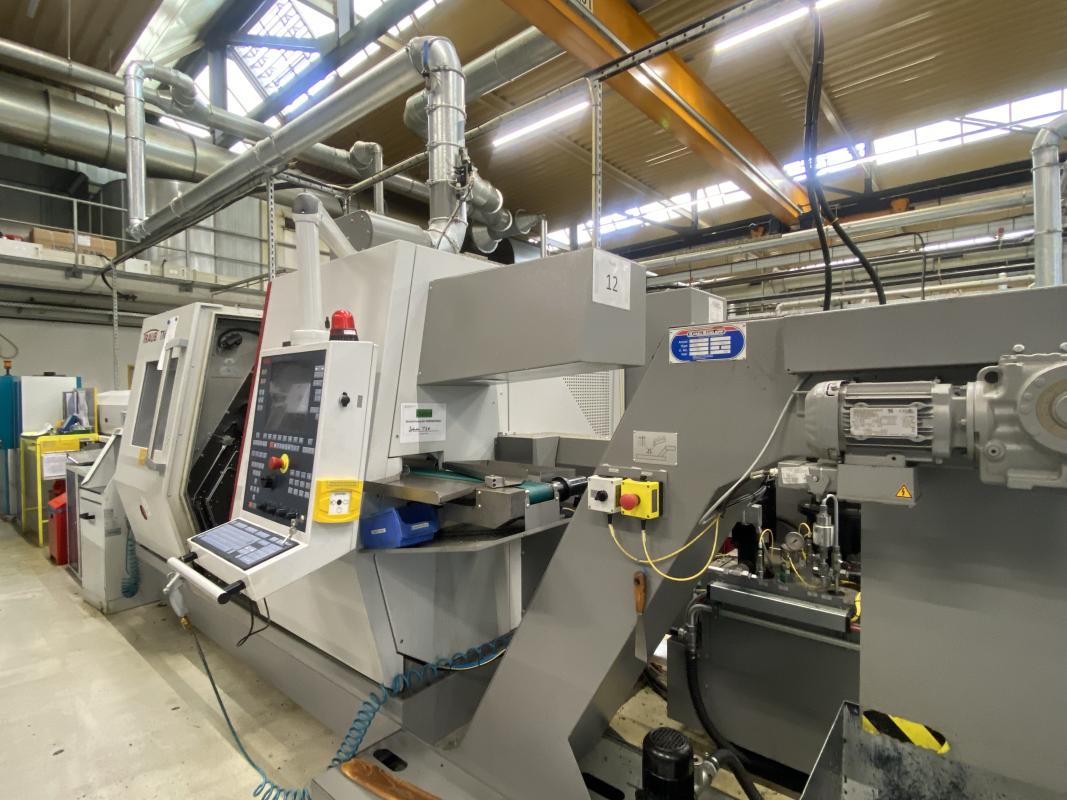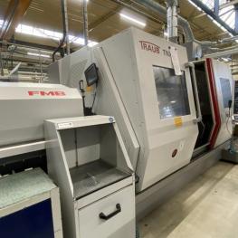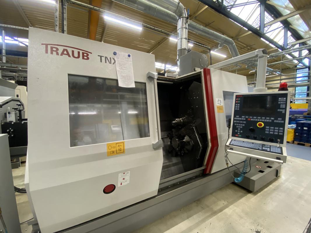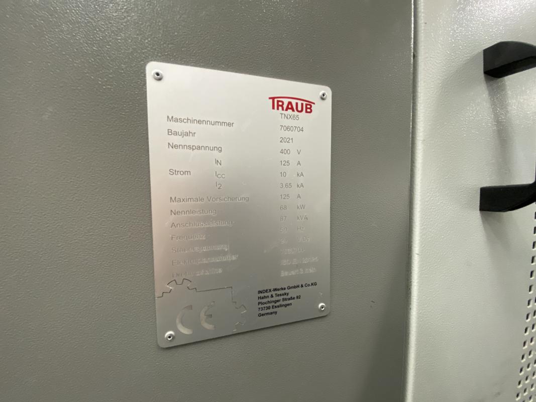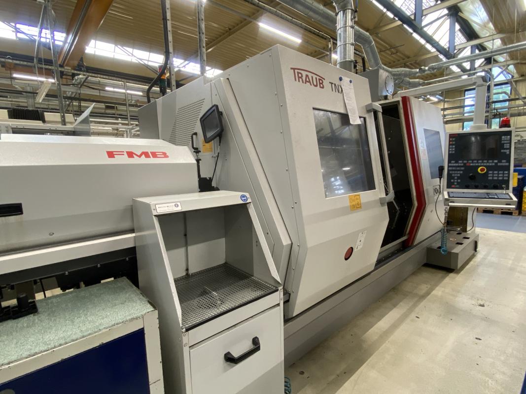 Fabrikat: TRAUB, Typ: TNX65, Baujahr: 2021, Ser.-Nr. 7060703, Steuerung, Fabr. Traub, Typ TX8i-S, 12 Achsen, Stangen-Ø 65 mm, Hauptspindel, Gegenspindel, 3x 10-fach Werkzeugrevolver mit angetr. Werkzeugstationen, Verfahrwege X/Z 175 x 650 mm, 3x Y-Achse +/- 40 mm, 2x C-Achse, Drehzahl Hauptspindel 5.000 U/min., Drehzahl Gegenspindel 7.000 U/min., Stangenlademagazin, Fabr. FMB, Typ Turbo 5-65, Ser.-Nr. 410750, Kühlschmierstoffanlage, Hochdruckpumpe, Bandfilter, Späneförderer, CO2-Löschanlage, Fabr. Kraft + Bauer, abgel. Betriebsstd. 10.257