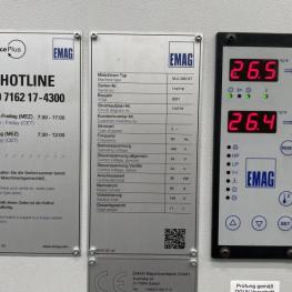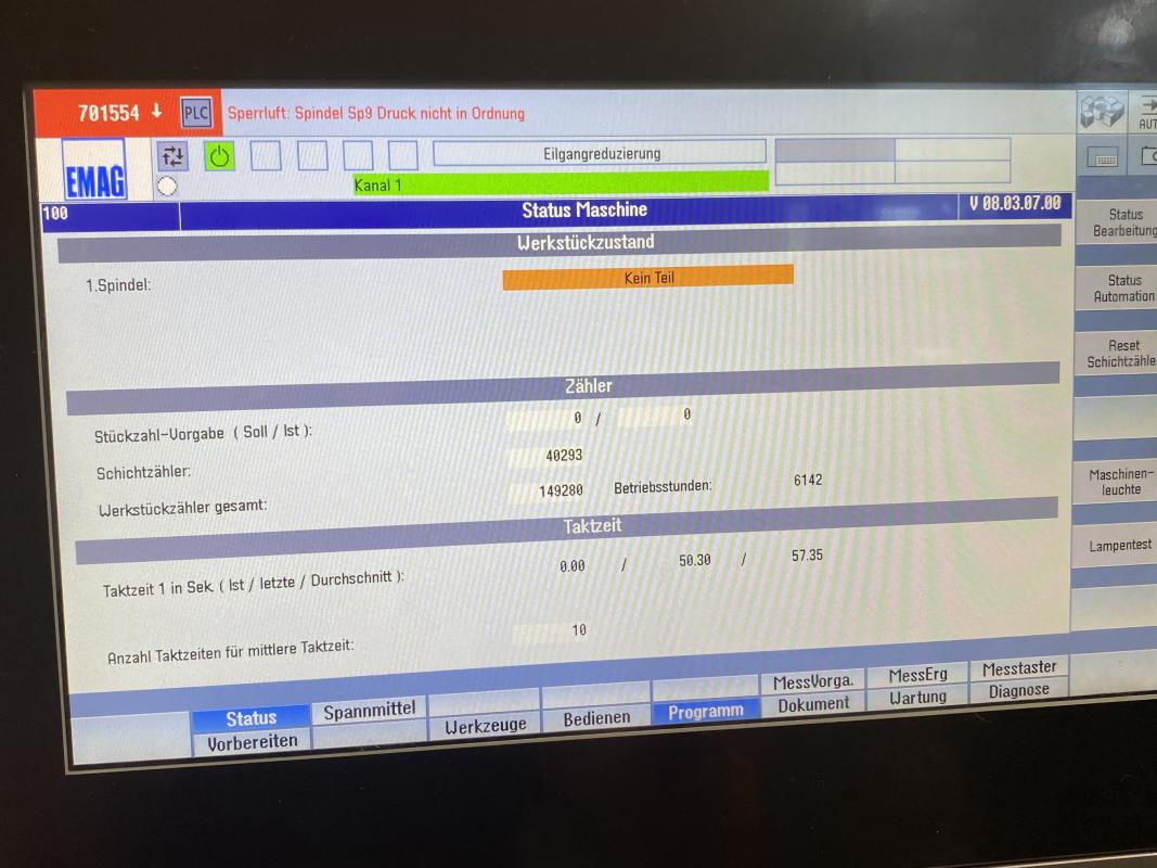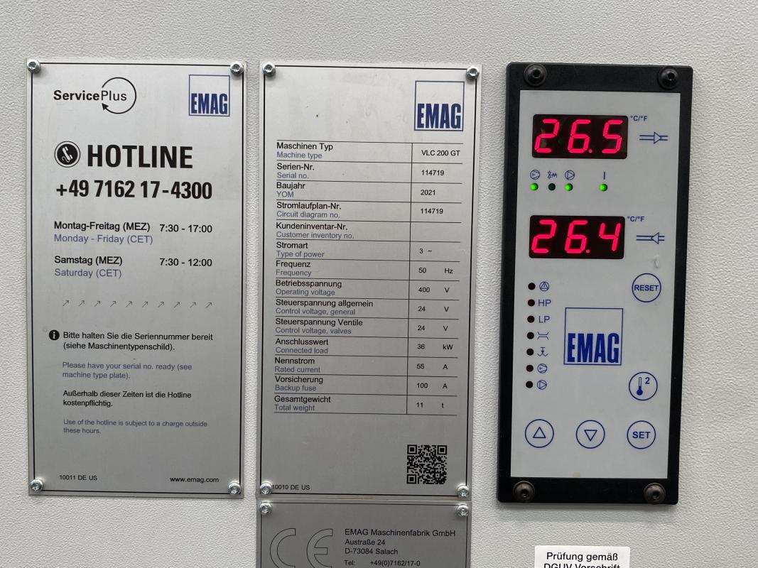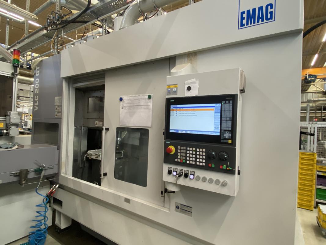 Fabrikat: EMAG, Typ: VLC 200 GT, Baujahr: 2021, Ser.-Nr. 11479, Steuerung, Fabr. Siemens, Typ Sinumerik 840Dsl, Werkstück-Ø 200 mm, Werkstücklänge 100 mm, Hauptspindel 18 KW, Drehzahl 3.000 U/min., 12-fach Werkzeugrevolver, Aussenschleifspindel TSE 200, Abrichteinheit, Werkstücktransportsystem, 21 Werkstückträgerpaletten, Späneförderer, Emulsionsnebelabsaugung, 2x Kühlschmiermittelversorgung 8/30 bar, Papierbandfilter, Magnetvorabscheider, inline Werkstückvermessung, Schnittstelle Handlingsystem Simenes Profinet, Doppelkolben-Spannzylinder, Flanschspanndorn