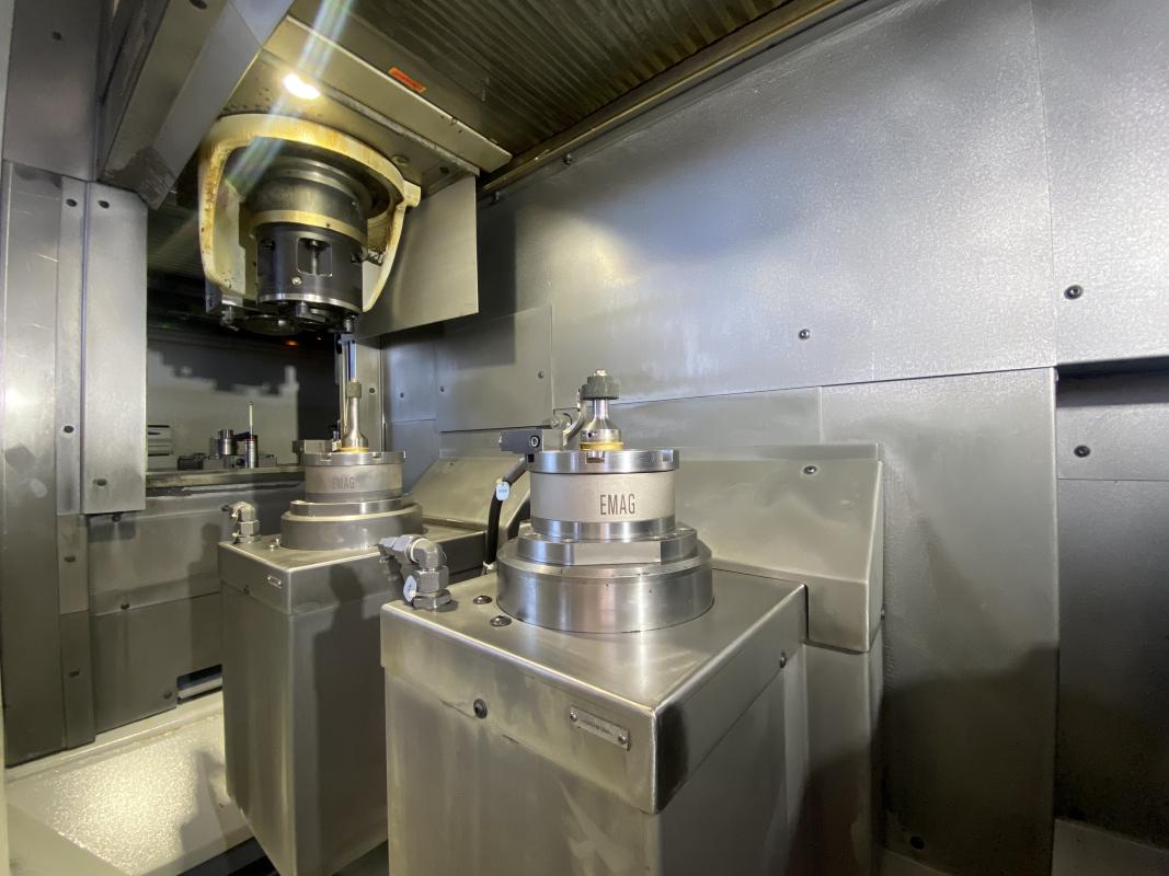 Fabrikat: EMAG, Typ: VLC 200 GT, Baujahr: 2021, Ser.-Nr. 11478, Steuerung, Fabr. Siemens, Typ Sinumerik 840Dsl, Werkstück-Ø 200 mm, Werkstücklänge 100 mm, Hauptspindel 18 KW, Drehzahl 3.000 U/min., 12-fach Werkzeugrevolver, 2 Innenschleifspindeln / Motorschleifspindeln 140/45.000, Abrichteinheit, Werkstücktransportsystem, 21 Werkstückträgerpaletten, Späneförderer, Emulsionsnebelabsaugung, Kühlschmiermittelversorgung, Papierbandfilter, Magnetvorabscheider, inline Werkzeugvermessung, Schnittstelle Handlingsystem Simenes Profinet, Doppelkolben-Spannzylinder, Spannfutter