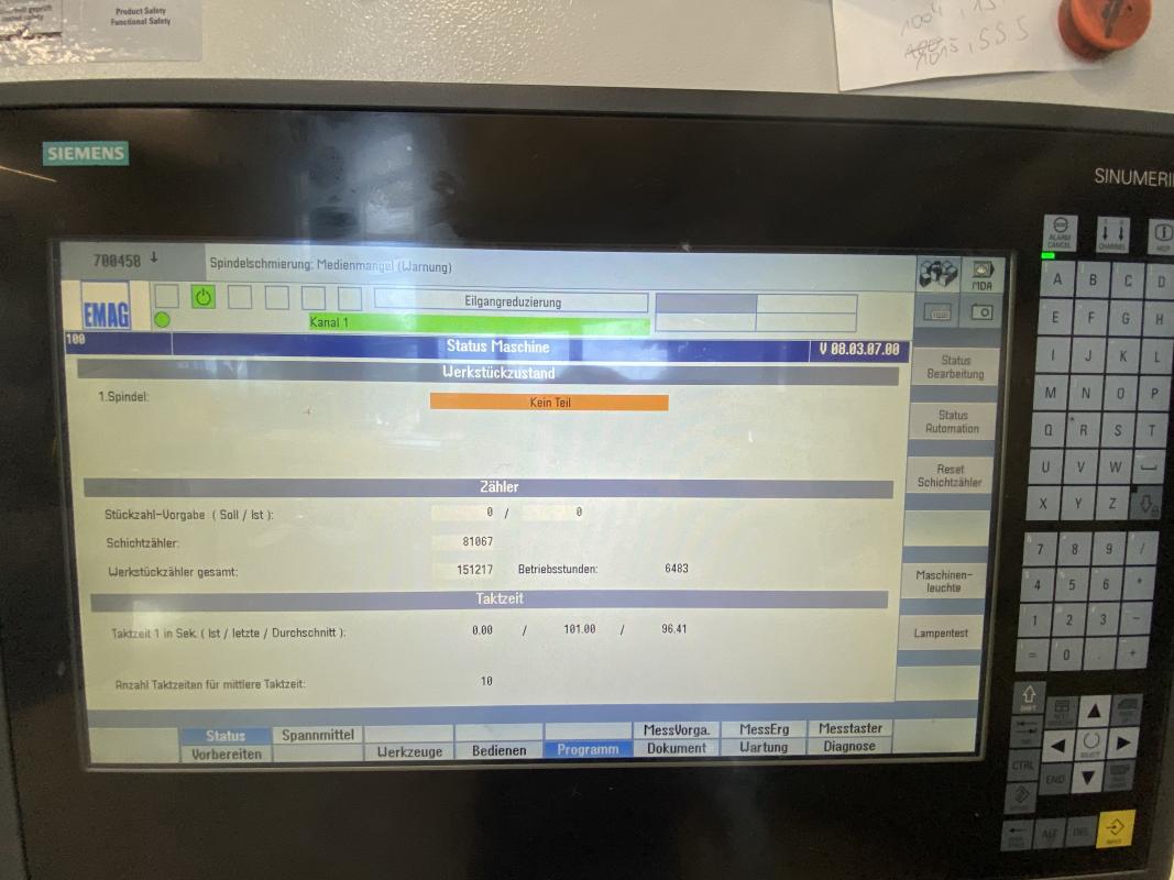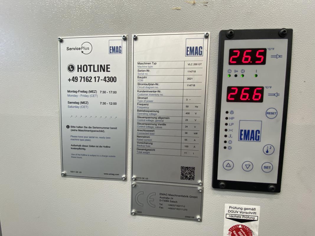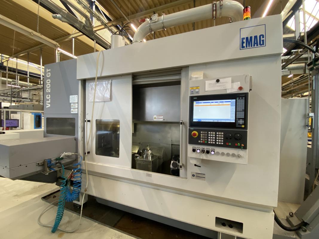 Fabrikat: EMAG, Typ: VLC 200 GT, Baujahr: 2021, Ser.-Nr. 11478, Steuerung, Fabr. Siemens, Typ Sinumerik 840Dsl, Werkstück-Ø 200 mm, Werkstücklänge 100 mm, Hauptspindel 18 KW, Drehzahl 3.000 U/min., 12-fach Werkzeugrevolver, 2 Innenschleifspindeln / Motorschleifspindeln 140/45.000, Abrichteinheit, Werkstücktransportsystem, 21 Werkstückträgerpaletten, Späneförderer, Emulsionsnebelabsaugung, Kühlschmiermittelversorgung, Papierbandfilter, Magnetvorabscheider, inline Werkzeugvermessung, Schnittstelle Handlingsystem Simenes Profinet, Doppelkolben-Spannzylinder, Spannfutter