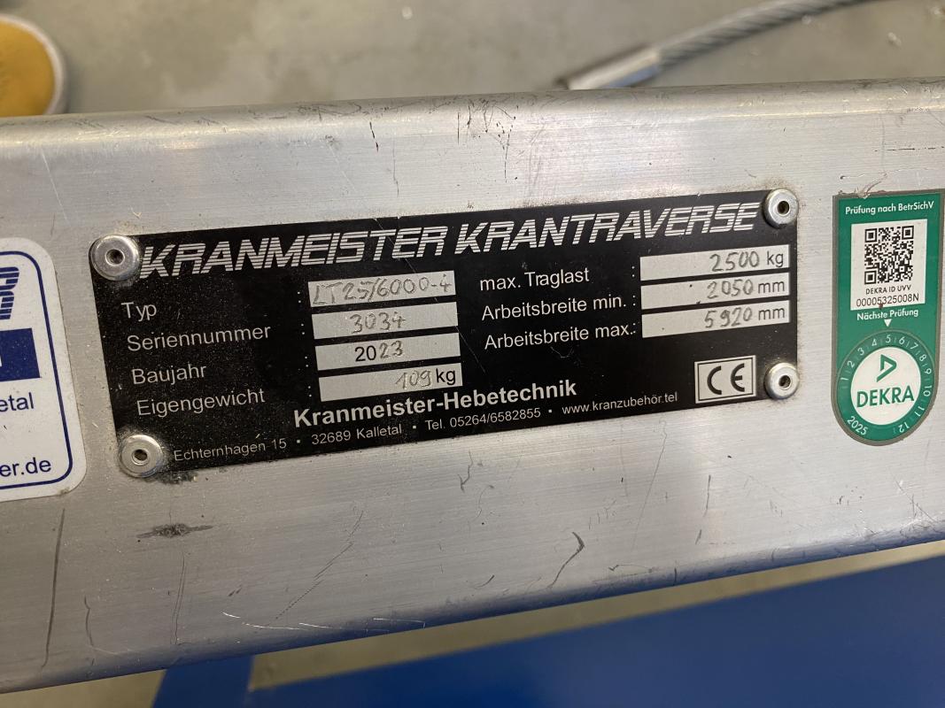 Fabrikat: KRANMEISTER, Typ: LT25/6000-4, Baujahr: 2023, Ser.-Nr. 3034, Traversenlänge 6.000 mm, Tragfähigkeit 2.500 kg