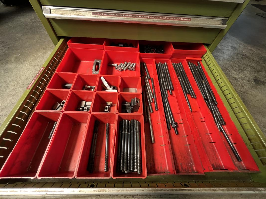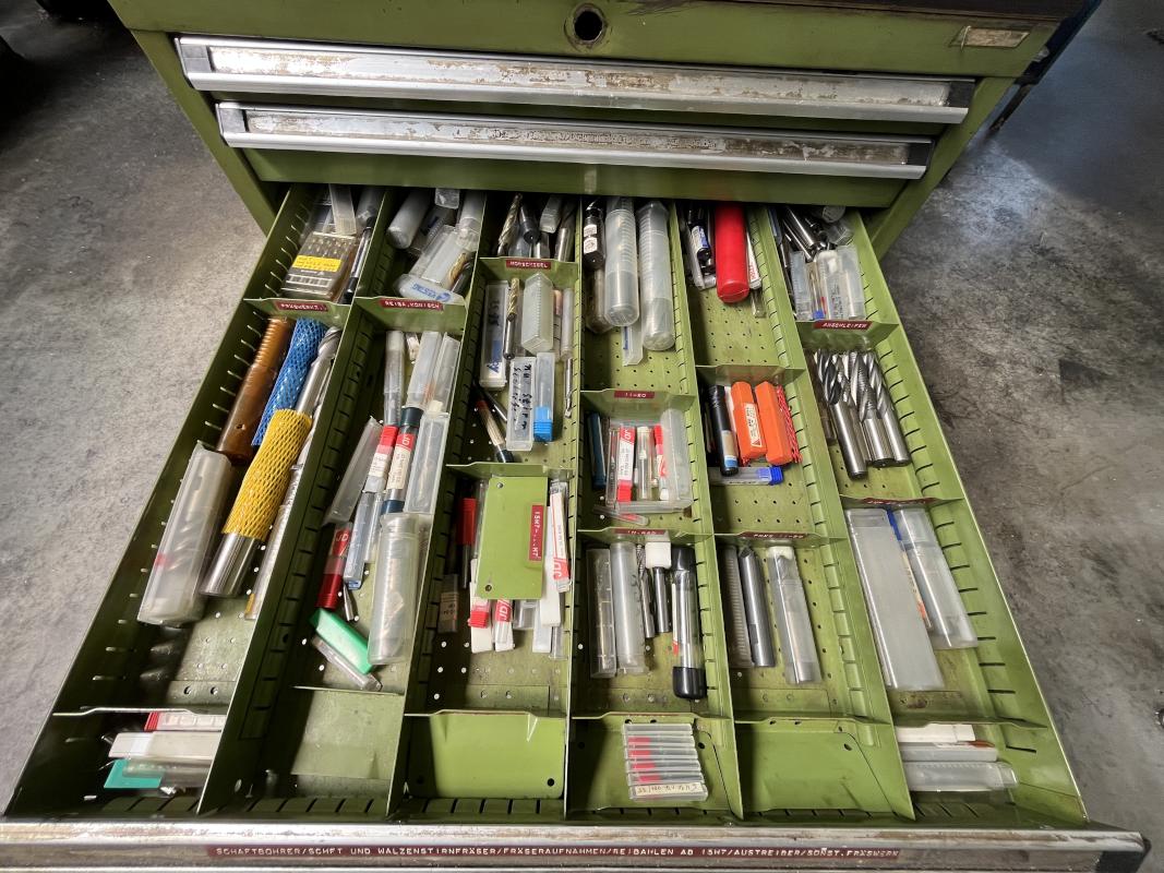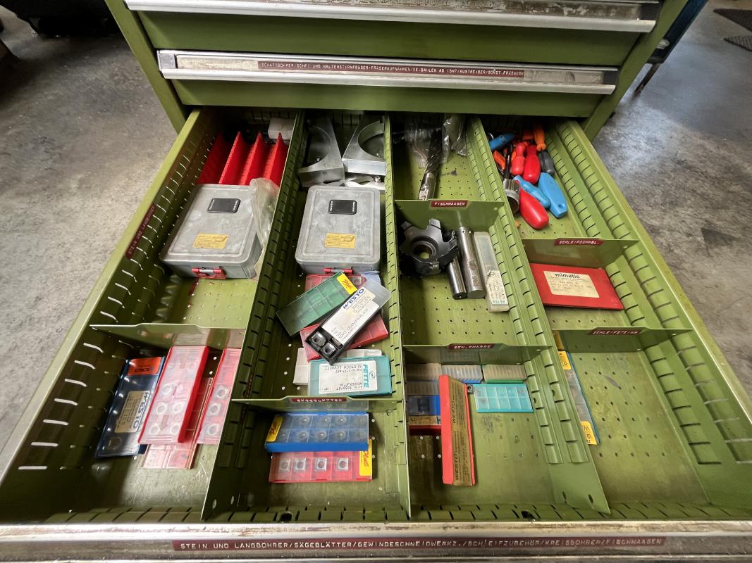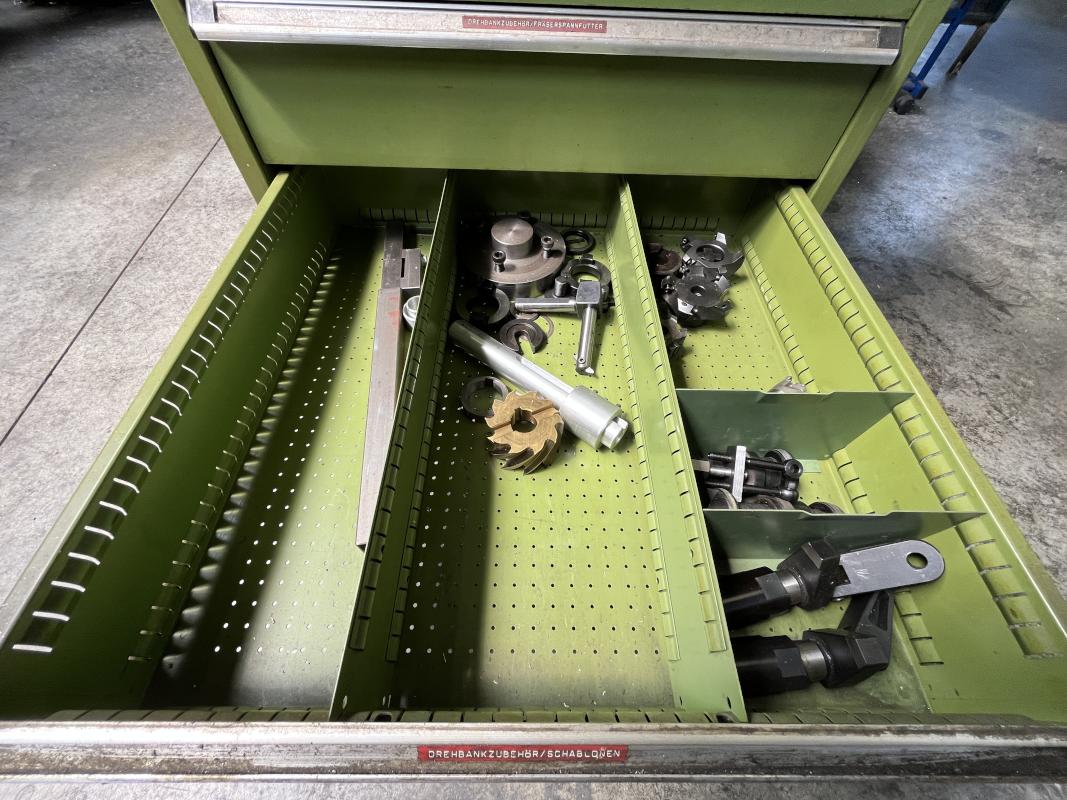 Auszüge, Inhalt: div. Fräsaufnahmen, Walzen, Stirnfräser, Schaftbohrer, Stein- und Langbohrer, Gewindeschneidwerke, Schleifzubehör, Kreisbohrer, Drehbankzubehör, Frässpanfutter, Schablonen, Spannfutter, Bohrer