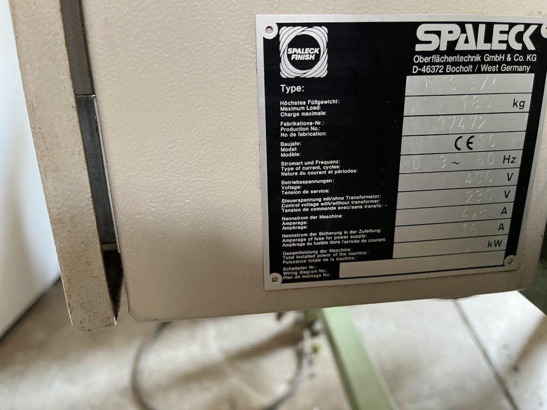 Fabrikat: SPALECK OBERFLÄCHEN-TECHNIK GMBH & CO KG, Typ: RTS3/4, Baujahr: 1996, Ser.-Nr.: 37472, Trommelanzahl 1, Trommelinhalt 35 l, Nutzvolumen 25 l, max. Füllgewicht 120 kg, Trommel 40 U/min, Ø 460 x 530 mm