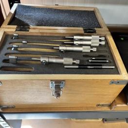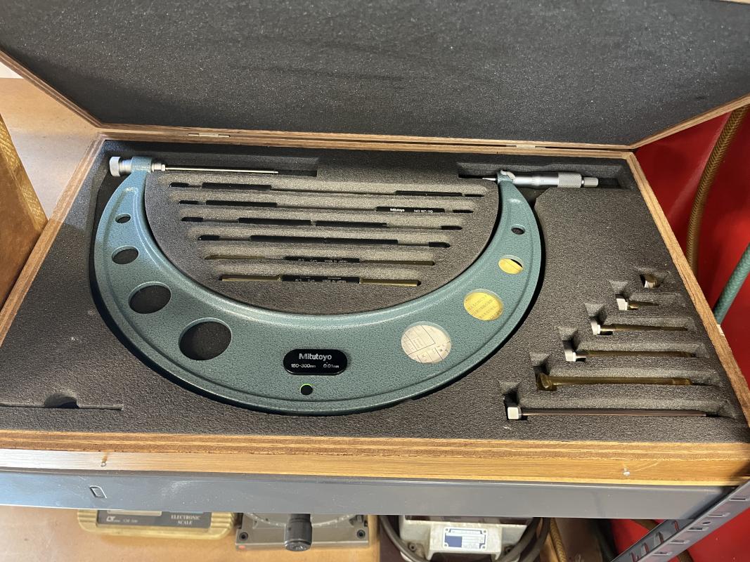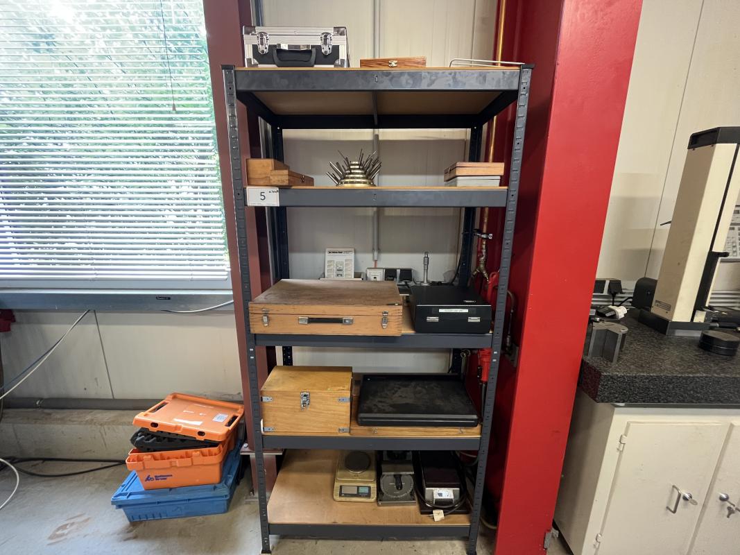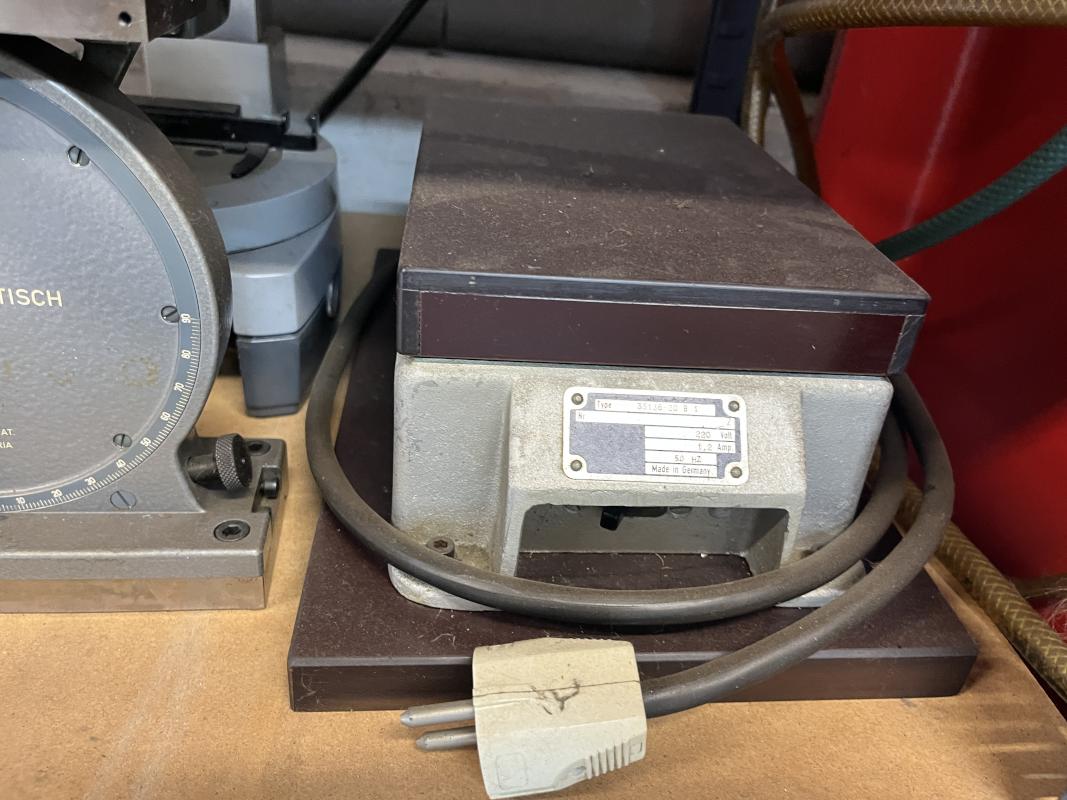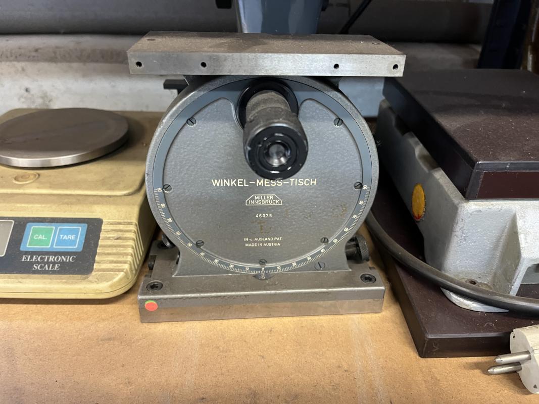 best. aus: Metallsteckregal, Gewinde-Lehrdorne, Präzisionsmesskugeln, Fabr. Sartorius, Wasserwaage, Fabr. C. Stiefelmeyer KG, Feintaster, Innenmessschraube, Messring, Satz Mikrometer, 2-Punkt-Innenmessgerät, Fabr. Mitutoyo, Außenmikrometer, Fabr. Mitutoyo, Winkelmesstisch, Fabr. Miller, Feinwaage, Fabr. Blutron, Typ GM-500, Mikroskop, Fabr. AO Instrument Company, Typ 570, Entmagnetisierungsplatte, Typ 35136-20B1, 220 V