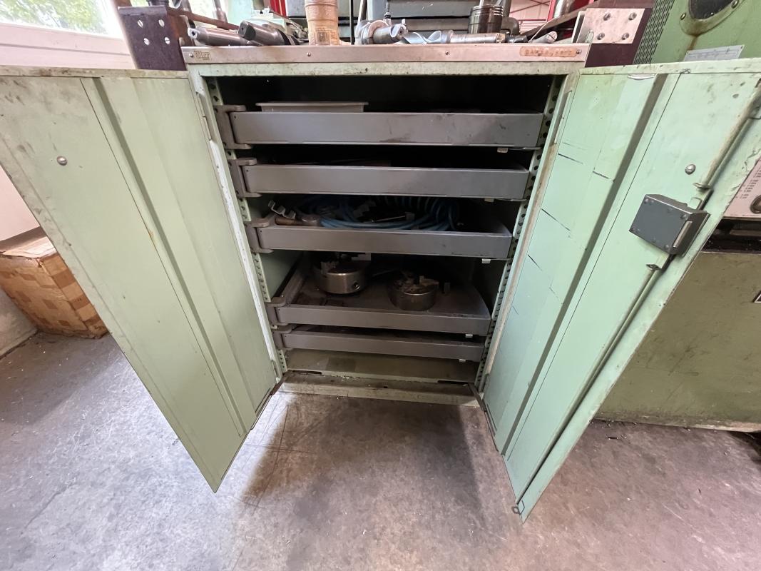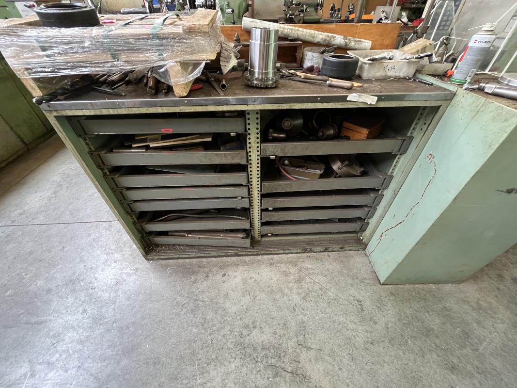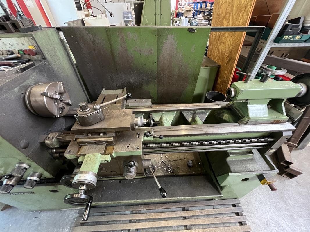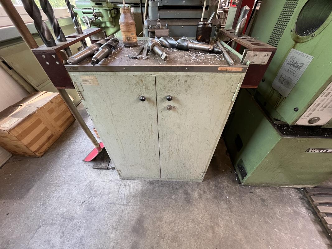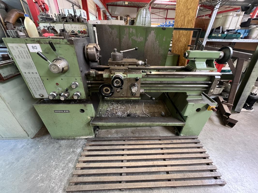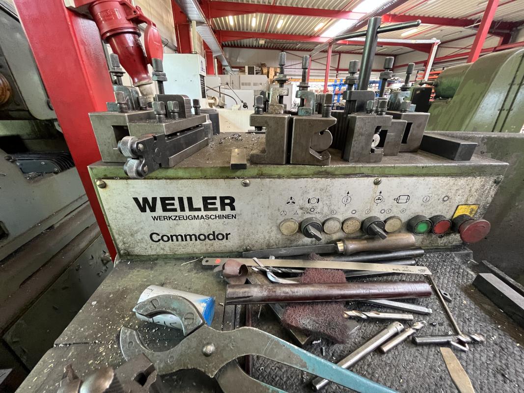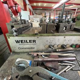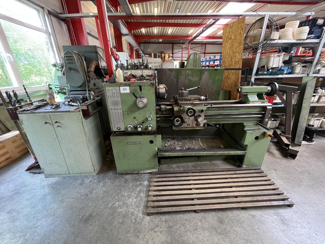Fabrikat: WEILER, Typ: Commodor, Spitzenhöhe/-weite 200 x 1.000 mm, 3-Backenfutter, Drehzahlbereich 25 - 2.000 U/min, Reitstock, Schnellwechsel-Stahlhalterkopf, Fabr. Multifix, Zubehör: Stahlblechschrank, doppeltürig, Stahlblechschrank, ohne Türen, Inhalt: div. 3-Backenfutter, Werkzeugaufnahmen, Stahlhalter