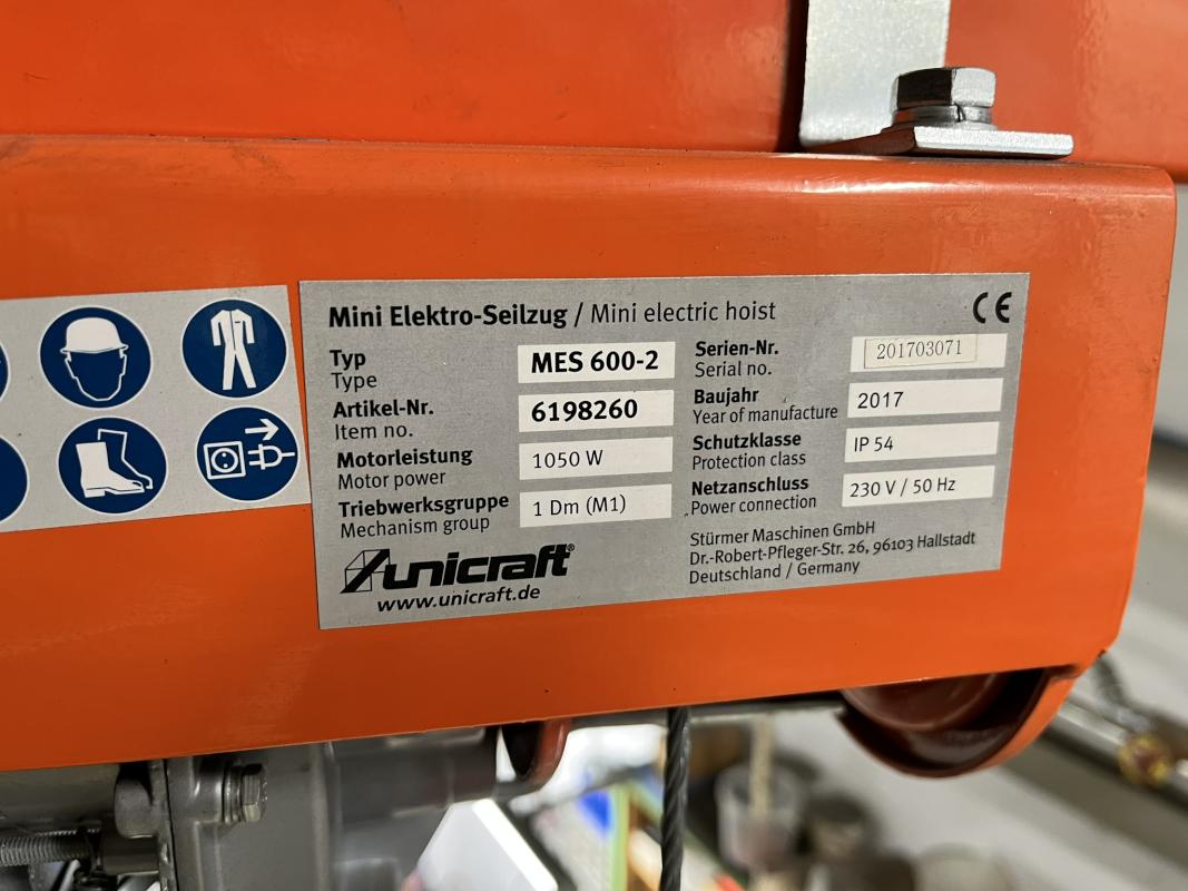 Fabrikat: UNICRAFT, Typ: MES600-2, Baujahr: 2017, Ser.-Nr. 201703071, Motorleistung 1.050 W, Tragfähigkeit max. 600 kg