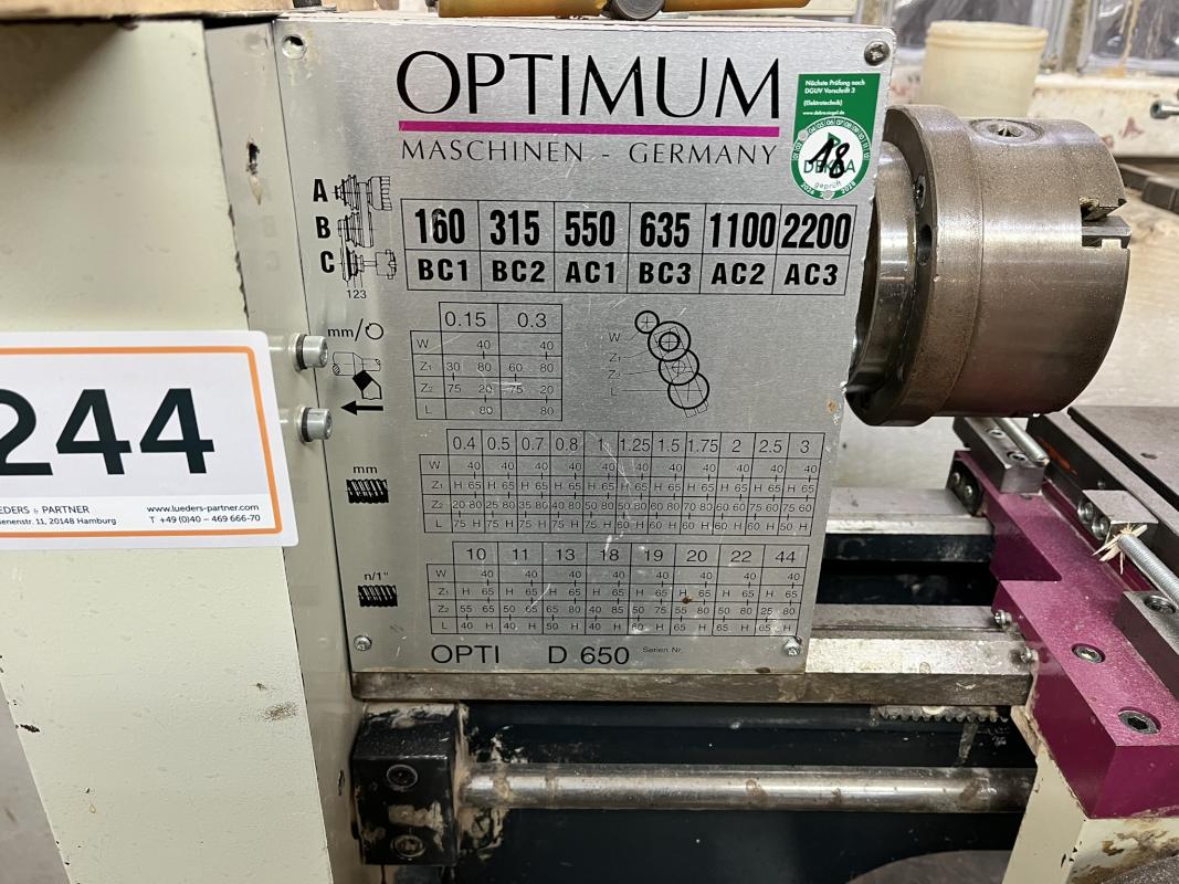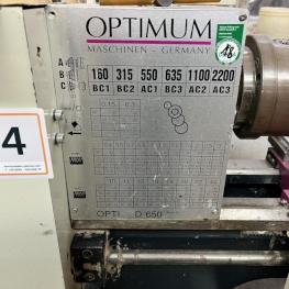 Fabrikat: OPTIMUM, Typ: Opti D650, Spitzenhöhe 140 mm, Spitzenweite 650 mm Umlauf-Ø, über Bett 280 mm, Aufnahme MK4, Drehspindel-Drehzahl 6stufig, 160-2200 U/min, Gewicht ca. 165 kg