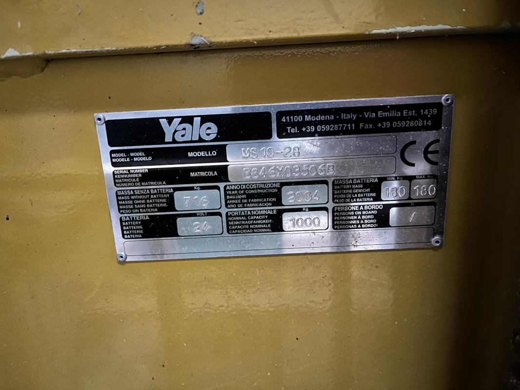 Fabrikat: YALE, Typ: MS10-28, Baujahr: 2004, Ser.-Nr. 8846X03606B, Tragfähigkeit max. 1.000 kg, Ladegerät, spätere Freigabe 12/25