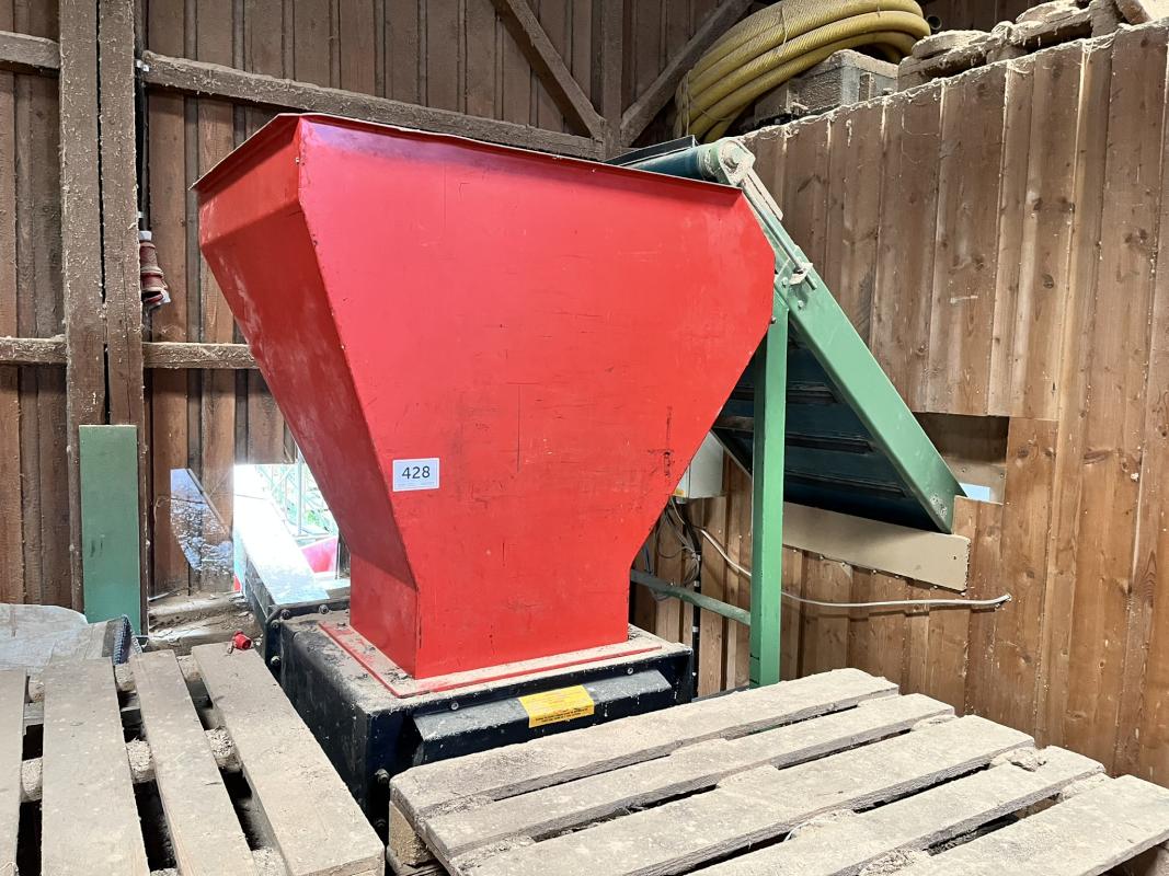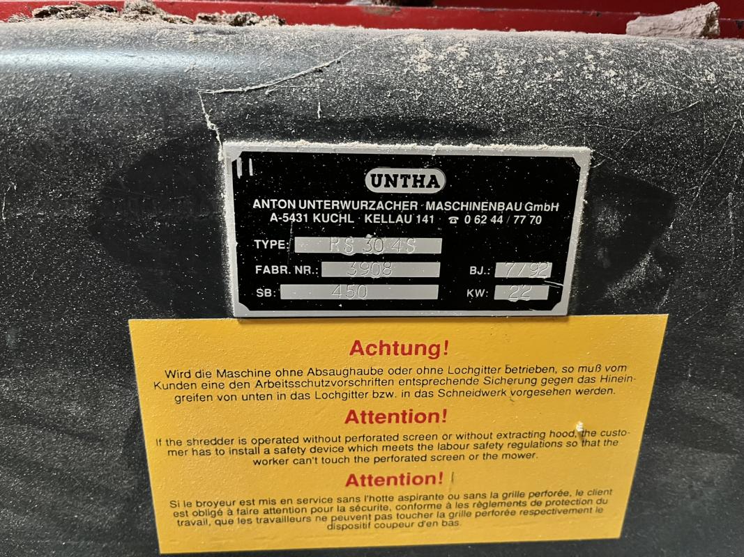 Fabrikat: UNTHA, Typ: RS304S, Baujahr: 1992, Fabr.-Nr. 3908, 22 kW, 2 Schrägförderbänder, 1x Fabr. Collino, Typ NT300, Auffangbehälter, Fabr. Stahlbau Kaiser, Bj. 2001, ca. 1,5 cbm