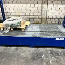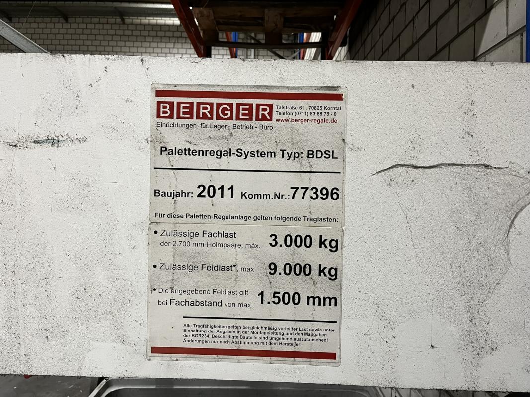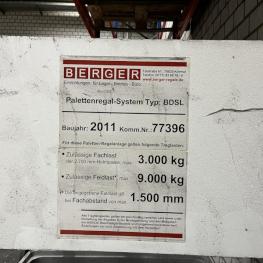 Fabrikat: BERGER, Typ: BDSL, Baujahr: 2011, Komm. Nr. 77396, 2 Felder, je 2 ca. 2.700 mm, je 2 Ebenen, Fachlast max. 3.000 kg, Feldlast max. 9.000 kg, 2 Gefahrstoffauffangwannen, Fabr. Denios, Bj. 2017, Auffangvolumen je 1.000 l