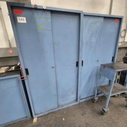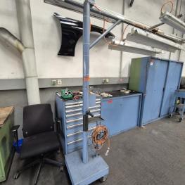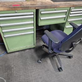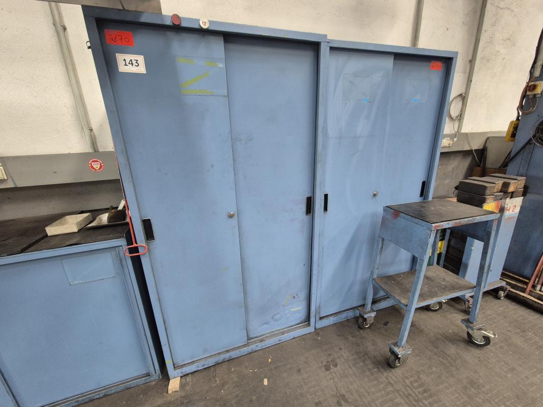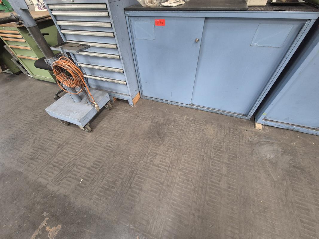 Fabrikat: LISTA, 3.000 x 750 mm, 3 Schubladenschränke je 5 Auszüge, 1 Schraubstock, 3 Schiebetürenschränke 2-türig, 1 Schubladenschrank B 700 mm, 8 Auszüge, Prüflampen-Rollwagen