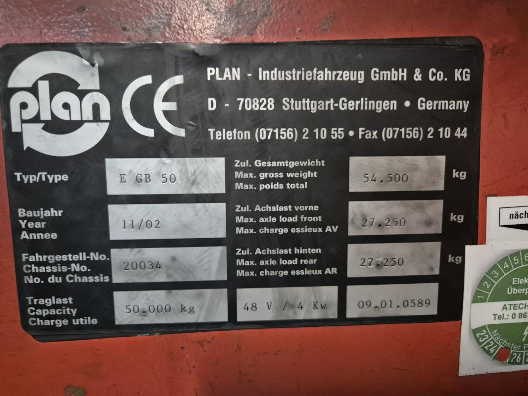 Fabrikat: PLAN, Typ: EGB50, Baujahr: 2002, Ser.-Nr. 20034, Tragfähigkeit max. 50.000 kg, Plattform 4.000 x 2.000 mm, Spurweite 1.435 mm, zul. Achslast vorn/hinten 27.250 kg, Steuereinheit, Zubehör