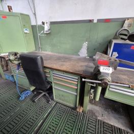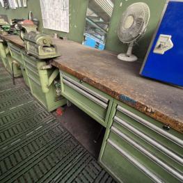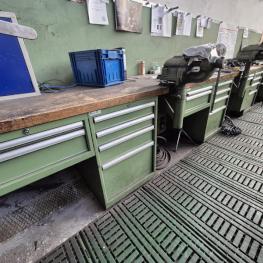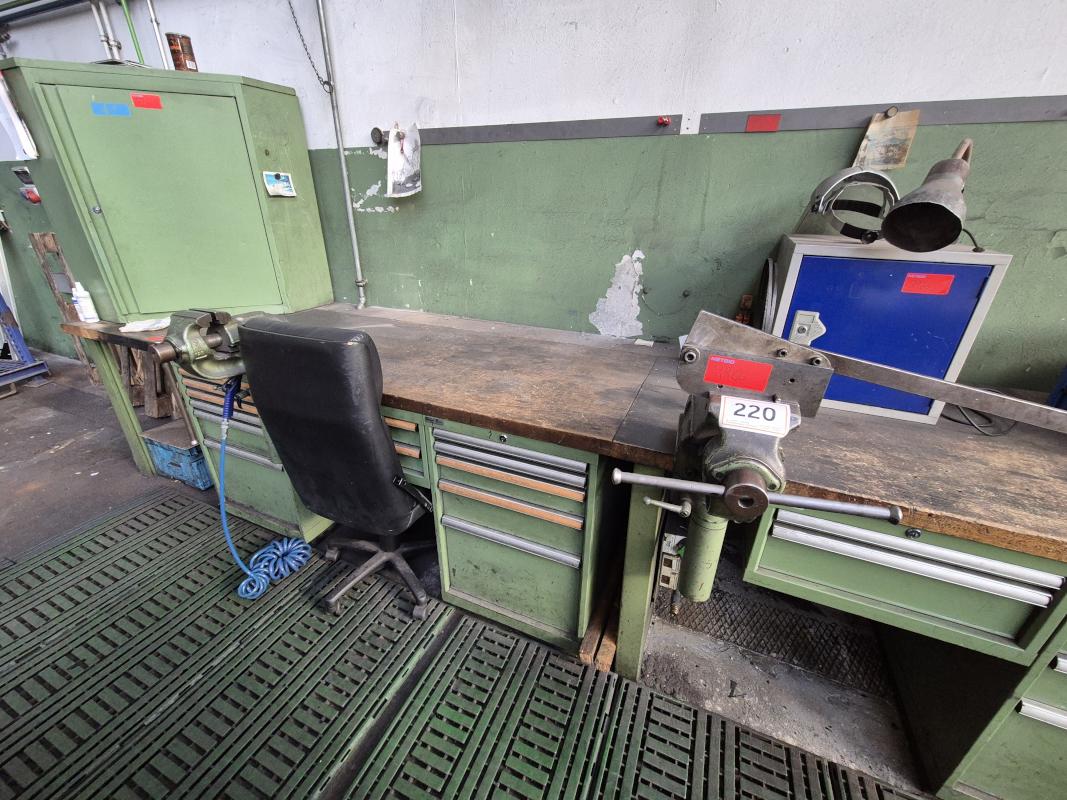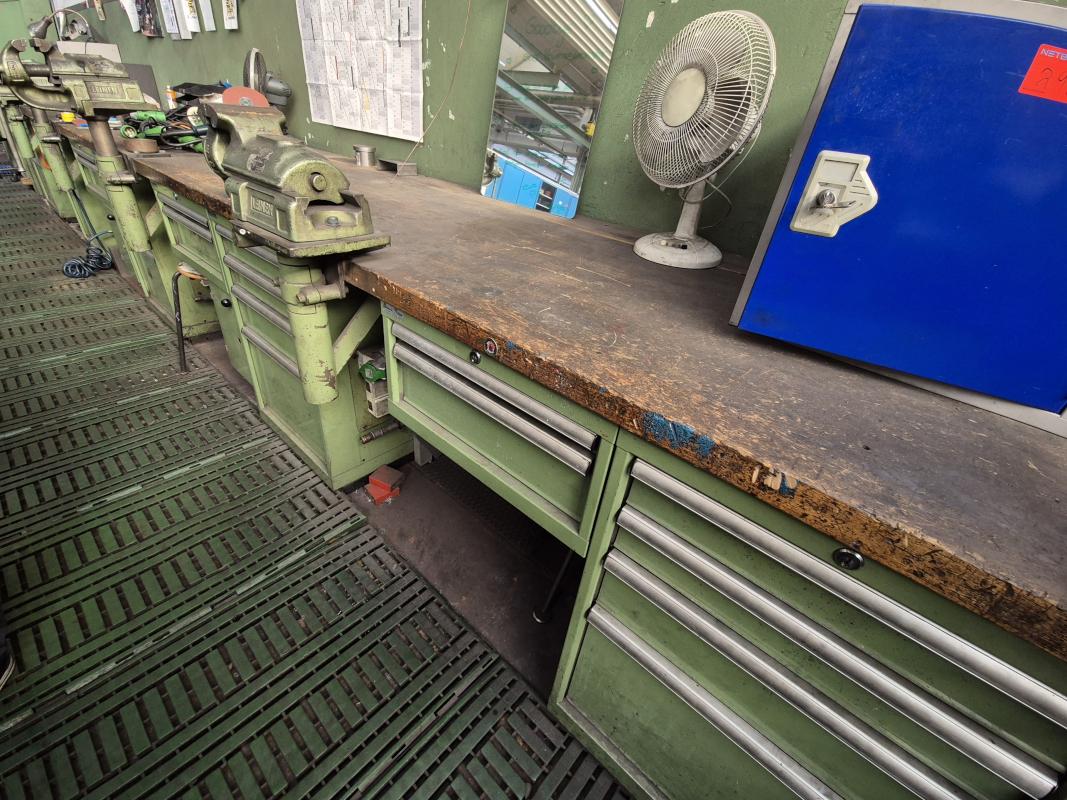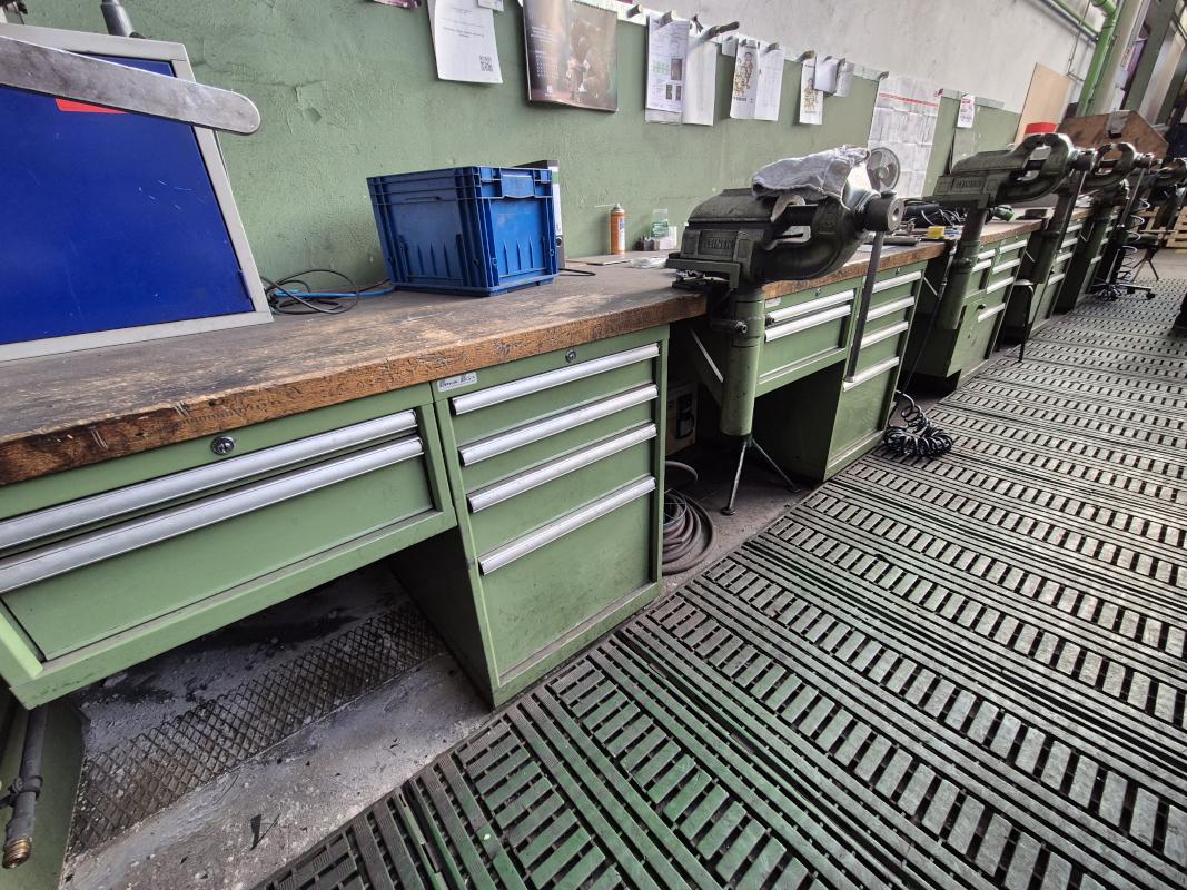 L 12.000 mm, 7 Schraubstöcke höhenverstellbar, 7 Unterschränke Fabr. Lista, Montagetisch, Ablageregal, Inhalt: elektr. Handmaschinen, Handwerkszeug, Zubehör, Kleinteile