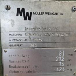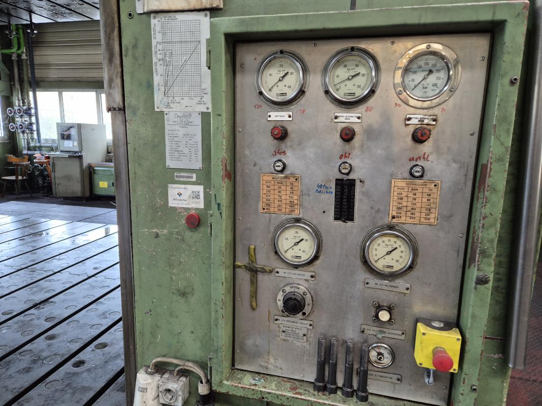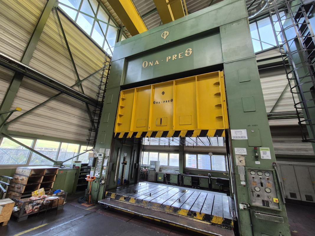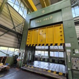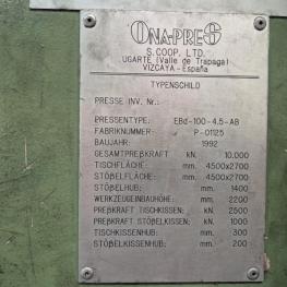 Fabrikat: ONA-PRES, Typ: EBd-100- 4,5-AB, Baujahr: 1992, Ser.-Nr. P-01125, Presskraft max. 1.000 t, Tischgröße 4.500 x 2.700 mm, Stößelhub 1.400 mm, Einbauhöhe 800 - 2.200 mm, Tisch Ziehkissen 60 - 250 t, Ziehkissenhub 300 mm, Stösselkissenhub 200 mm, Pressensteuerung, Zusatzsteuerung für Stössel, Schrankanlage 5-teilig mit Zubehör