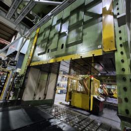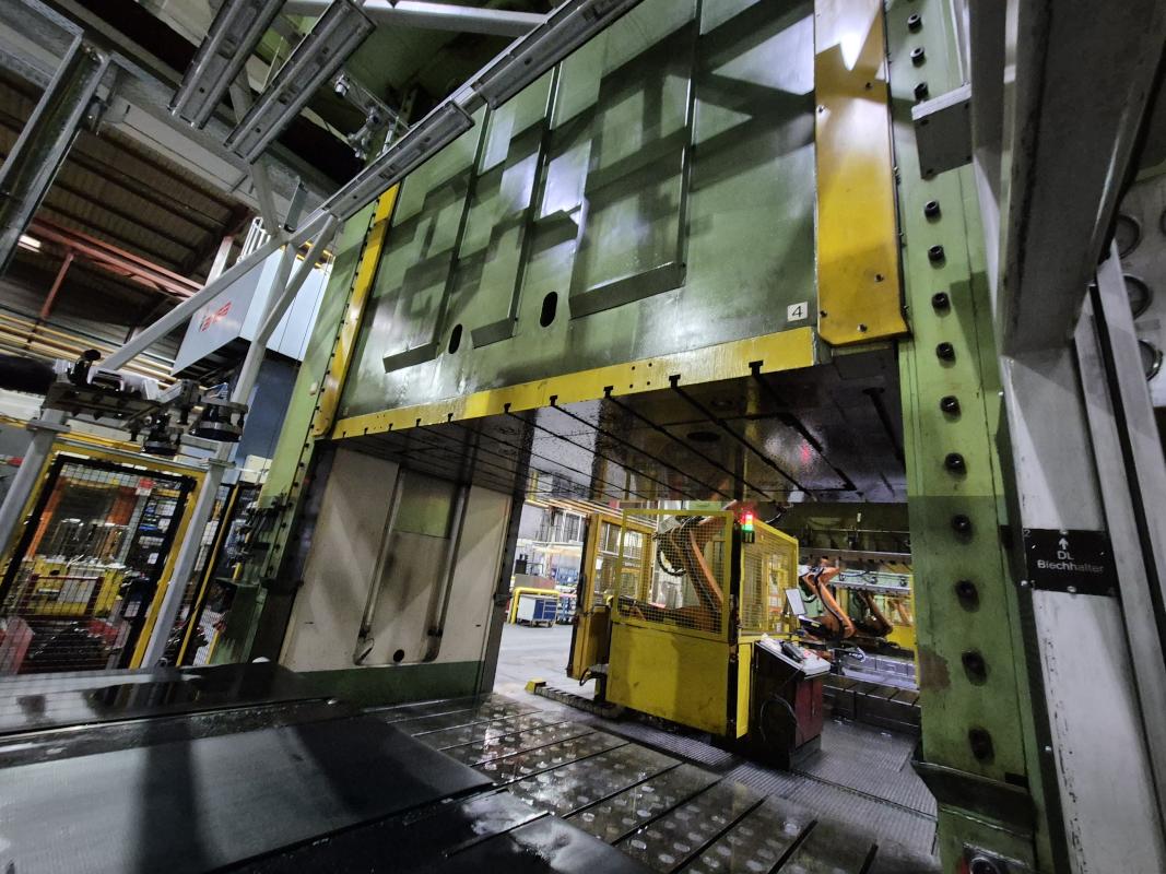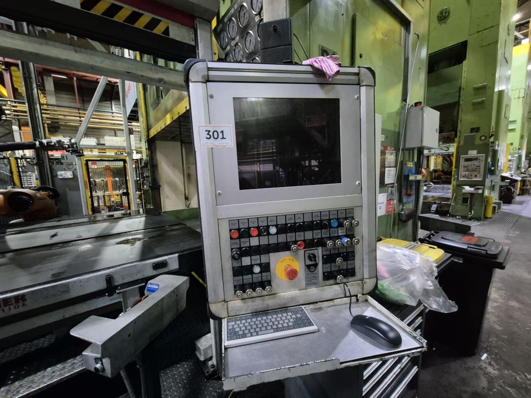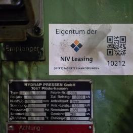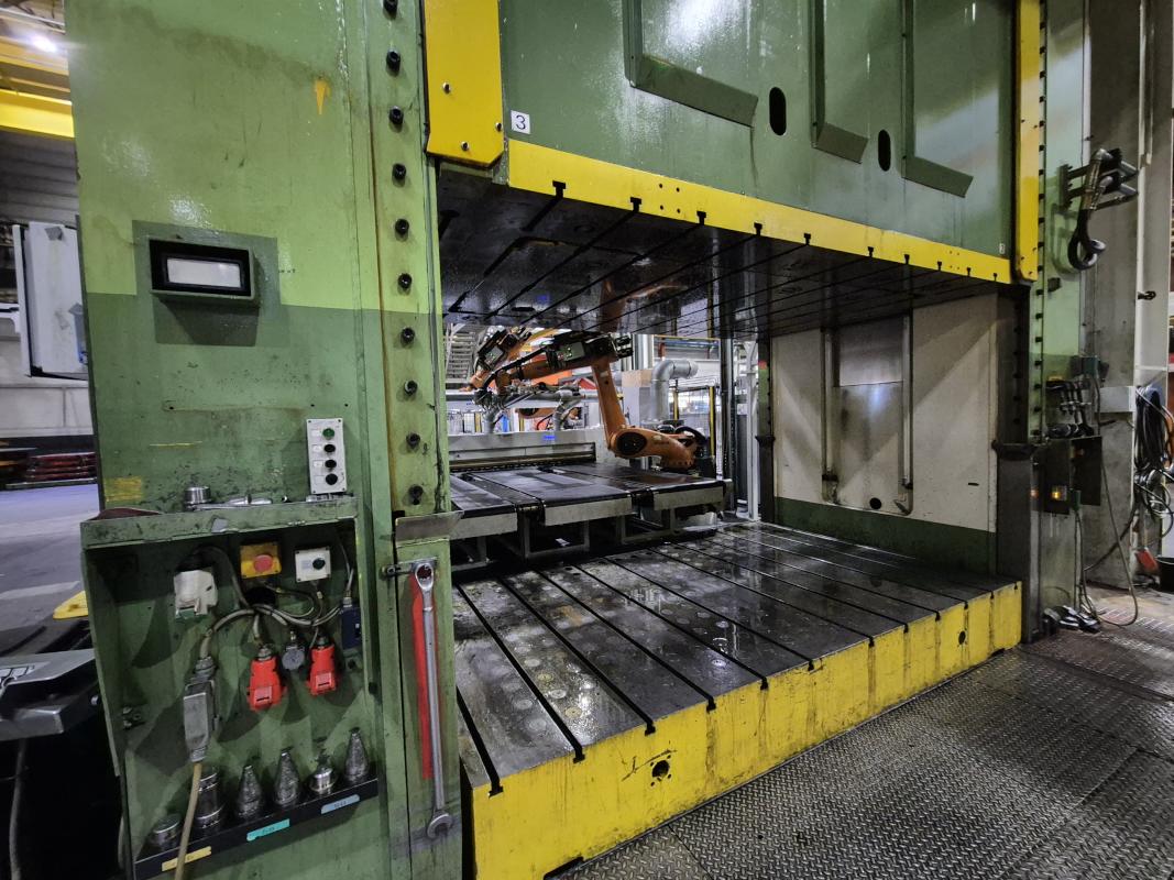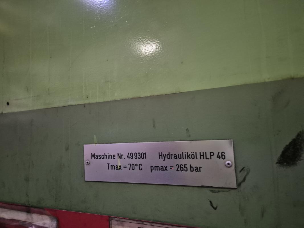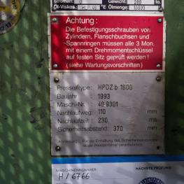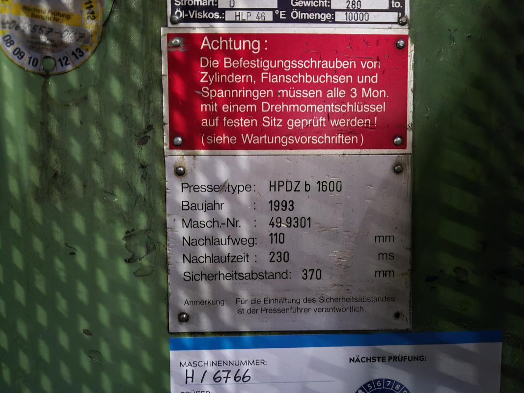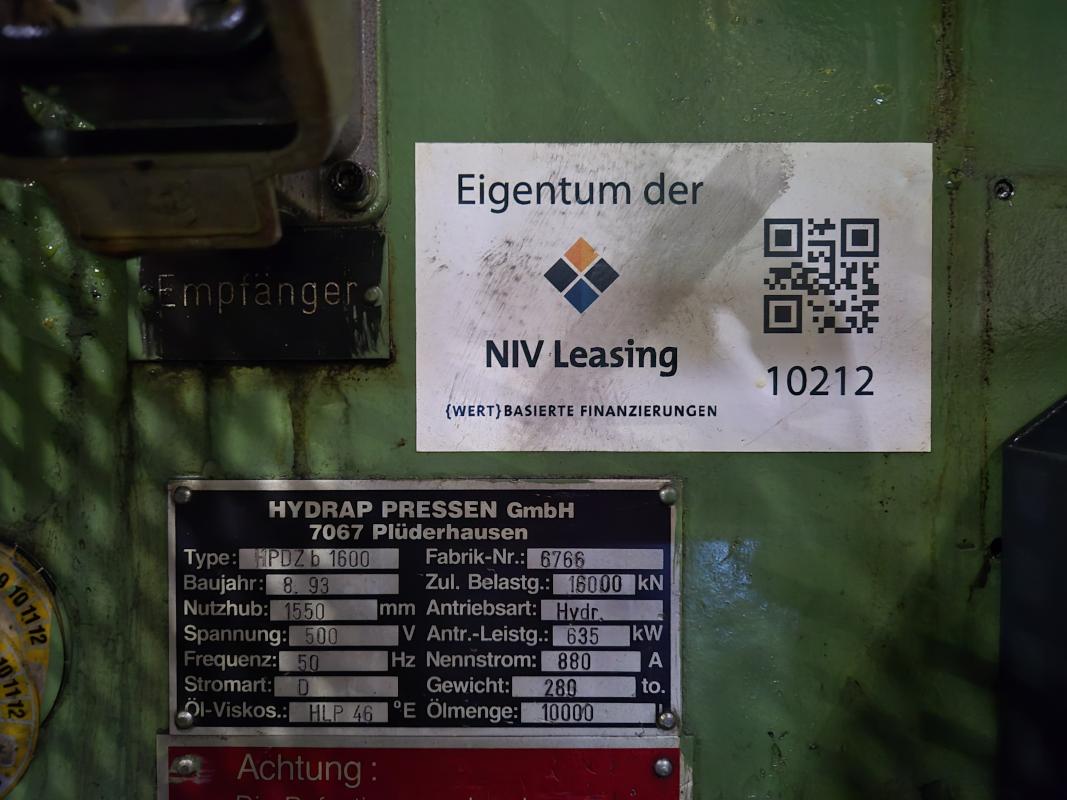 Fabrikat: HYDRAP, Typ: HPDZ b 1600, Baujahr: 1993, Ser.-Nr. 6766, Druck max. 1.600 t (Stössel 1.000 t + Blechhalter 600 t, koppelbar), Schiebetisch, 3.600 x 2.200 mm, Aufspannfläche Stössel 3.600 x 2.200 mm, Stösselhub 1.500 mm, Druck Tischziehkissen 36 - 360 t, Hub Tischziehkissen 450 mm, Pressensteuerung, Bedienpult, schwenkbar - Betriebsstunden Maschine EIN 69.569h Schaltschrank