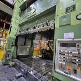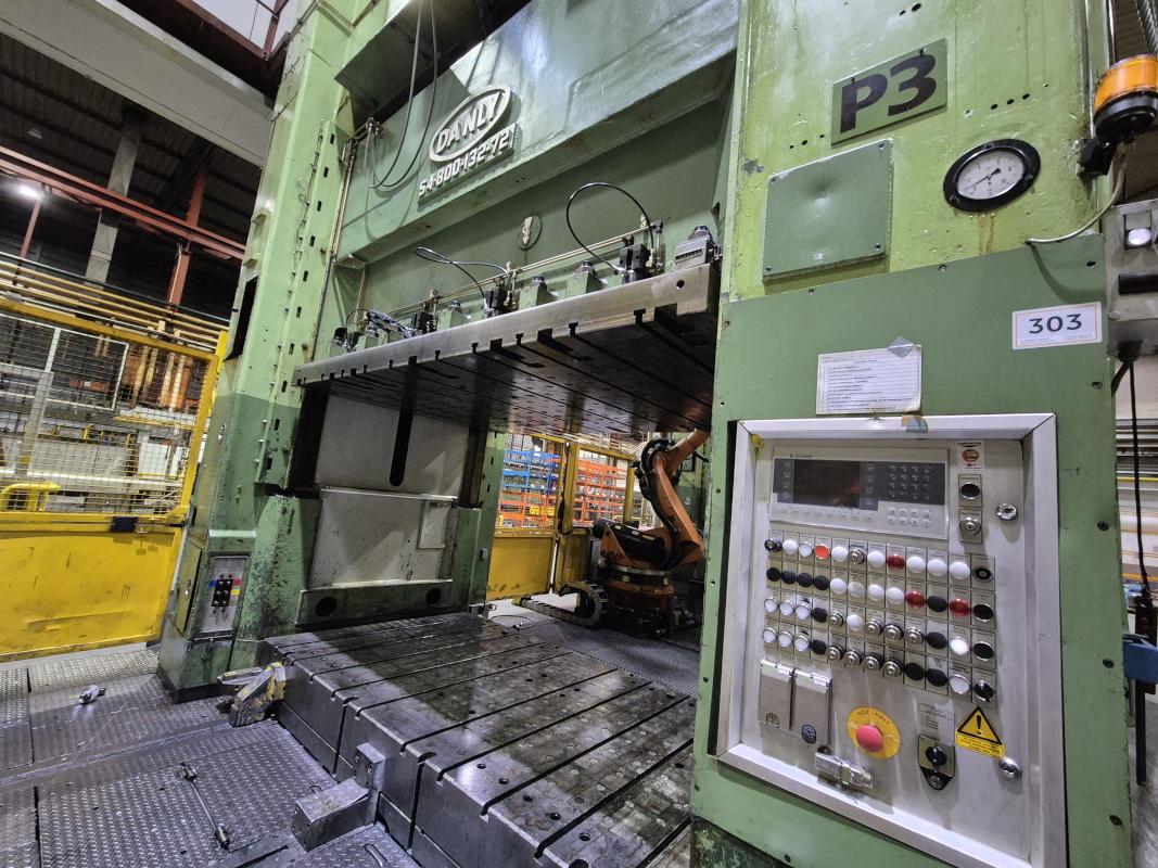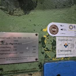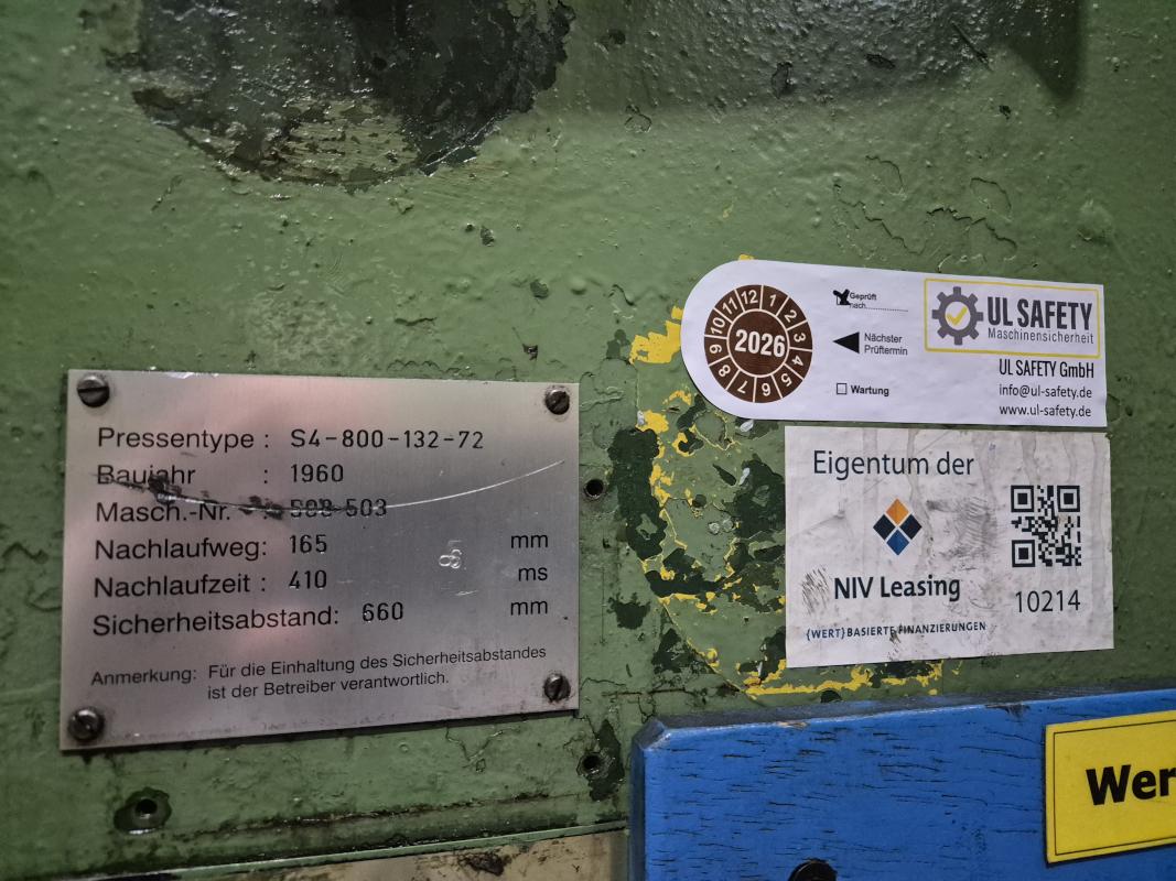 Fabrikat: DANLY, Typ: S4-800-132-72, Baujahr: 1960, Druck max. 800 t, Aufspannfläche Tisch 3.350 x 1.830 mm, Aufspannfläche Stössel 3.350 x 2.100 mm, Stößelhub 610 mm, Stößelverstellung 508 mm, Hubzahl 12 - 16 Hübe/min, Schiebetisch, Druck Tischziehkissen 11 - 113 t, Tischziehkissenhub 203 mm, Stösselkissenhub 152 mm, Pressensteuerung mit Operatorpanel, Fabr. Sütron (in 2008 nachgerüstet) hydr. Werkzeugspannung oben