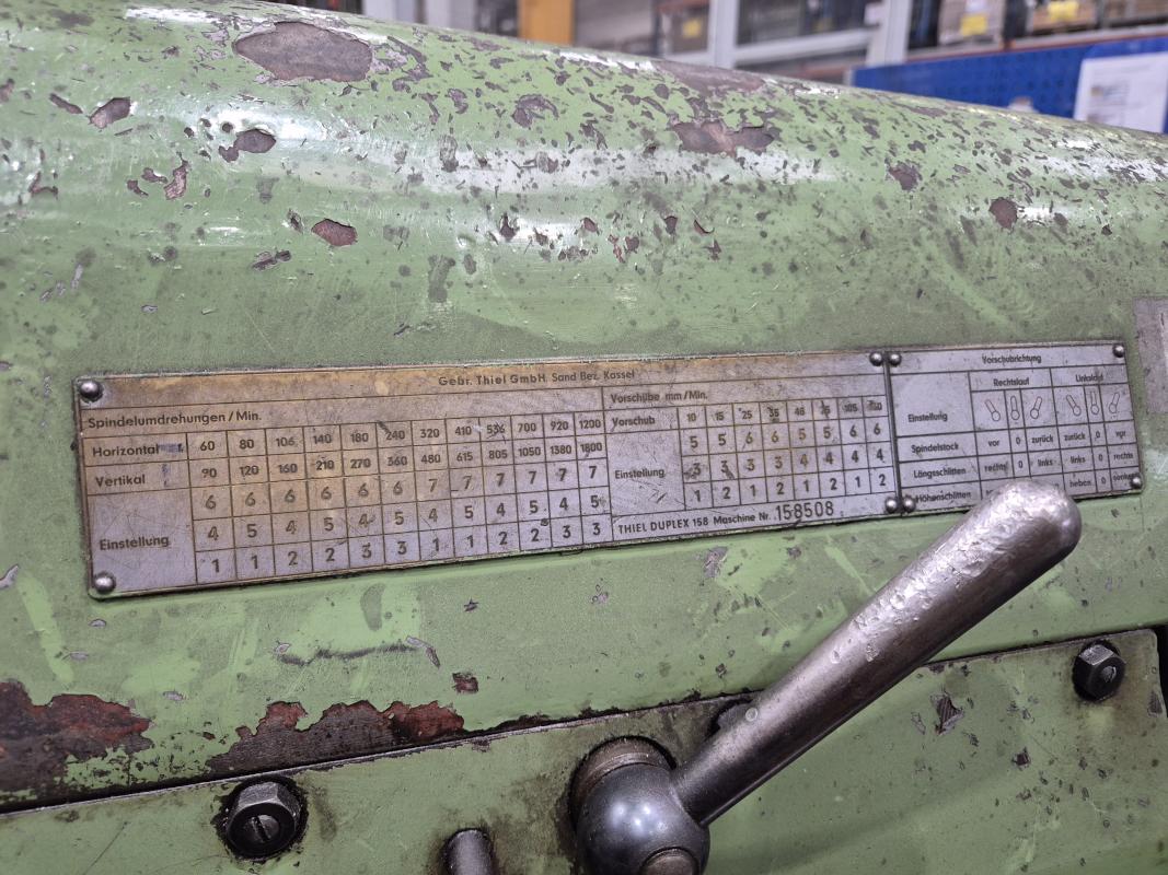 Fabrikat: THIEL, Typ: Duplex 158, Ser.-Nr. 21403, Spindeldrehzahl max. 1.800 U/min., Digitalanzeige, Tisch 700x 350 mm, Hochdruckmaschinenschraubstock,Backenbreite 120 mm, Rundtisch, 1 Zubehörschrank 1-türig mit Inhalt