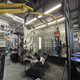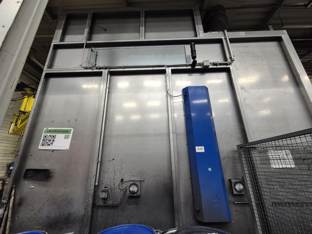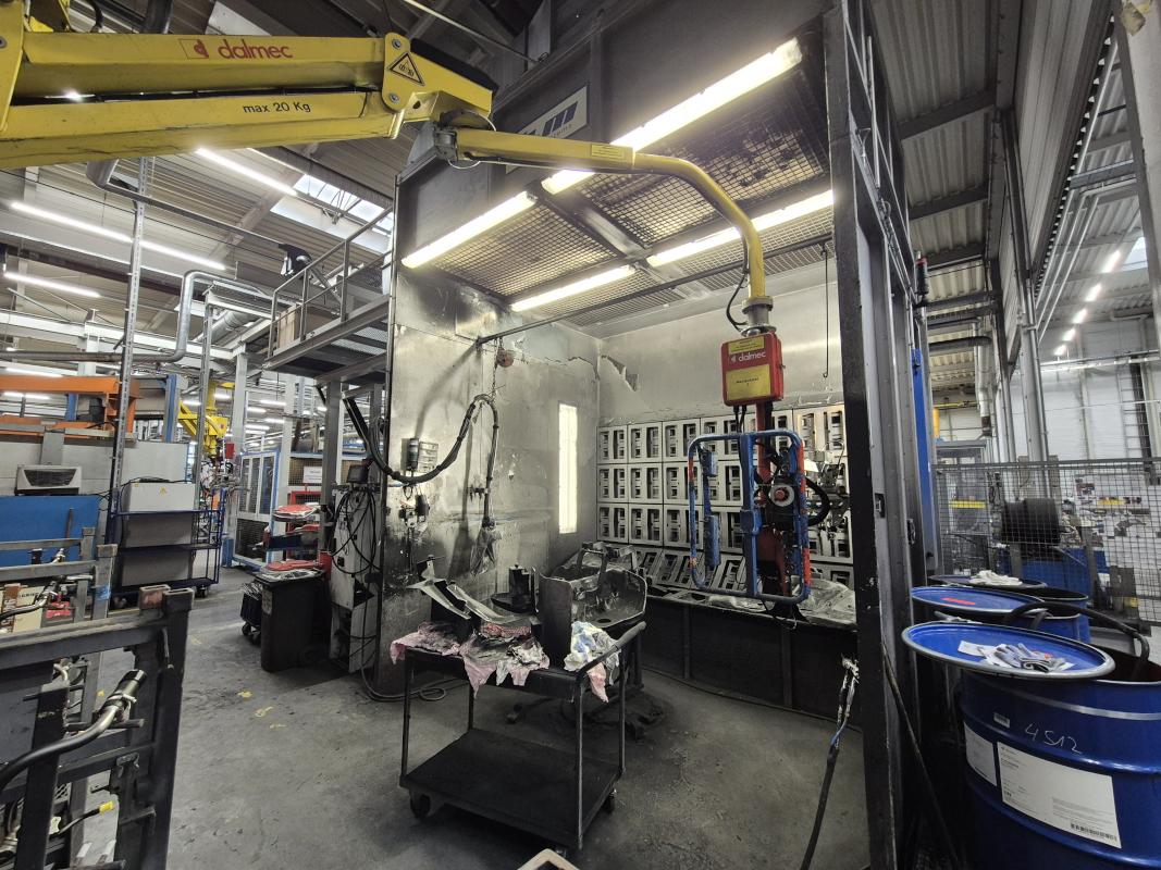 Fabrikat: B&M, Typ: Spritzstand, Baujahr: 2012, Ser.-Nr. 12.015, Werkstückabmessungen max. 1.500 x 300 x 500 mm, Abluftfilter mit Luftleistung 15.000 m³/Std., Handlingssystem, Fabr. Dalmec, Tragfähigkeit 20 kg (Manipulator 3), Terosonpumpe, Fabr. Atlas Copco, Dosierstation, Fabr. SCA, Manipulator, Fabr. Strödter, Abluftanlage, Fabr. Alko, Podestanlage, Schalt- und Steuerschränke, Zubehör
