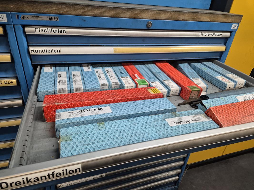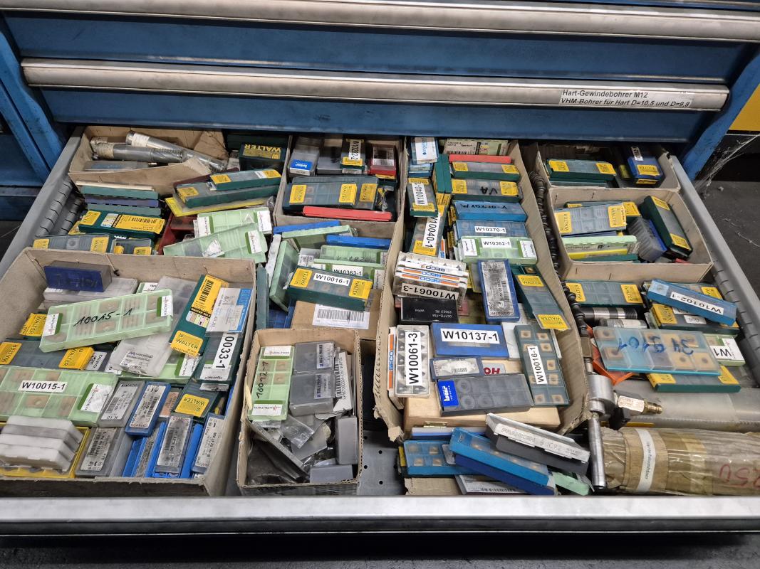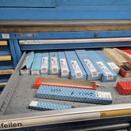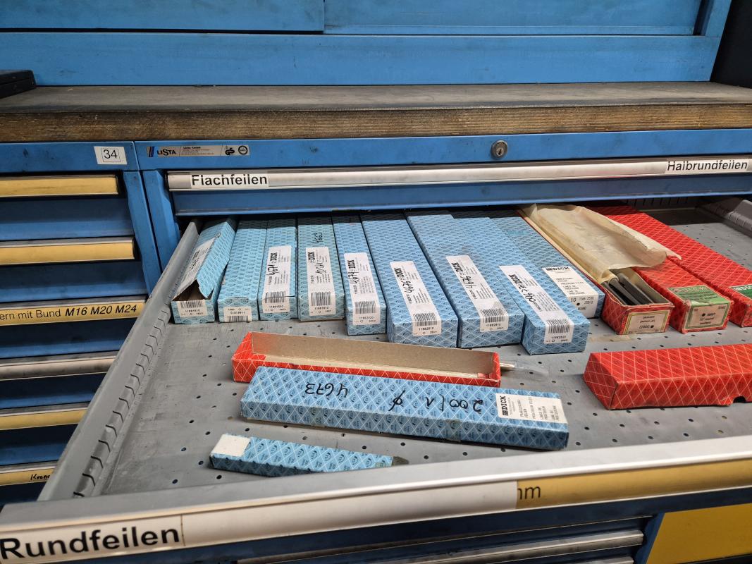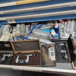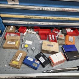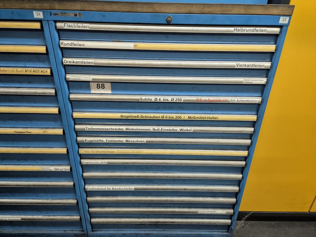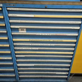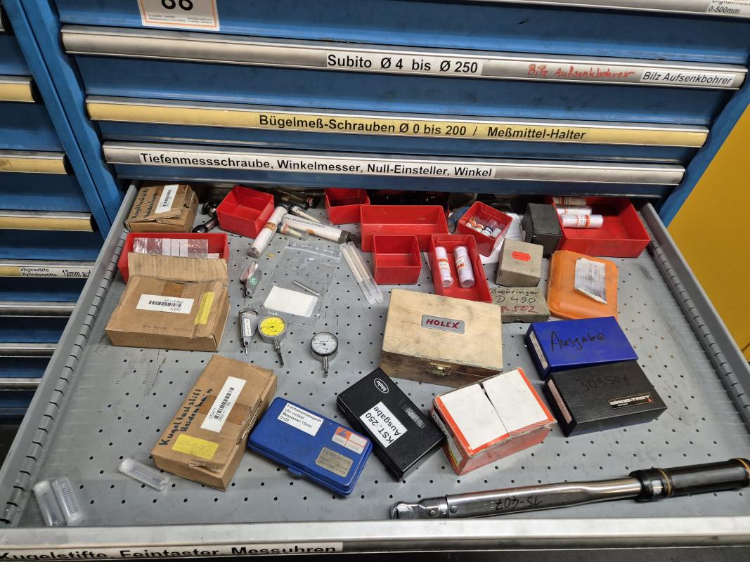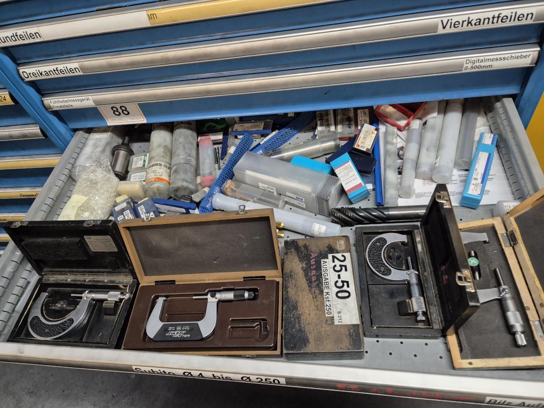 Fabrikat: LISTA, B 1.000 mm, 10 Auszüge, Inhalt: Feilen, Tiefenmessschieber, Bügelmessschrauben, Messerköpfe, 2 Messtaster, Wendescheidplatten