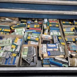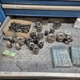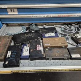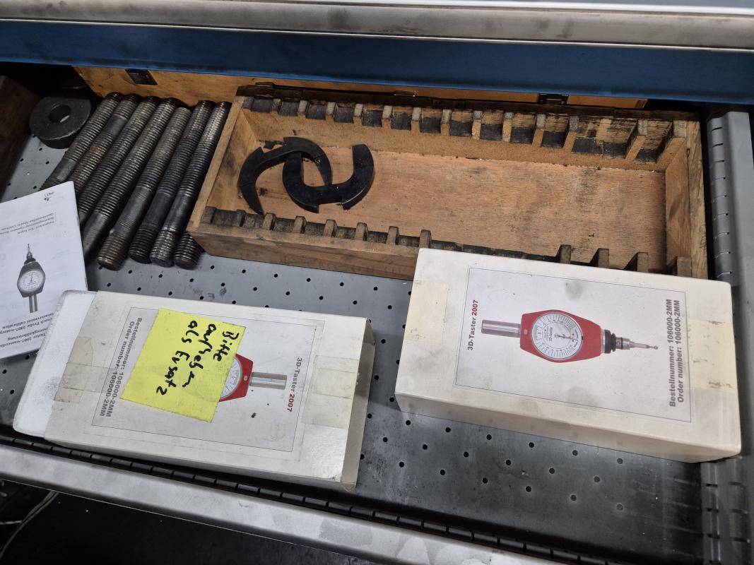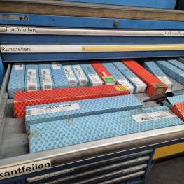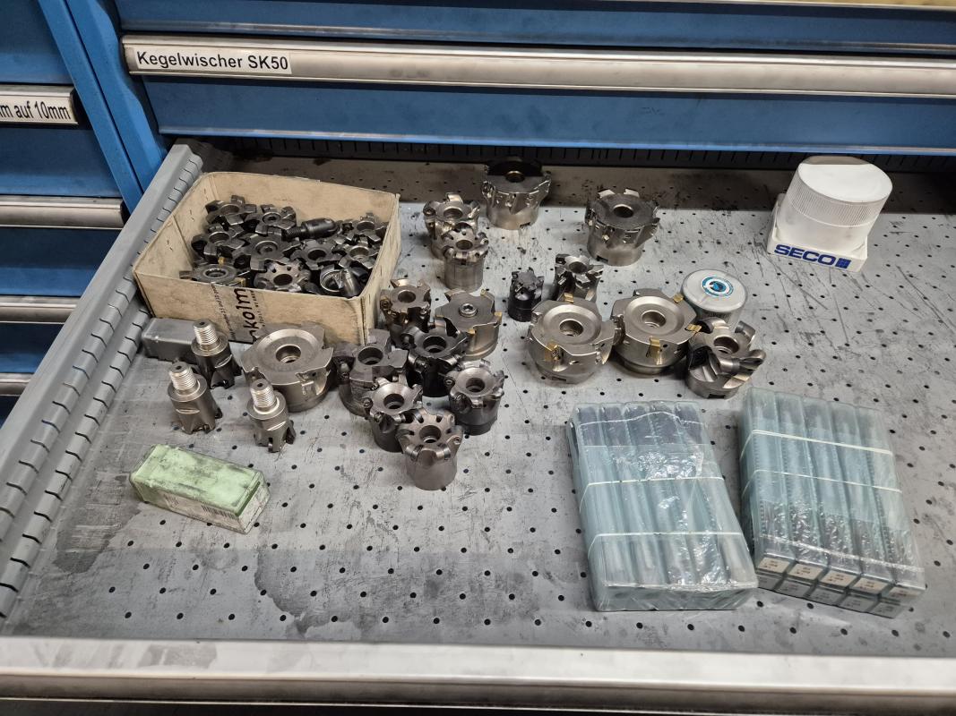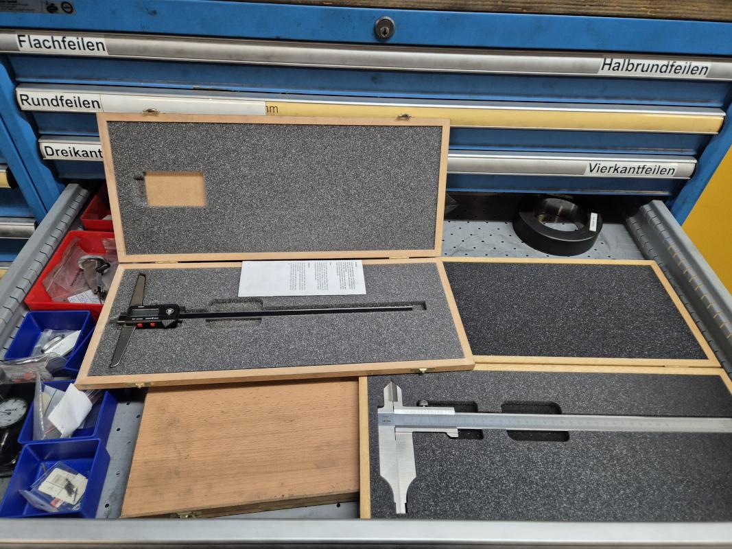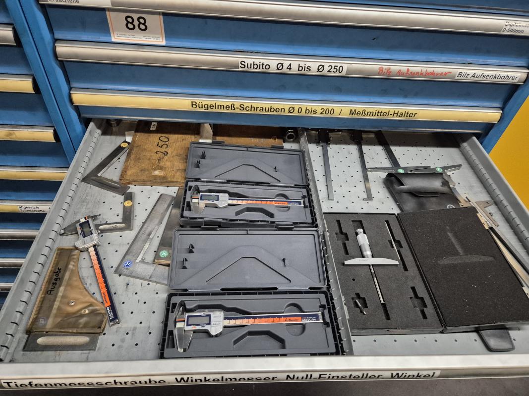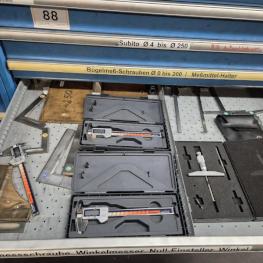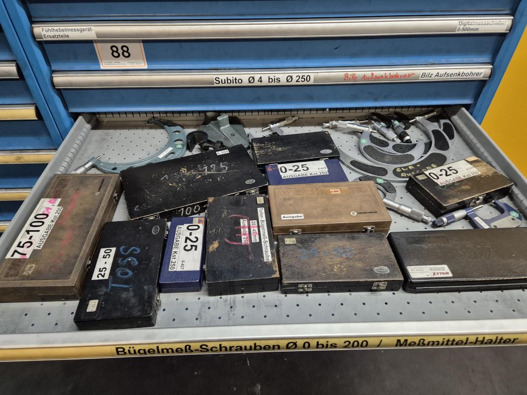 Fabrikat: LISTA, B 1.000 mm, 10 Auszüge, Inhalt: Feilen, Tiefenmessschieber, Bügelmessschrauben, Messerköpfe, 2 Messtaster, Wendescheidplatten