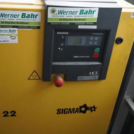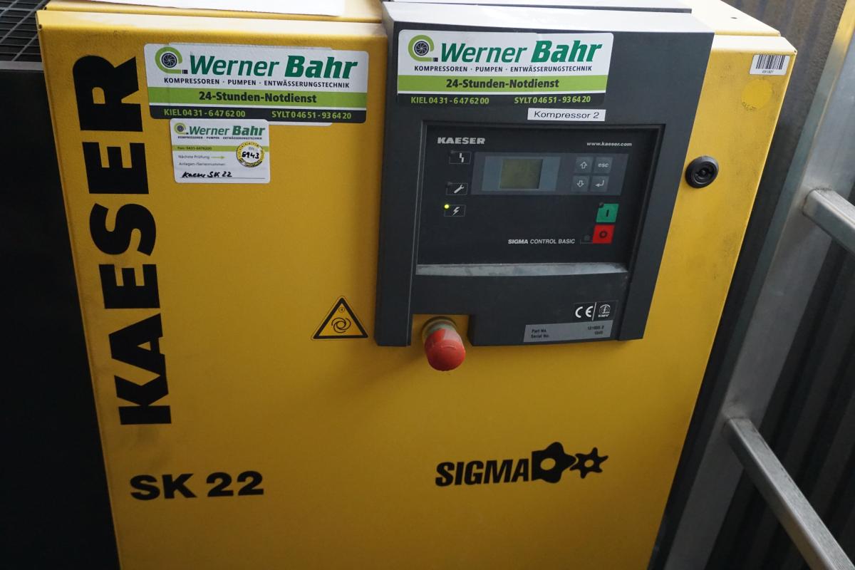 Fabrikat: KAESER, Typ: SK22, Baujahr: 2012, Serien-Nr.: 1545, Nennleistung 11,0 kW, Motordrehzahl 2.960 U/min, max. Betriebsüberdruck 11 bar