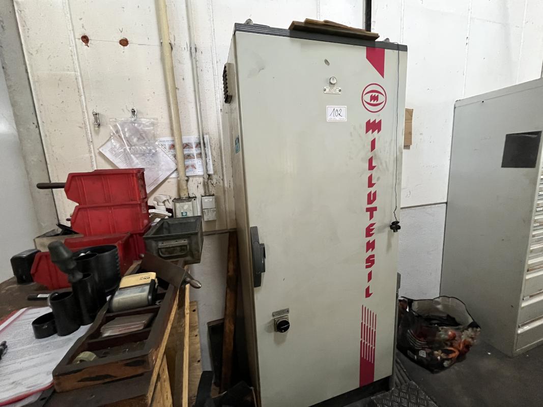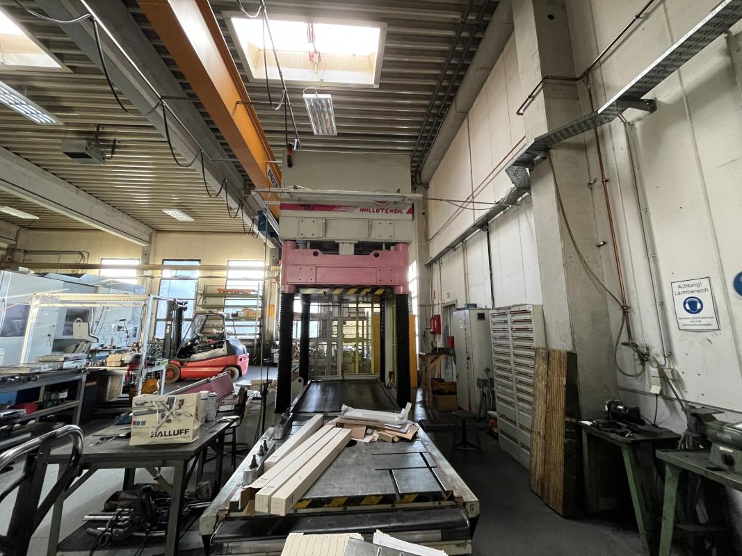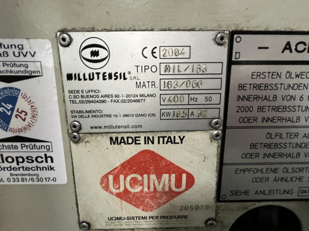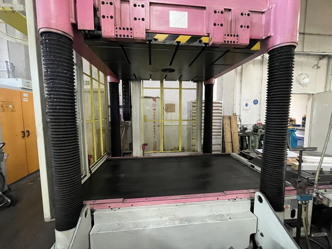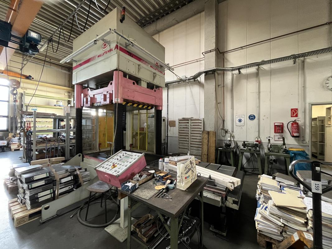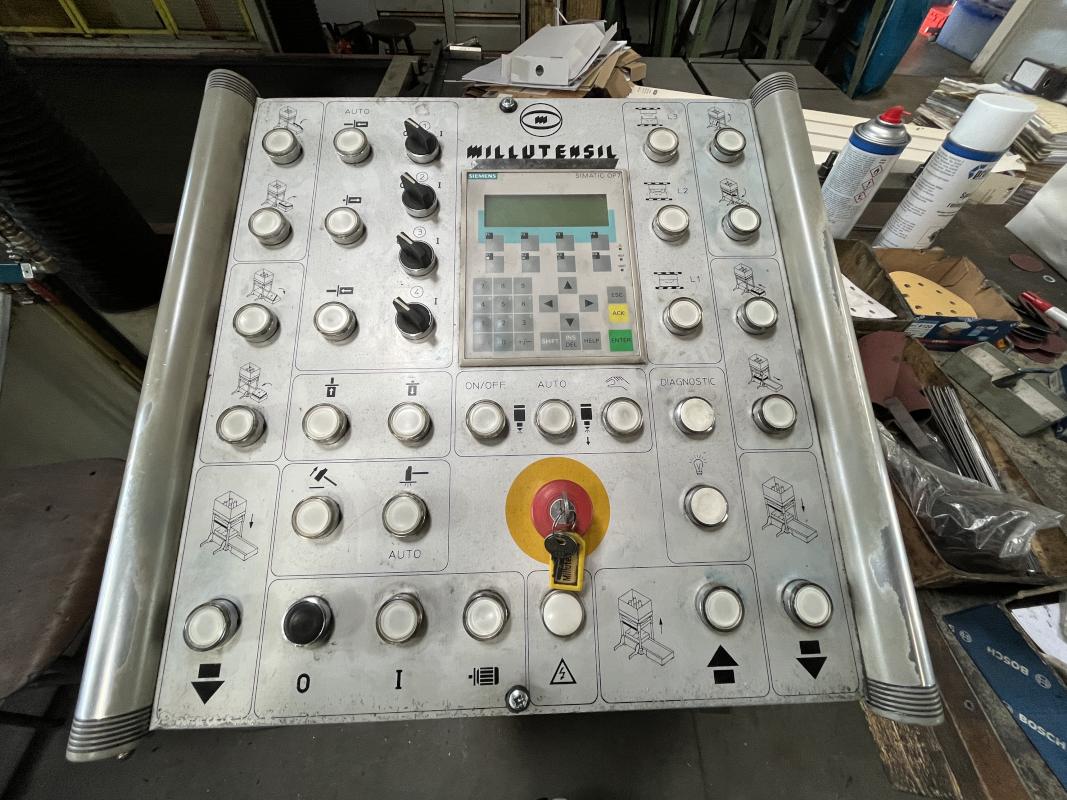Fabrikat: MILLUTENSIL, Typ: MIL 163, Baujahr: 2004, Steuerung, Fabr. Siemens, Typ Simatic OP7, Presskraft 150 t, Öffnungskraft 30t, Werkstückgewicht unten/oben 16 t/15 t, Tischgröße 1.600 x 1.260 mm, Hubhöhe 1.400 mm, Schaltschrank, Arbeitstisch