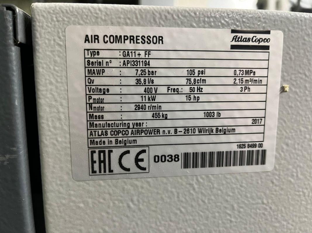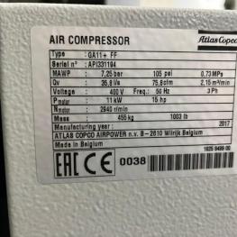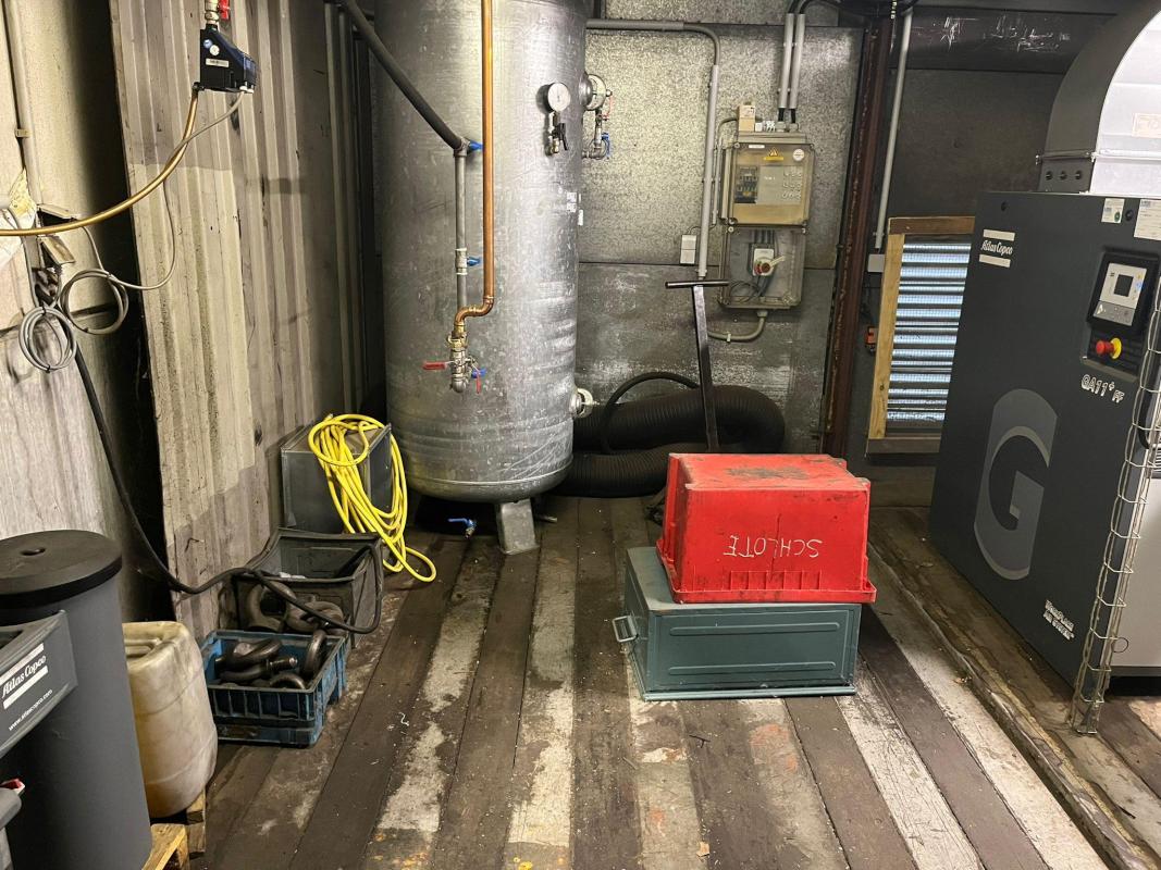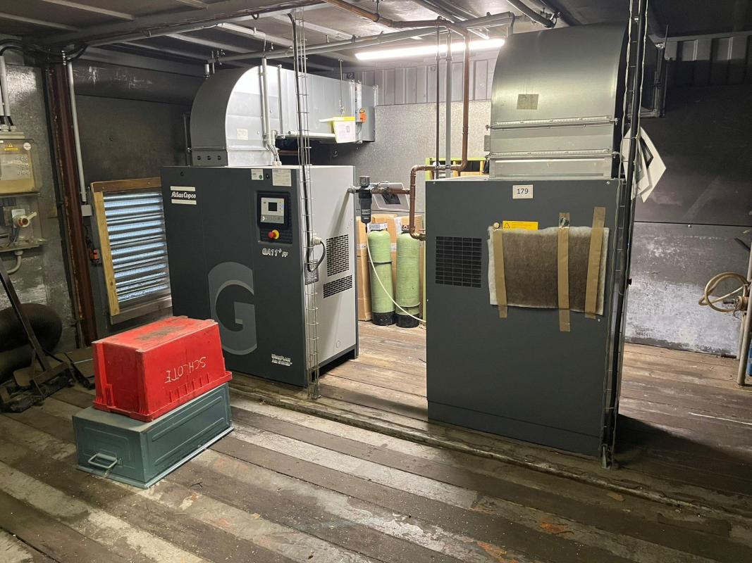 Fabrikat: ATLAS COPCO, Typ: GA15VSD, Baujahr: 2017, Kompressorsteuerung, Druck 12,75 bar, Leistung 15 kW, Liefermenge 2,5 m³/min, Schraubenkompressor, Fabr. Atlas Copco, Typ GA11+FF, Bj. 2017, Leistung 11 kW, Druck 7,25 bar, Kompressorsteuerung, Druckluftkesse, Fabr. Huch, Bj. 2001, Inhalt 1.000 l, Wechsellaststeuerung, Fabr. Atlas Copco, Typ ES 6