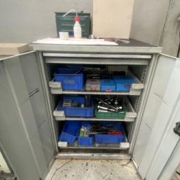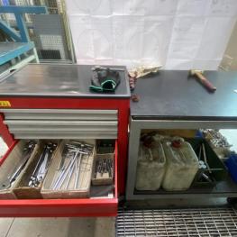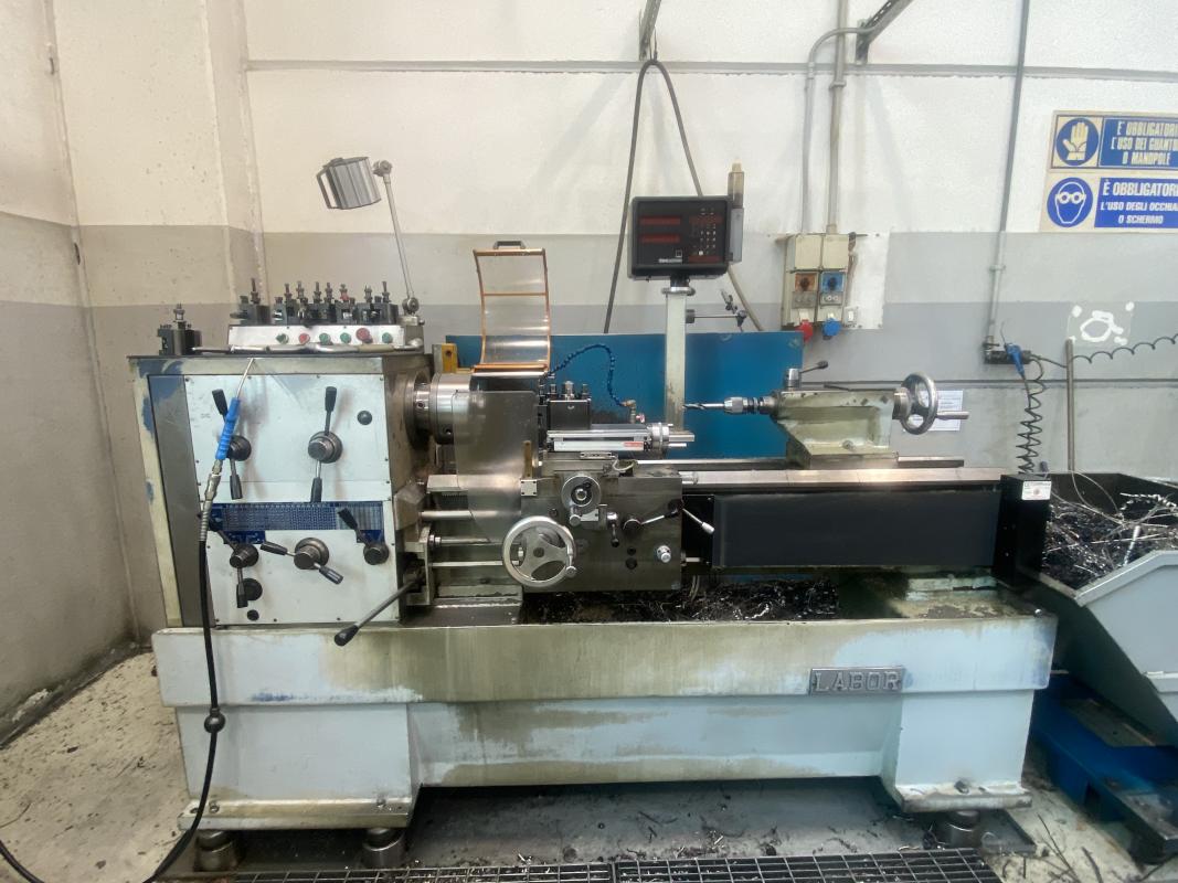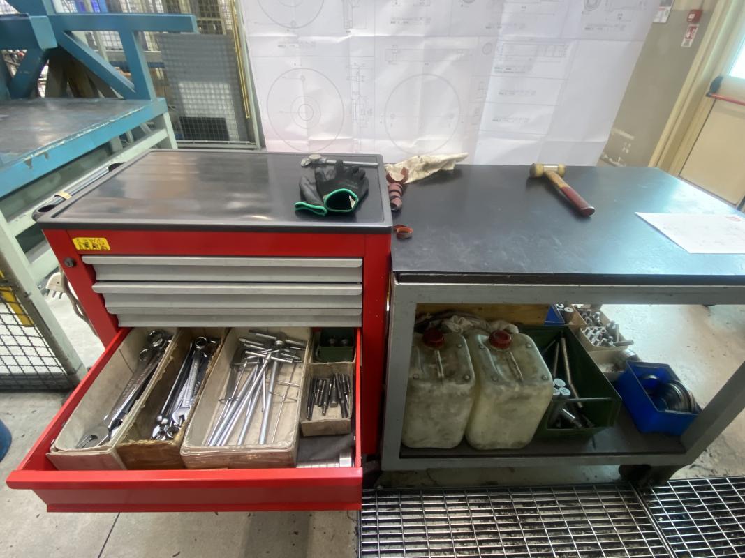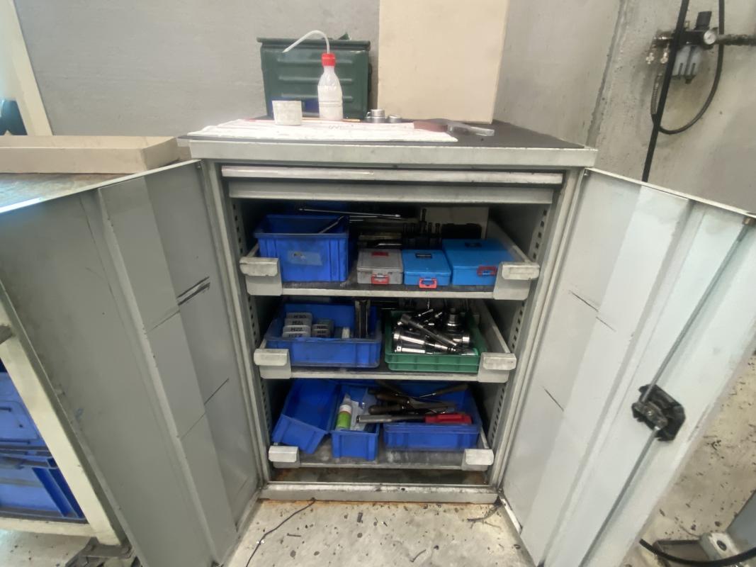 Fabrikat: LABOA, Spitzenhöhe/-weite 200 x 1.000 mm, Digitalanzeige, Fabr. Anilam, Schnellwechselstahlhalter, Dreibackenfutter, Reitstock, Werkzeugschrank, 2-türig, Werkzeugwagen, rot, Tischwagen, Inhalt: Handarbeitszeuge, Rüstwerkzeuge, 10 Stahlhalterkassetten