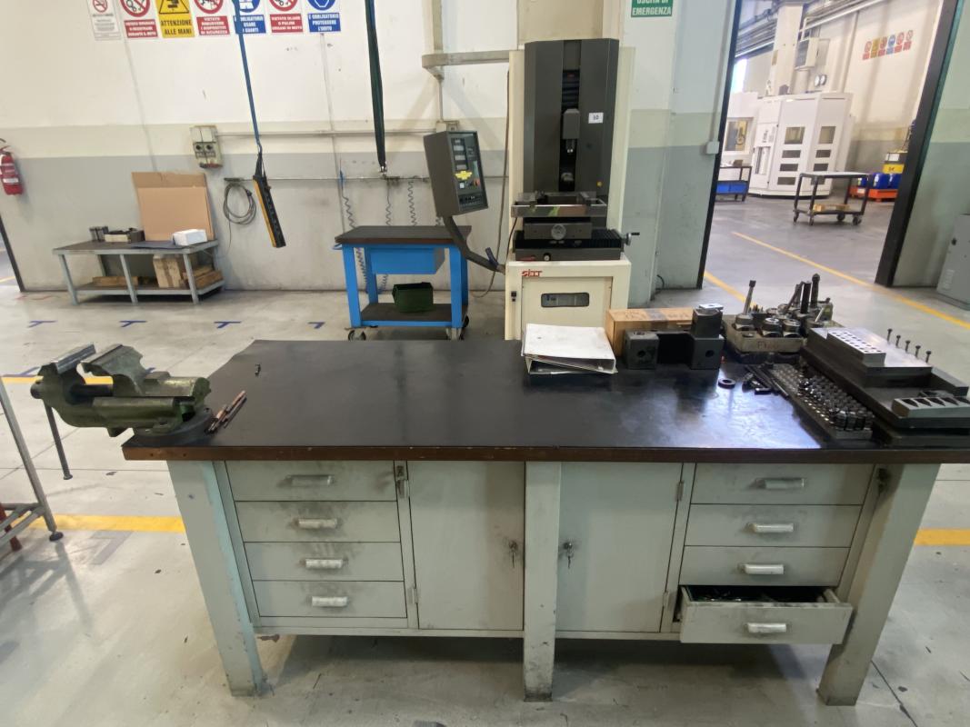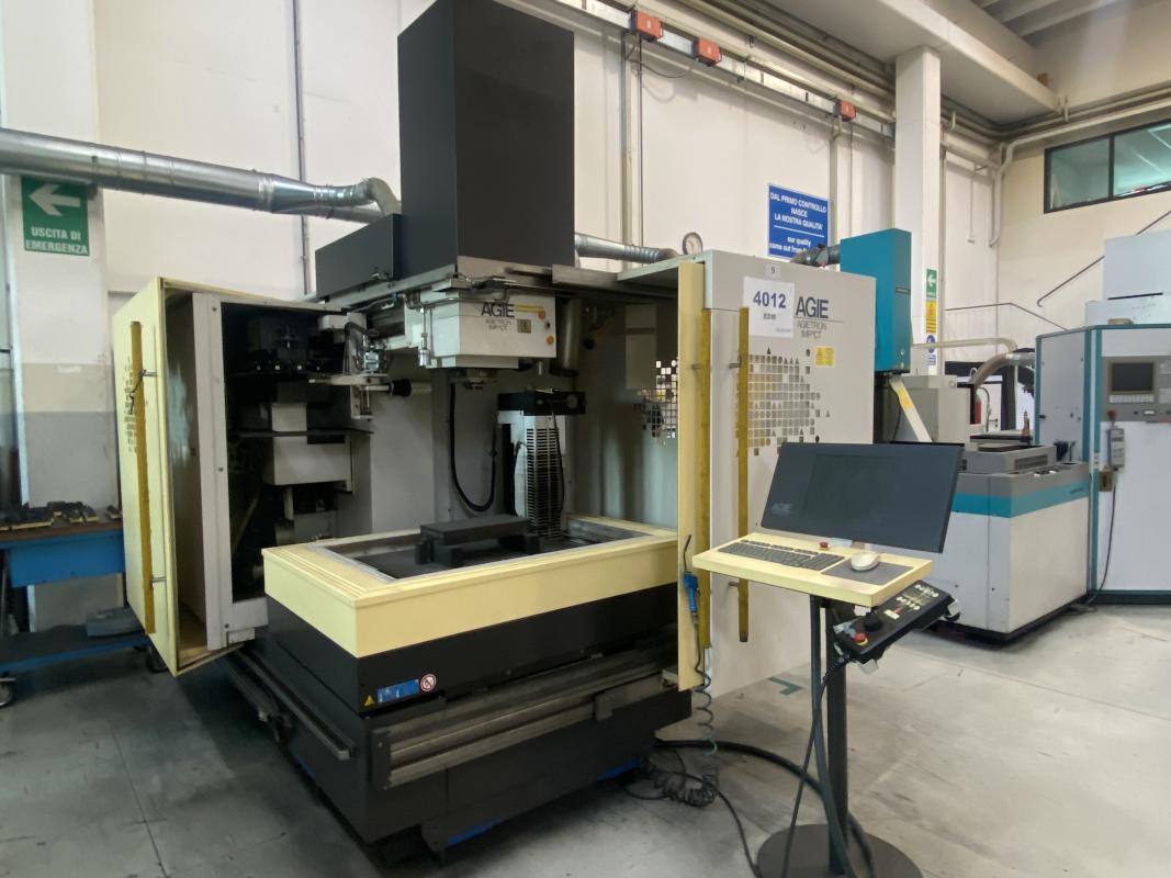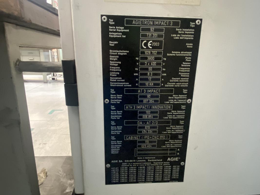 Fabrikat: AGIE, Typ: Agietron Impact 3, Baujahr: 2003, Ser.-Nr. 92, Steuerung, Agie Agievision Impact, 4 Achsen, Verfahrwege X/Y/Z 500 x 530 x 500 mm, Elektrodenwechsler, Werkzeugspannsysten Erowa, Dielektrikumanlage, Löschanlage, Typ Smartline, Werkbank, 2.000 x 750 mm, Inhalt: Spannfutter, Fabr. Erowa, Rüstwerkzeuge, Zubehör