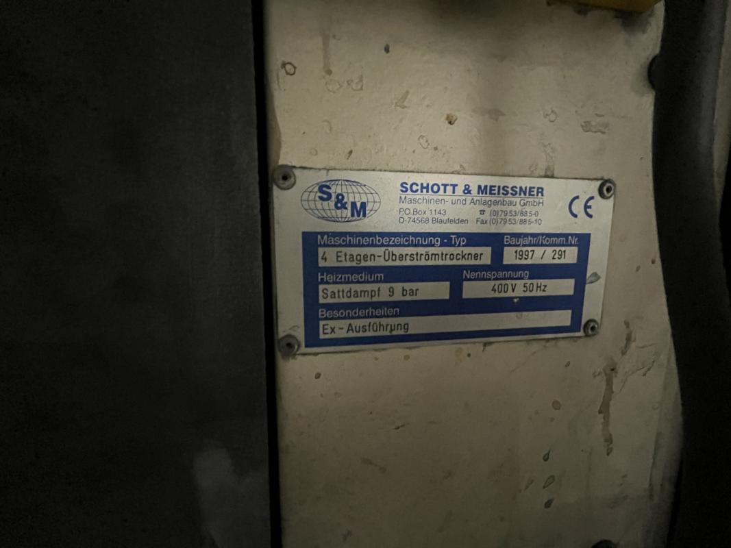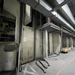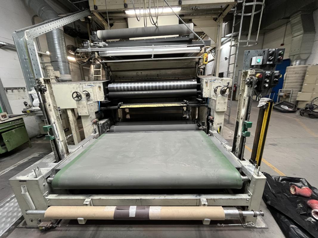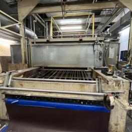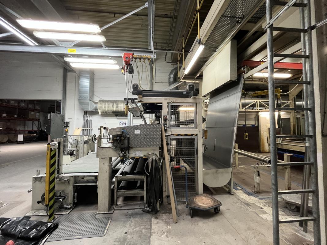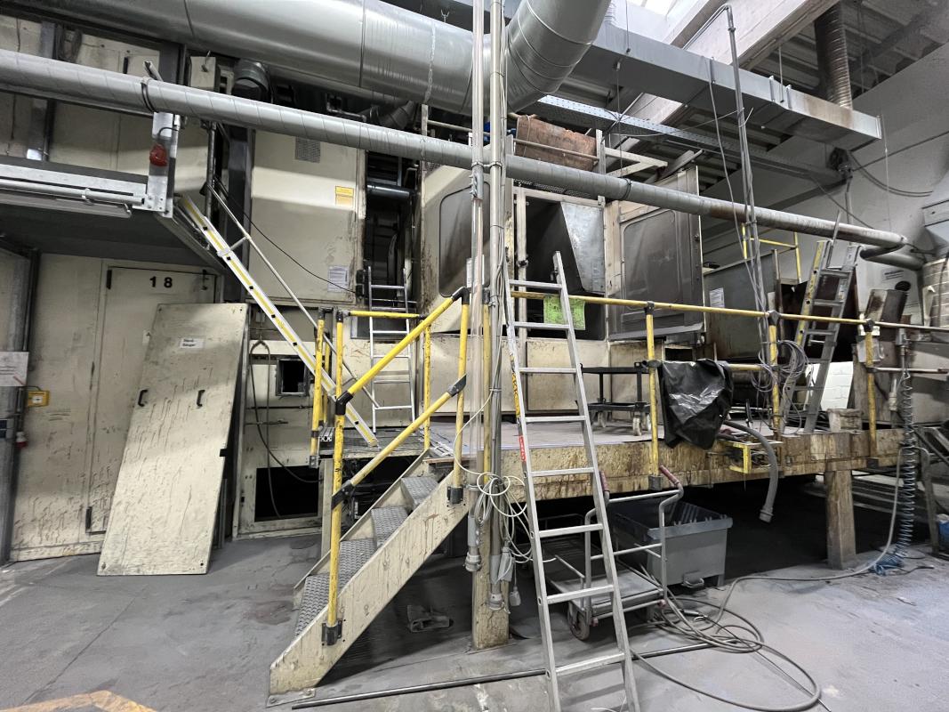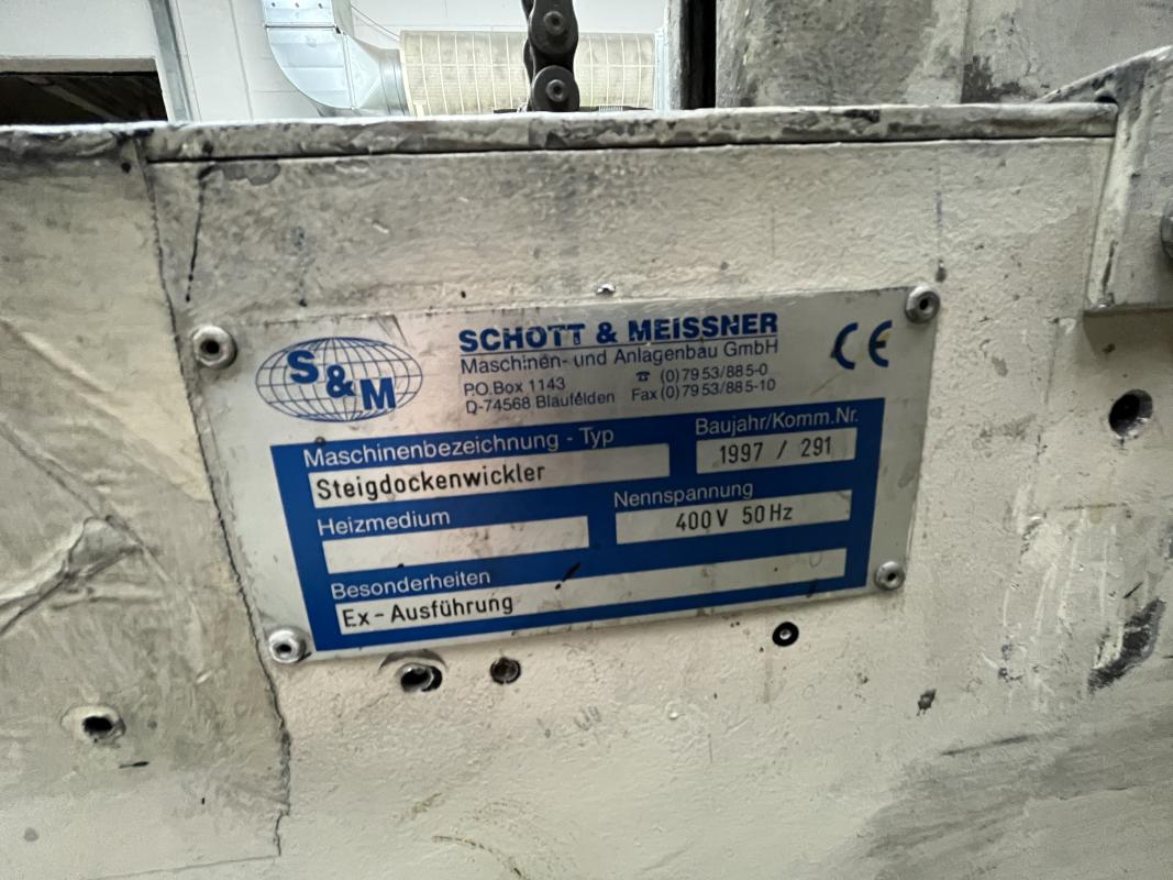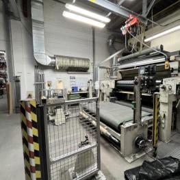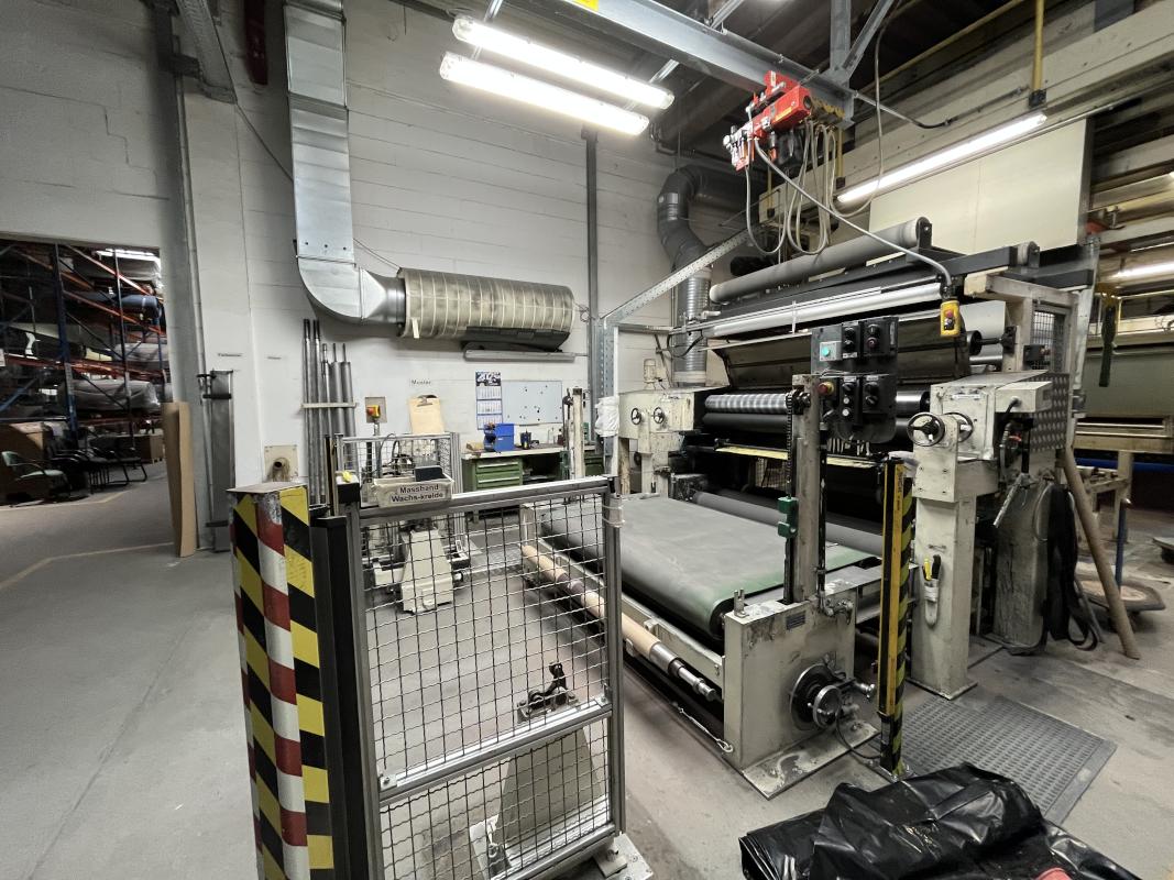 Fabrikat: SCHOTT & MEISSNER, Baujahr: 1997, best. aus: Steigdockentwickler, Bj. 1997, Ser.-Nr. 291, Druckwerk, Bj. 1997, Aufwickeleinheit, Vliesabwickelgestell, Sprühkabine 2, automatische Sprüheinheit, 4 Sprühdüsen, Airless-Spritzanlage, Fabr. Wagner, Typ Icebreaker, Übergabestrecke, Sprüh-/Flatschstation, Streukabine 1, Überströmtrockenofen, 4 Etagen, Bj. 1997, Sattdampf 9 bar, Ex-Ausführung, Gesamtlänge ca. 38 m, Streukabine 2, Vlies-Sprühanlage 2, Umlenkeinheit, Airless-Spritzanlage, 4 Sprühdüsen, Stempelmaschine, Bj. 1997,