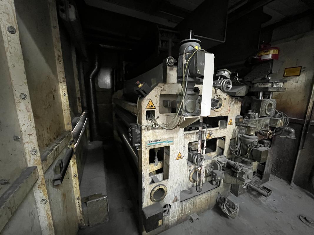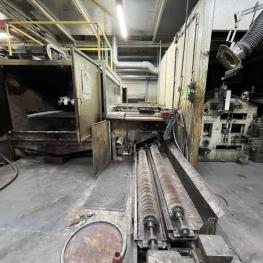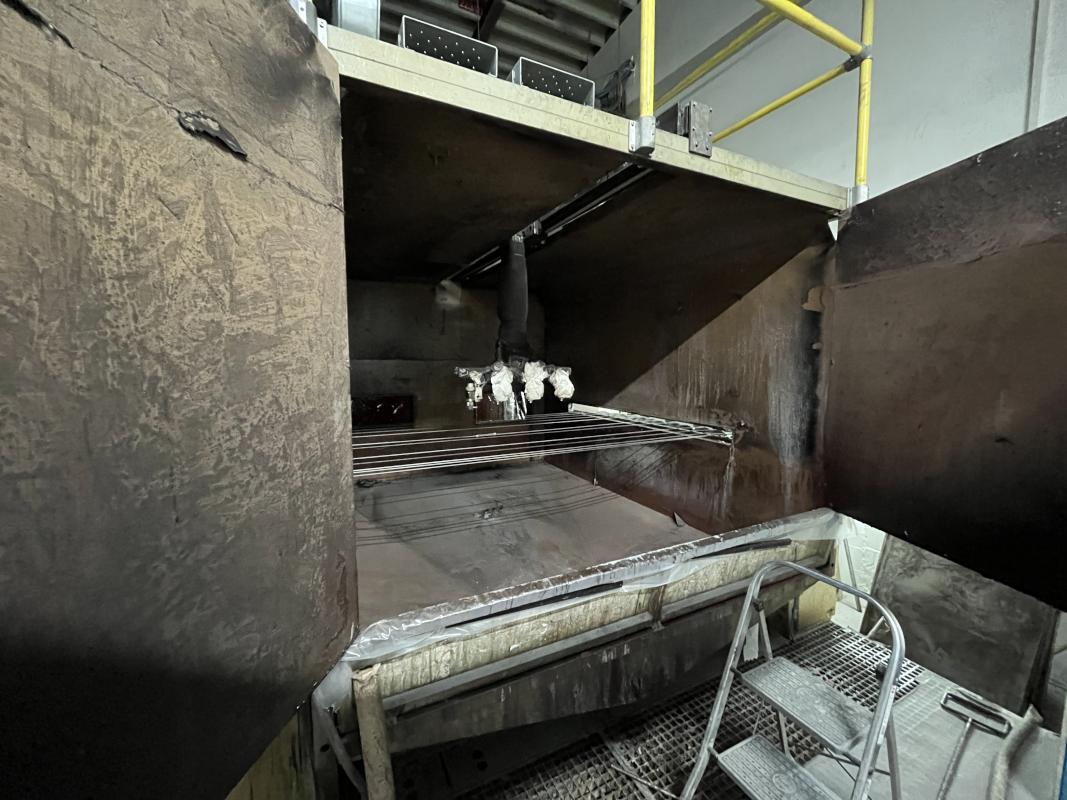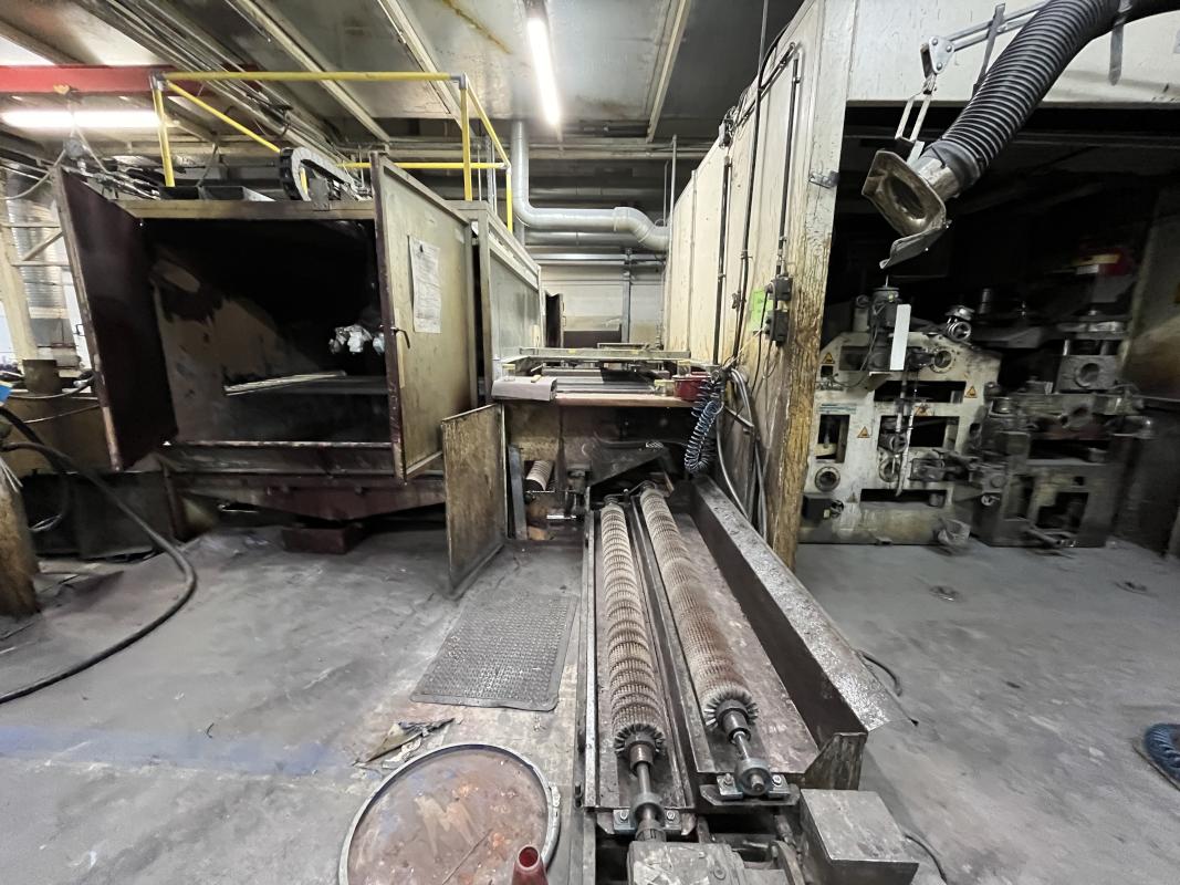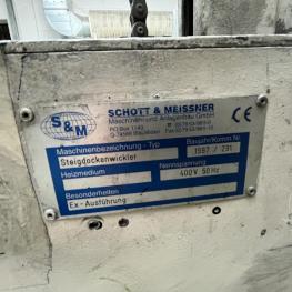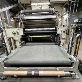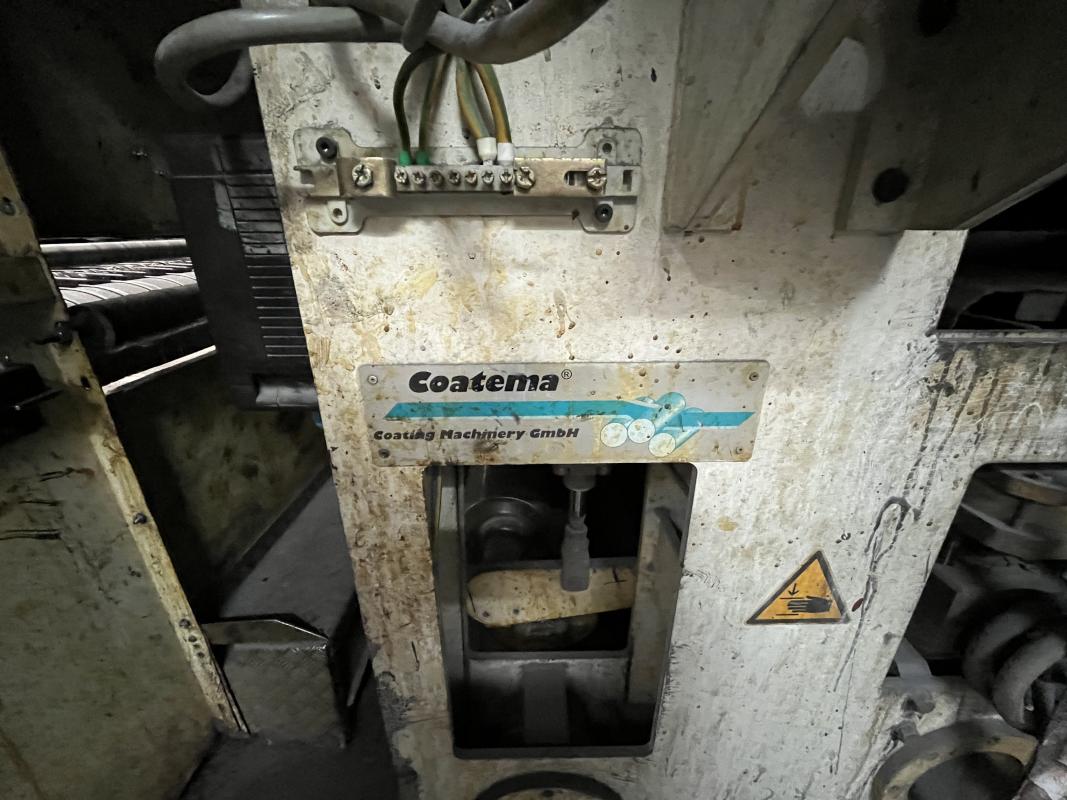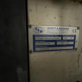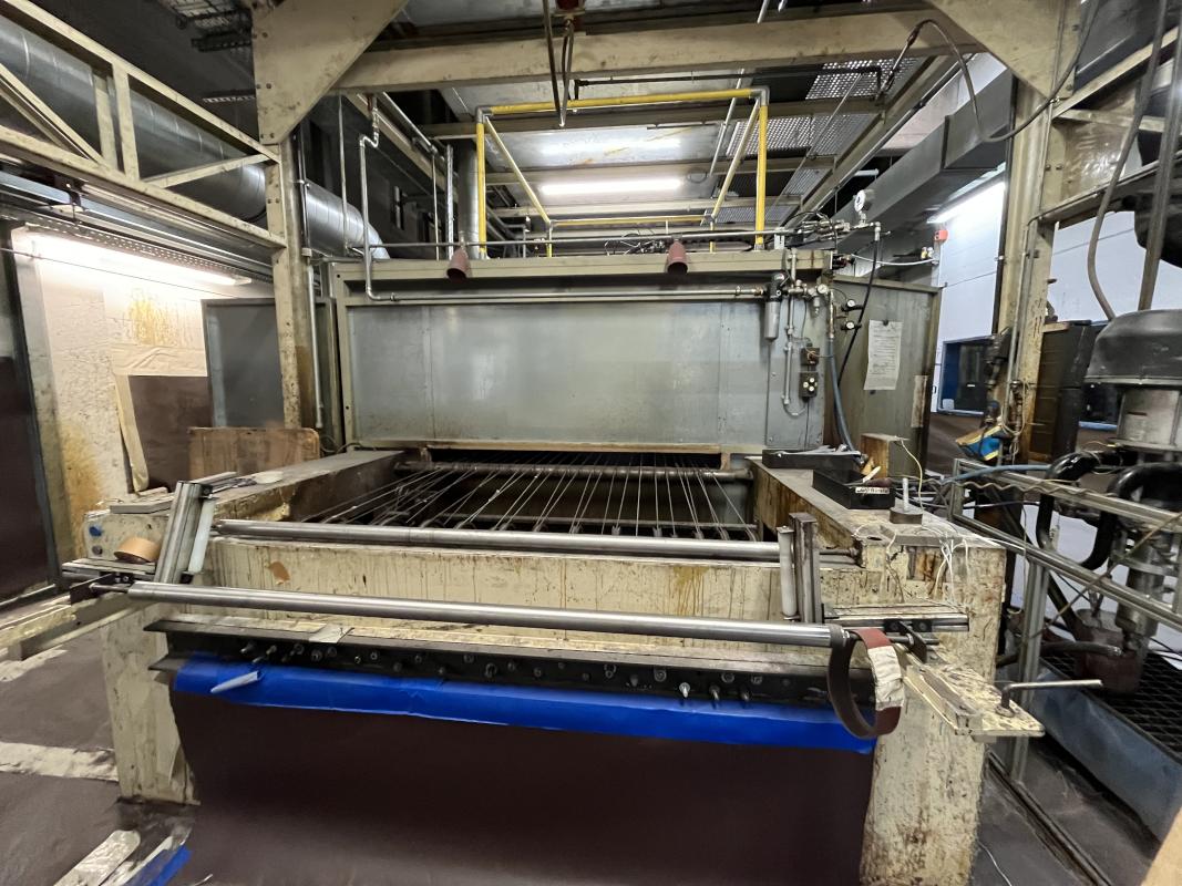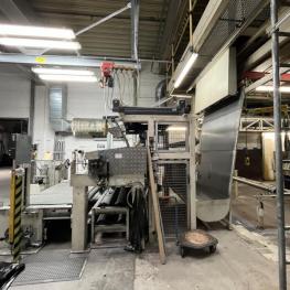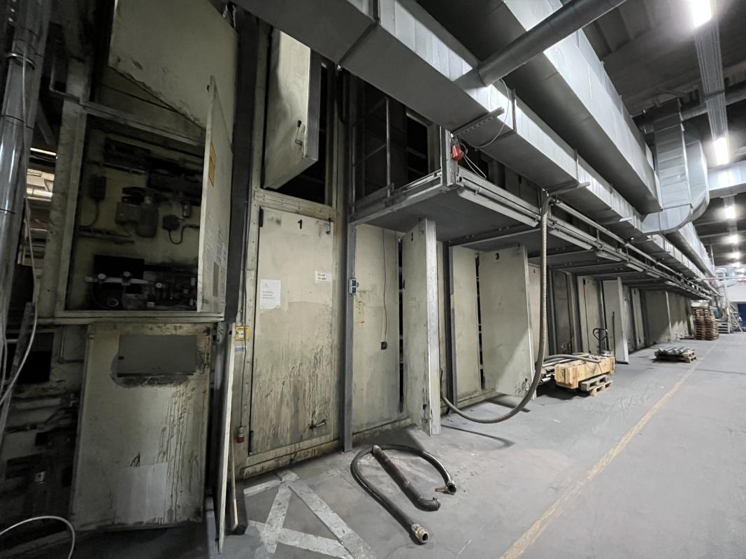 Fabrikat: SCHOTT & MEISSNER, Baujahr: 1997, best. aus: Steigdockentwickler, Bj. 1997, Ser.-Nr. 291, Druckwerk, Bj. 1997, Aufwickeleinheit, Vliesabwickelgestell, Sprühkabine 2, automatische Sprüheinheit, 4 Sprühdüsen, Airless-Spritzanlage, Fabr. Wagner, Typ Icebreaker, Übergabestrecke, Sprüh-/Flatschstation, Streukabine 1, Überströmtrockenofen, 4 Etagen, Bj. 1997, Sattdampf 9 bar, Ex-Ausführung, Gesamtlänge ca. 38 m, Streukabine 2, Vlies-Sprühanlage 2, Umlenkeinheit, Airless-Spritzanlage, 4 Sprühdüsen, Stempelmaschine, Bj. 1997,