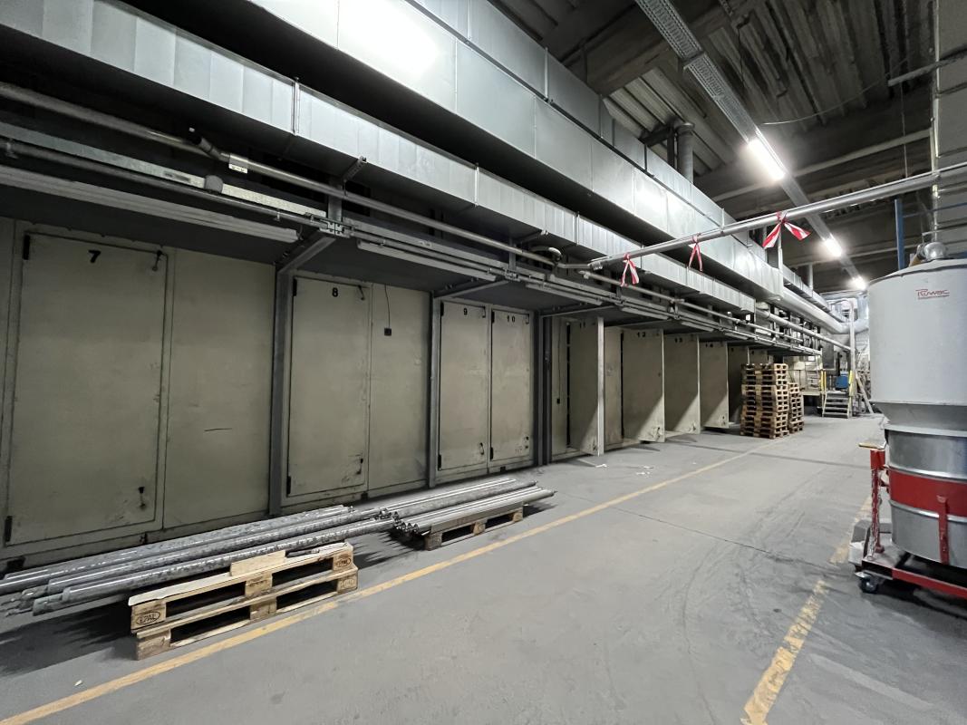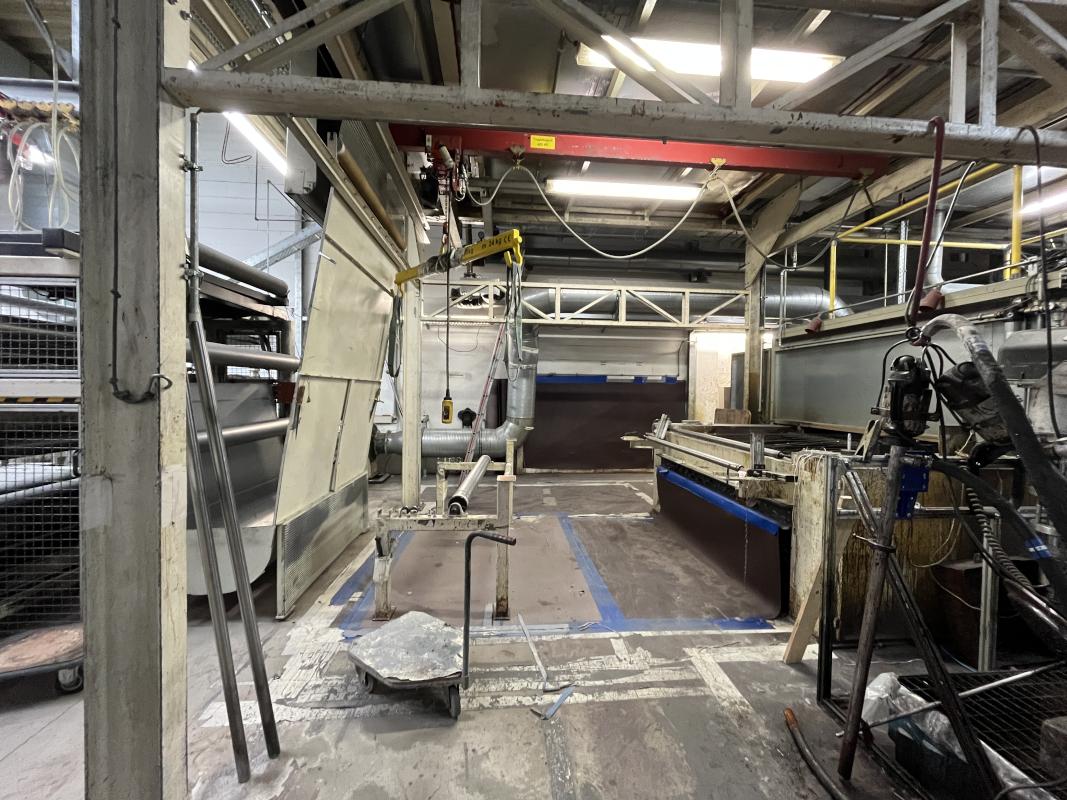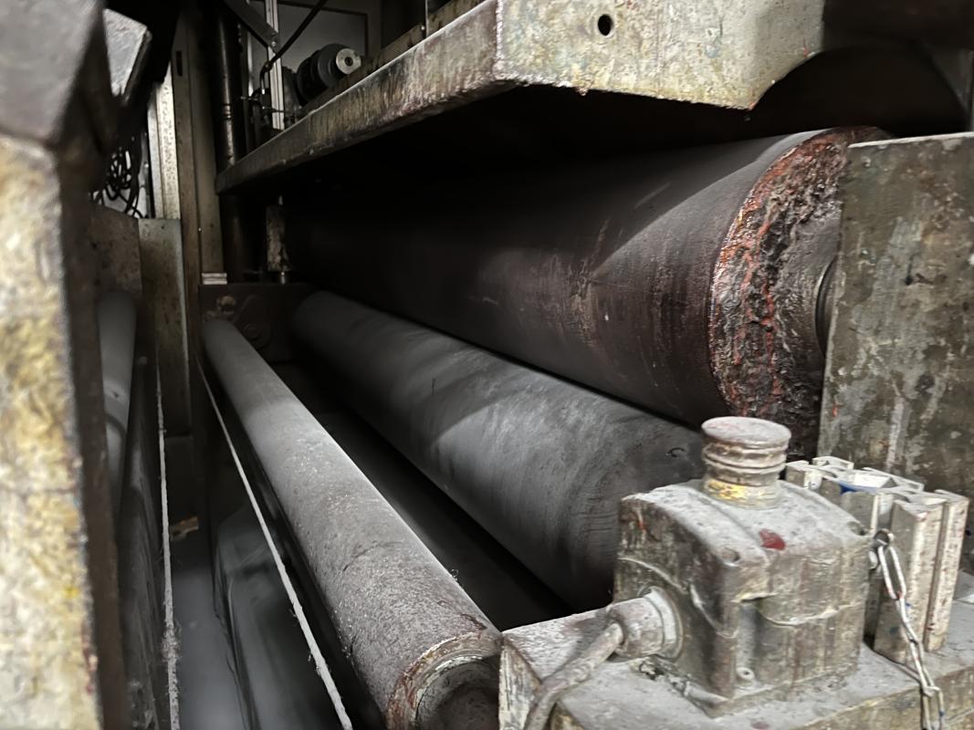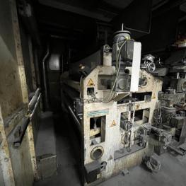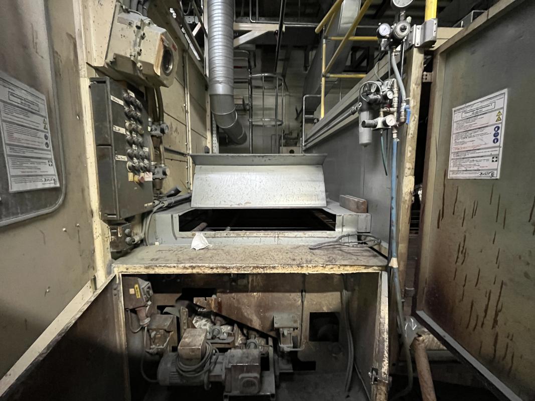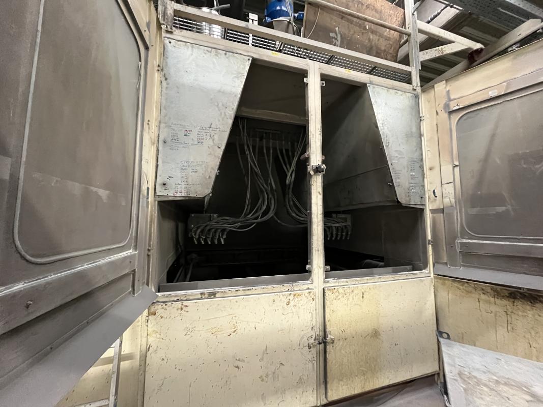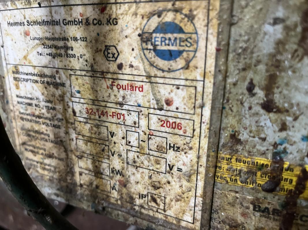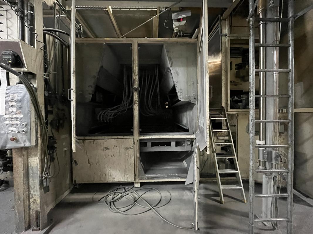 Fabrikat: SCHOTT & MEISSNER, Baujahr: 1997, best. aus: Steigdockentwickler, Bj. 1997, Ser.-Nr. 291, Druckwerk, Bj. 1997, Aufwickeleinheit, Vliesabwickelgestell, Sprühkabine 2, automatische Sprüheinheit, 4 Sprühdüsen, Airless-Spritzanlage, Fabr. Wagner, Typ Icebreaker, Übergabestrecke, Sprüh-/Flatschstation, Streukabine 1, Überströmtrockenofen, 4 Etagen, Bj. 1997, Sattdampf 9 bar, Ex-Ausführung, Gesamtlänge ca. 38 m, Streukabine 2, Vlies-Sprühanlage 2, Umlenkeinheit, Airless-Spritzanlage, 4 Sprühdüsen, Stempelmaschine, Bj. 1997,