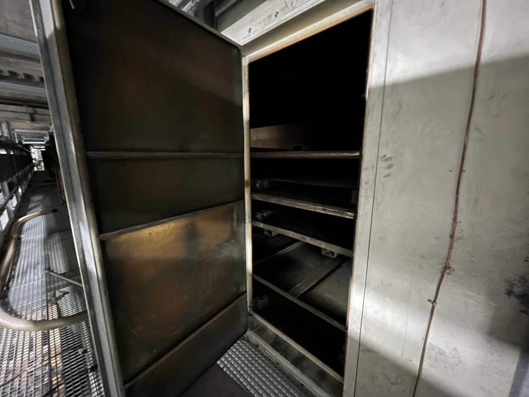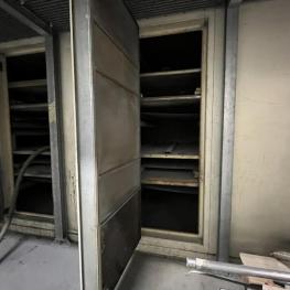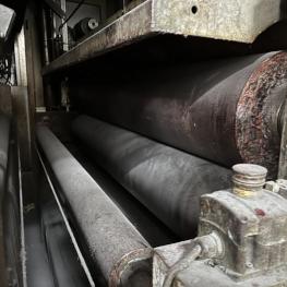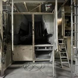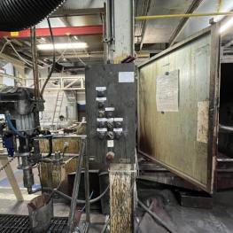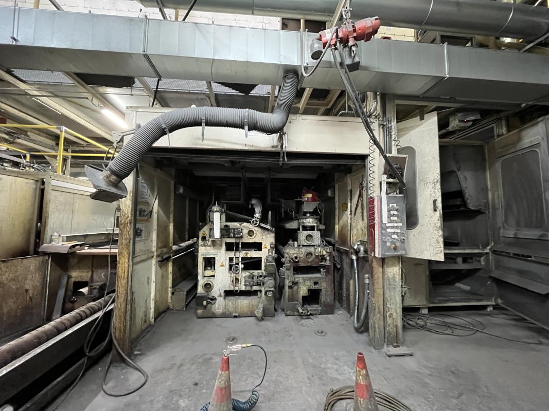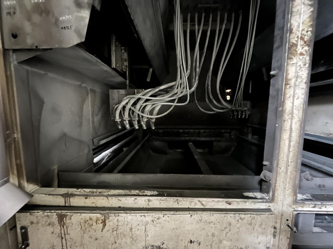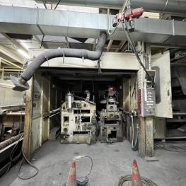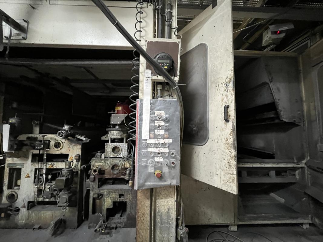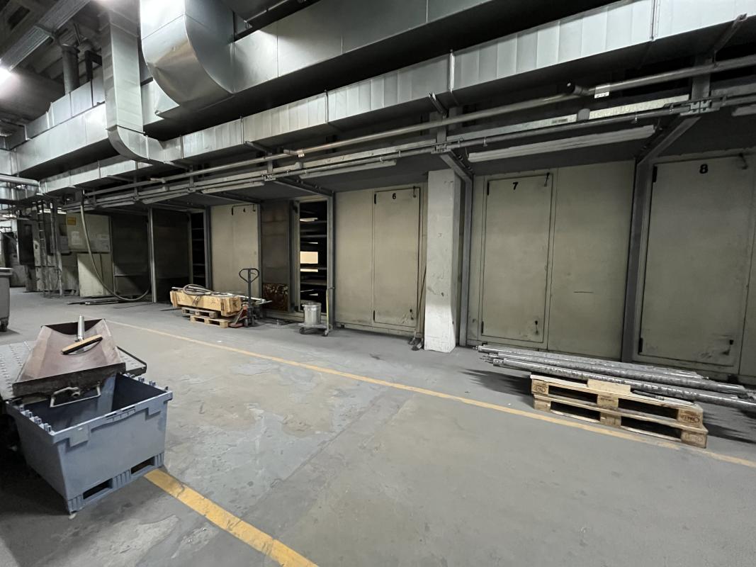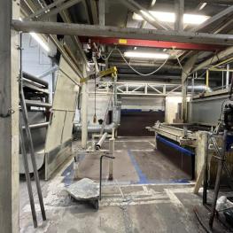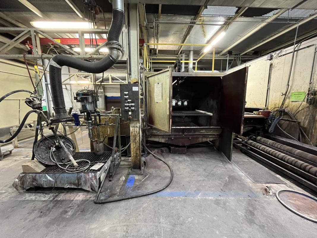 Fabrikat: SCHOTT & MEISSNER, Baujahr: 1997, best. aus: Steigdockentwickler, Bj. 1997, Ser.-Nr. 291, Druckwerk, Bj. 1997, Aufwickeleinheit, Vliesabwickelgestell, Sprühkabine 2, automatische Sprüheinheit, 4 Sprühdüsen, Airless-Spritzanlage, Fabr. Wagner, Typ Icebreaker, Übergabestrecke, Sprüh-/Flatschstation, Streukabine 1, Überströmtrockenofen, 4 Etagen, Bj. 1997, Sattdampf 9 bar, Ex-Ausführung, Gesamtlänge ca. 38 m, Streukabine 2, Vlies-Sprühanlage 2, Umlenkeinheit, Airless-Spritzanlage, 4 Sprühdüsen, Stempelmaschine, Bj. 1997,