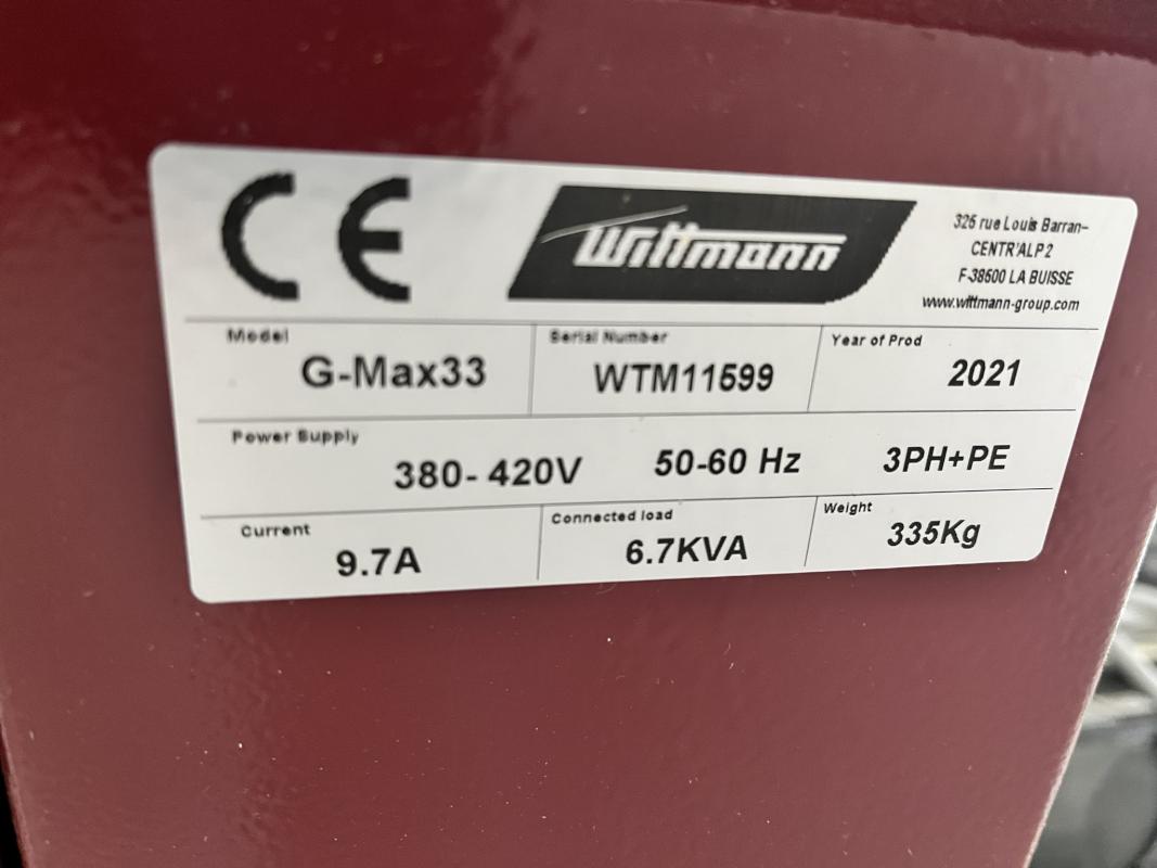 Fabrikat: WITTMANN, Typ: G-Max 33, Baujahr: 2021, Serien-Nr.: WTM11599, Ser.-Nr. WTM11599, Mahlkammer 460 x 235 mm, versetzte Hybridmesser, 9 Klingen, Leistung 4 kW, Rotor-Ø 220 mm, Mahlgutbehälter 16 l, Steuerschrank