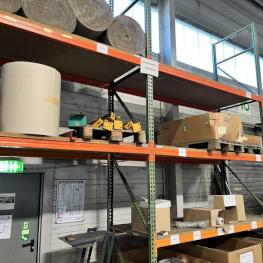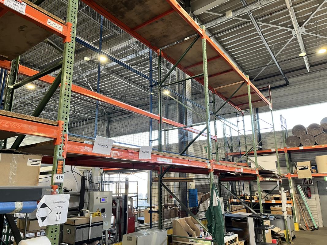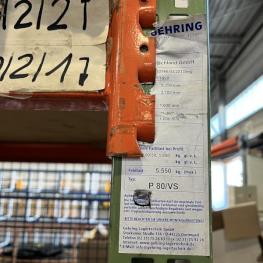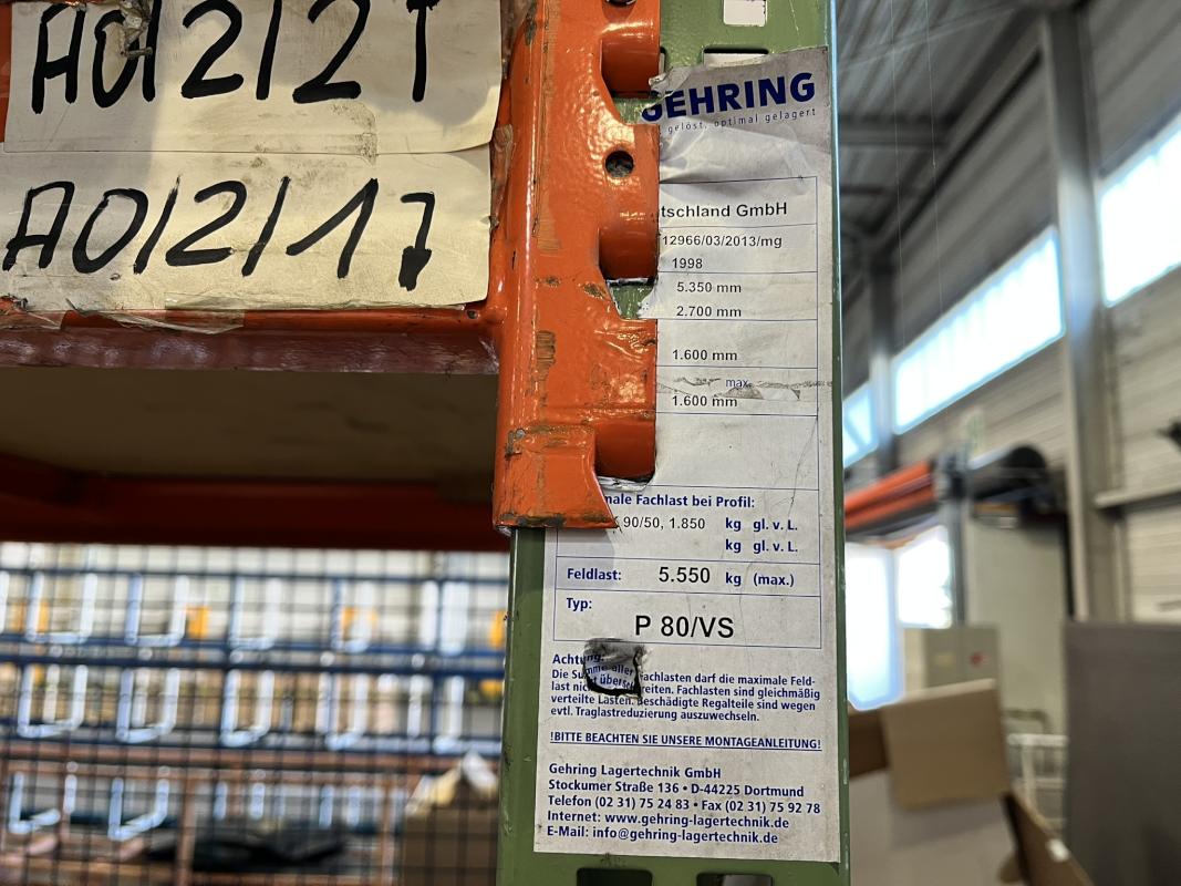 Fabrikat: GEHRING, Typ: P80/VS, Baujahr: 1998/1995, best. aus: 8 Elemente, je B 2.700 mm, T 1.100 mm, H ca. 8.000 mm, 8 Elemente, Feldlast max. 5.550 Fachlast 1.850 kg, ohne Inhalt
