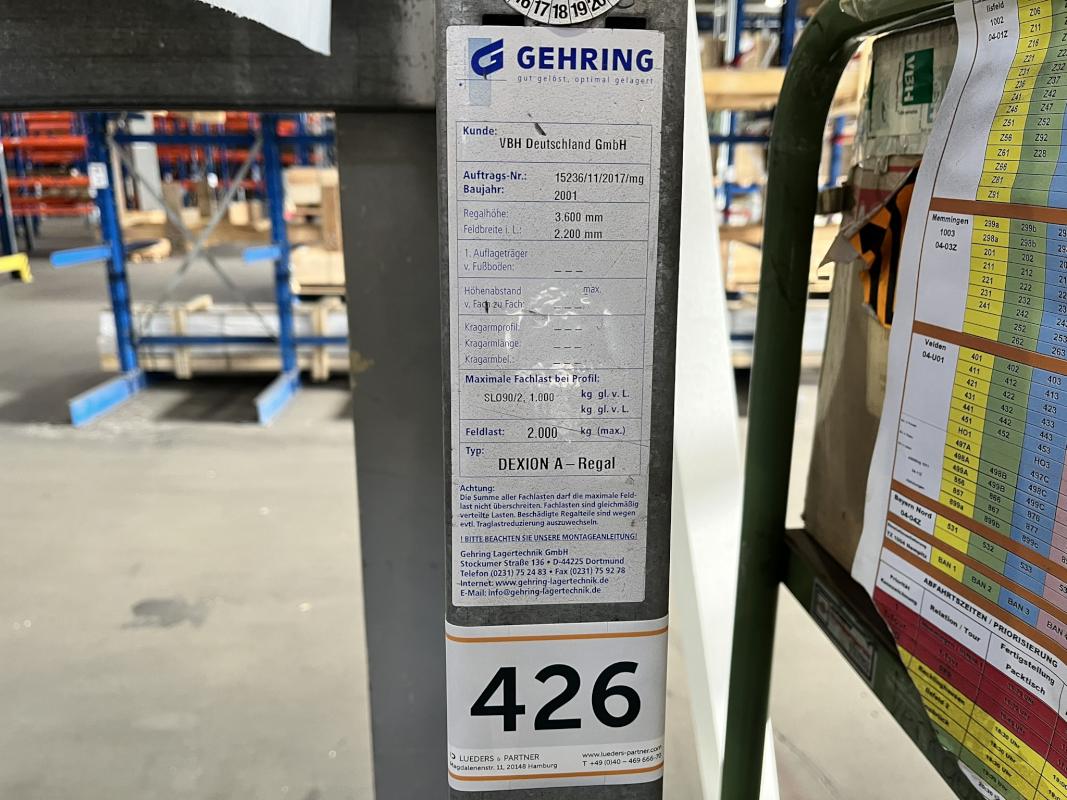 Fabrikat: GEHRING, Typ: Dexion A-Regal, Baujahr: 2001, Feldlast 2.000 kg, Regalhöhe 3.600 mm, Feldbreite 2.200 mm, ohne Inhalt