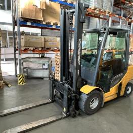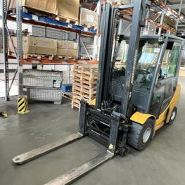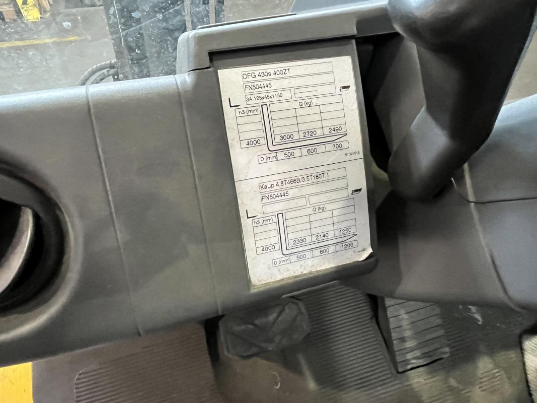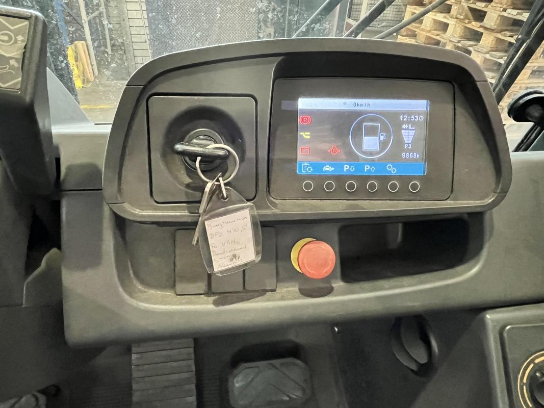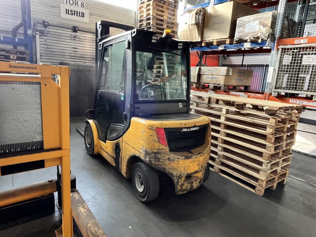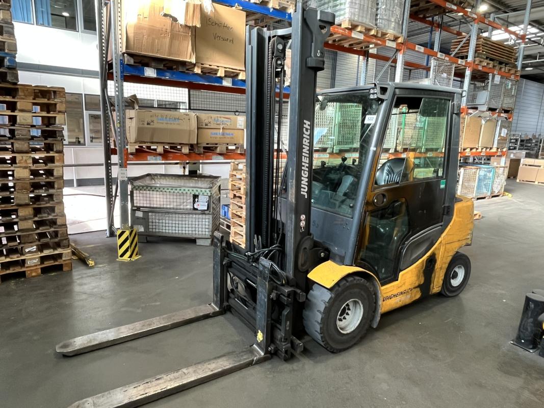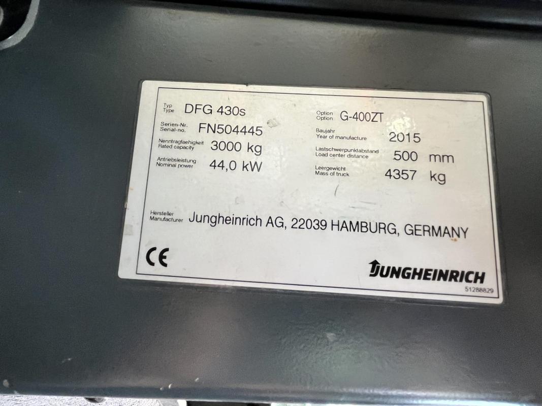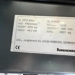 Fabrikat: JUNGHEINRICH, Typ: DFG 430s G-400ZT, Baujahr: 2015, Ser.-Nr. FN504445, Tragfähigkeit max. 3.000 kg, Duplexmast, Hubhöhe max. 4.000 mm, hydraulischer Seitenschieber, Betr.-Std.: ca. 9.868h